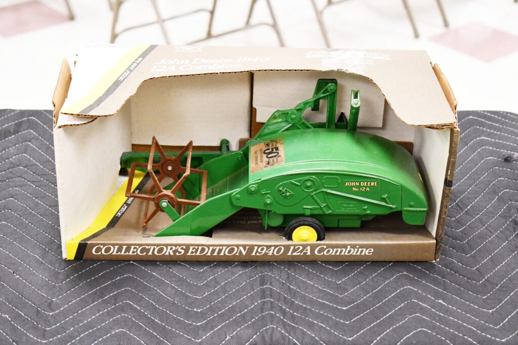 Collectible Toys: Ertl John Deere 1940 12A Combine, Ertl John Deere 8200 Tractor, Metal John Deere Wagon, Miniature John Deere Model “E” Engine, Cast Iron Horse Drawn Carriages, Vintage Tin and Metal Toy Cars and Trucks, Model Airplanes, Large Model Kit Wooden Ship, German Cast Iron Pull Toy Elephant, and Other