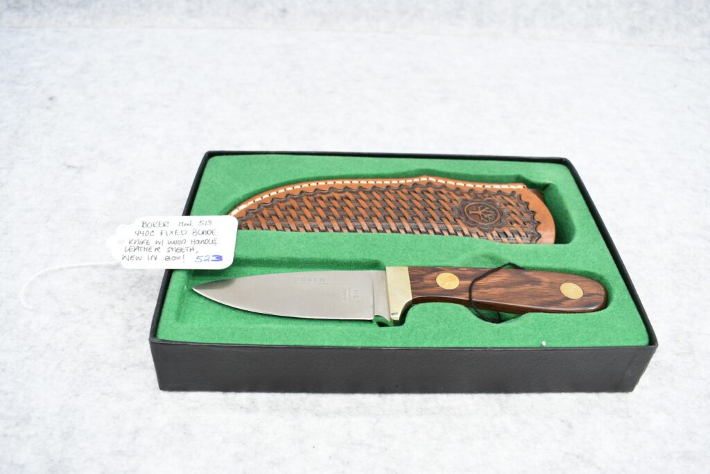 523. Boker – Mod. 513 440C Fixed Blade Knife – w/Wood Handle – w/Leather Sheath – New in Box!