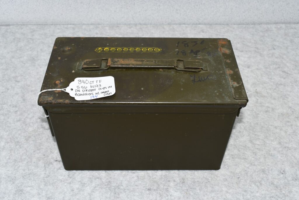 194. 840-Count of Factory Full 5.56 M193 Ammunition on Stripper Clips in Bandoliers in Ammo Can