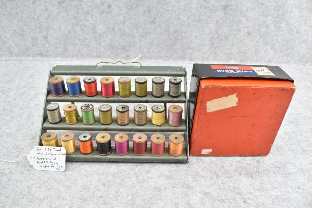 230. Metal 3-Tier Thread Holder w/24 Spools of Thread & Newton 44lb. Test Braided Trolling Line in Original Box