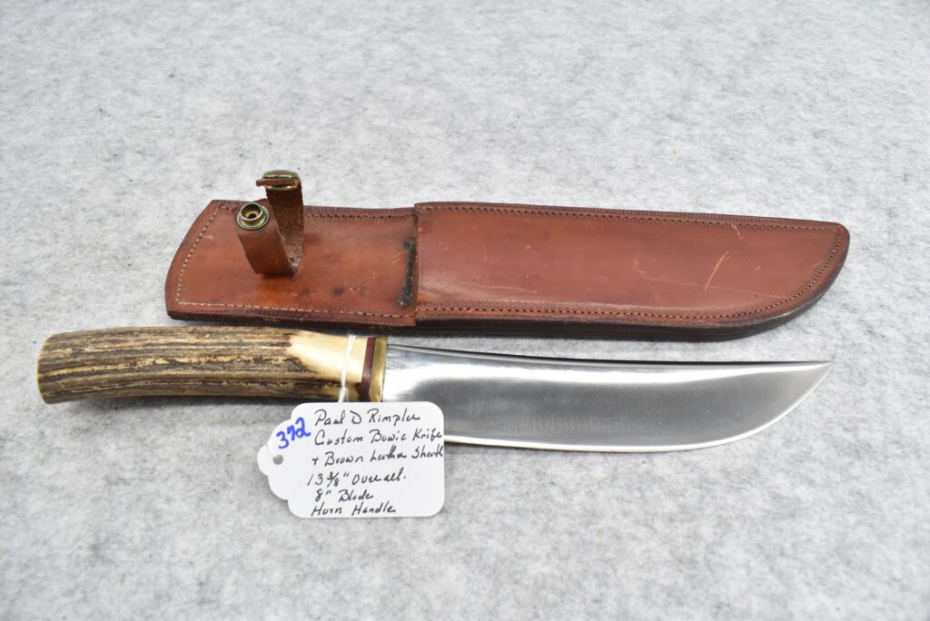 371. Paul D. Rimpler – Custom Bowie Horn Handle Knife – w/8 1/8” Blade – 13 3/8” Overall Length – w/Brown Leather Sheath