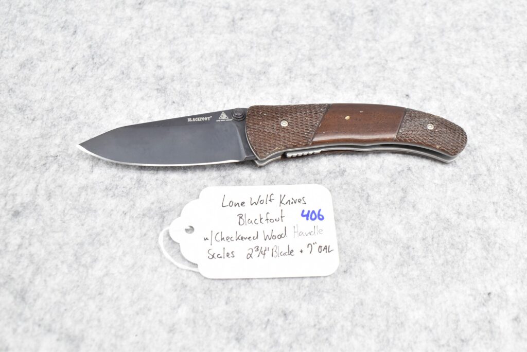406.     Lone Wolf Knives – Blackfoot Folding Knife – w/2 ¾” Blade – 7” Overall Length – w/Checkered Wood Handle