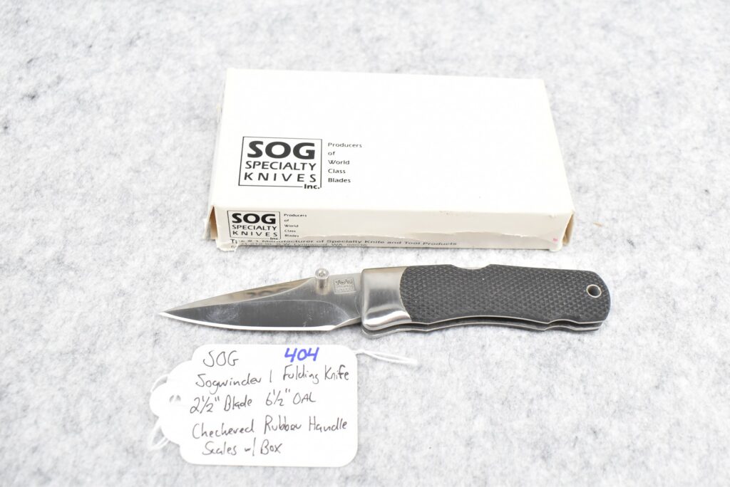 404. SOG – Sogwinder 1 Folding Knife – w/2 ½” Blade – 6 ½” Overall Length – w/Checkered Rubber Handle Scales – w/Box