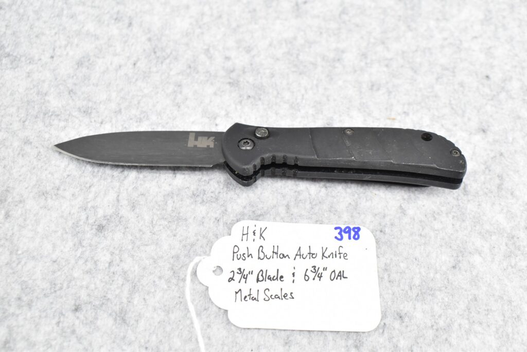 398.     H&K – Push Button Auto Knife – w/2 ¾” Blade – 6 ¾” Overall Length – w/Metal Scales