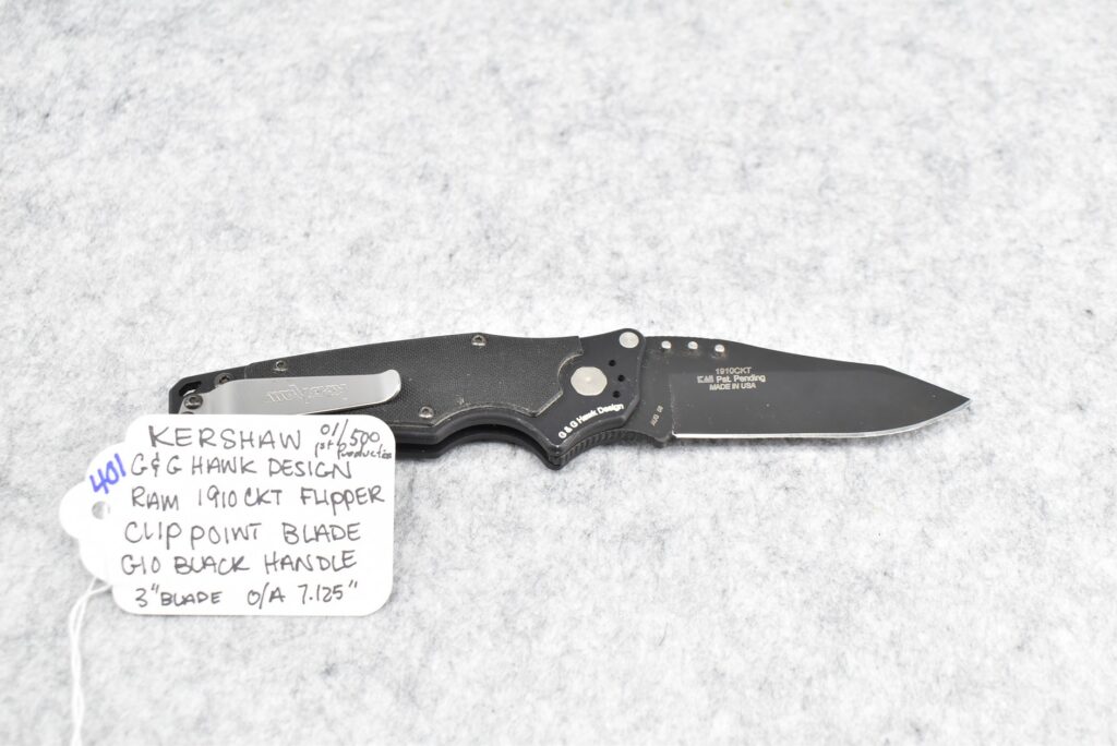 401.     Kershaw – G&G Hawk Design Ram 1910 CKT Flipper Folding Knife – 01/500 First Production – w/3” Clip Point...