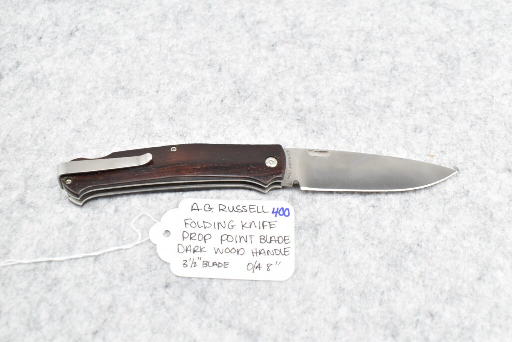 400.     A.G. Russel – Folding Knife – w/3 ½” Drop Point Blade – 8” Overall Length – w/Dark Wood Handle