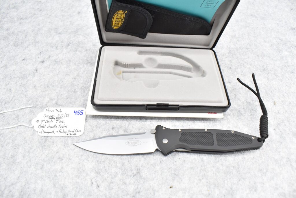 455. Micro-Tech – Socom #10/98 Folding Knife – w/4” Blade – 9” Overall Length – w/Metal Scales Handle – w/Lanyard – w/Factory Hard Case & Sheath