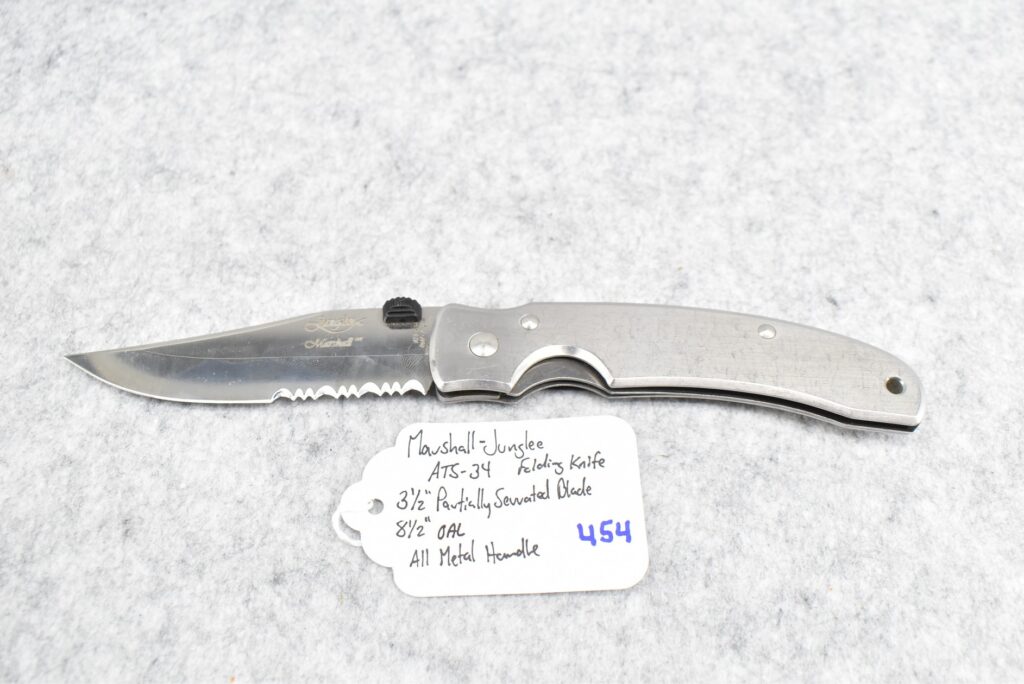 454. Marshall-Junglee – ATS-34 Folding Knife – w/3 ½” Partially Serrated Blade – 8 ½” Overall Length – w/All Metal Handle
