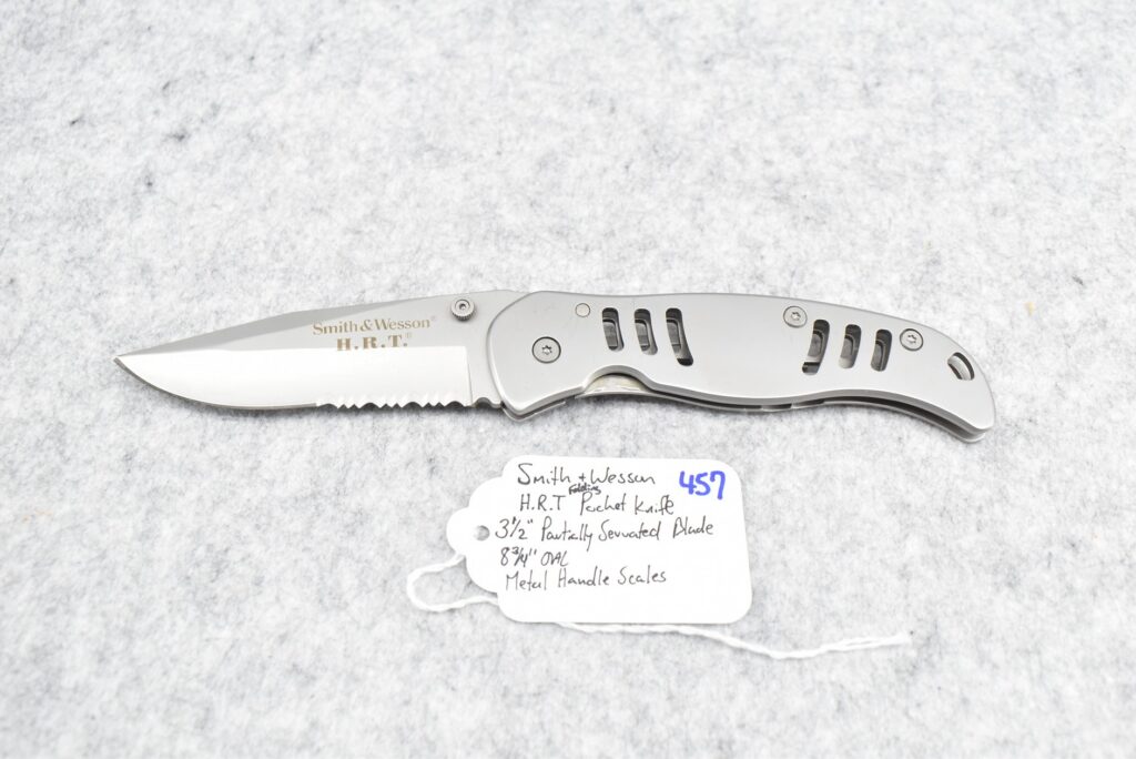 457. Smith & Wesson – H.R.T. Folding Pocket Knife – w/3 ½” Partially Serrated Blade – 8 ¾” Overall Length – w/Metal Handle Scales