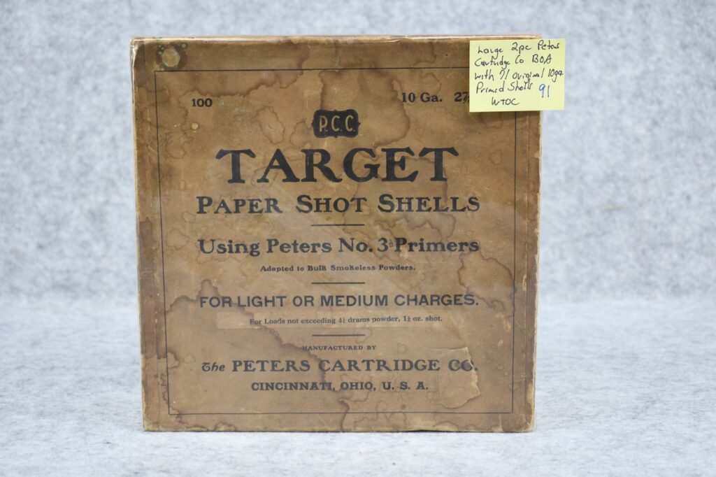 91. Large 2pc. Peters Cartridge Co. BOA w/71 Original 10ga. Primed Shells – WTOC