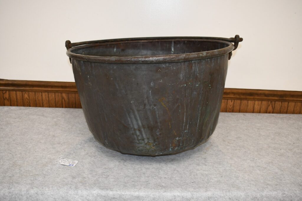 219. Large Copper Apple Butter Kettle w/Cast Iron Handle – Kettle is 16” High x 26” Wide