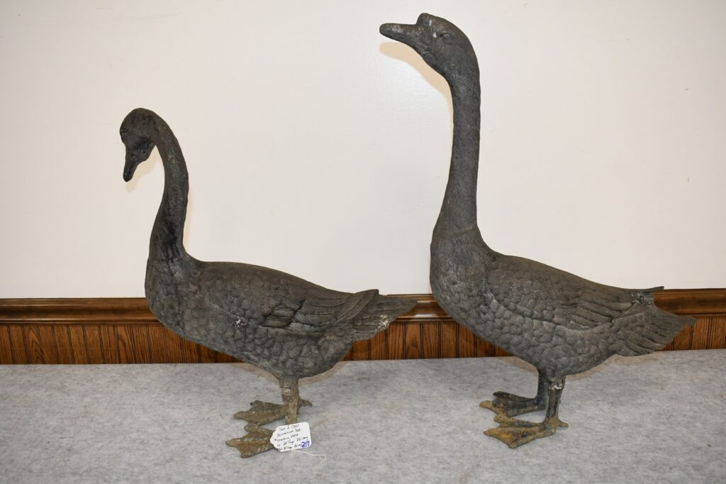 217. Pair of Cast Aluminum Freestanding Geese – Tall One is 28” High x 22” Long – Shorter Goose is...