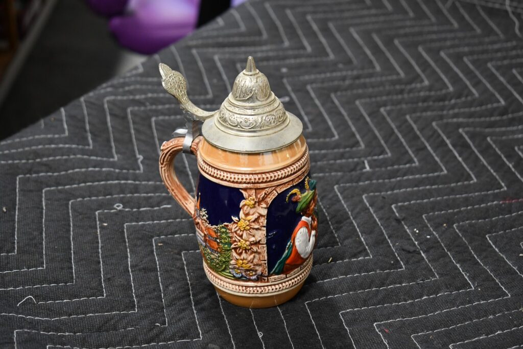 Antiques and Collectibles: Large Amount of Stamps, Holiday Decorations, Modern and Collectible Tools, Sports Cards, Signed Baseballs, Hockey Pucks, Signed Football, Ornate Mantle Clocks, War Bond Posters, Framed Prints and Pictures, Longaberger Basket Bell on Hanging Stand, McCormick Deering Yard Stick, Miniature Tools and Guns, Pottery Crocks and Jugs, Vintage Pink Radio, Miniature Cast Fry Pans, Gettysburg Postcards, Locks with Keys, German Steins, Advertising Calendars and Thermometers, Advertising Tins, Cigarette Advertising Items, Political Pinback Buttons, Wooden Butter Churn, Large Amount of Doilies and Afghans, Ball Caps, Large Amount of Lighters, Belt Buckles, Costume Jewelry, New KitchenAid Mixer and KitchenAid Ice Cream Attachment, Vintage Harmonicas, Cast Figures, Copper and Brass Items, Woodware, Granite and Porcelainware, Lanterns, Ribbons and Medals, Old Photographs, and Other