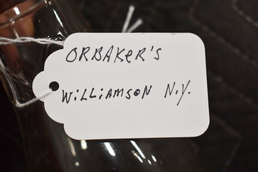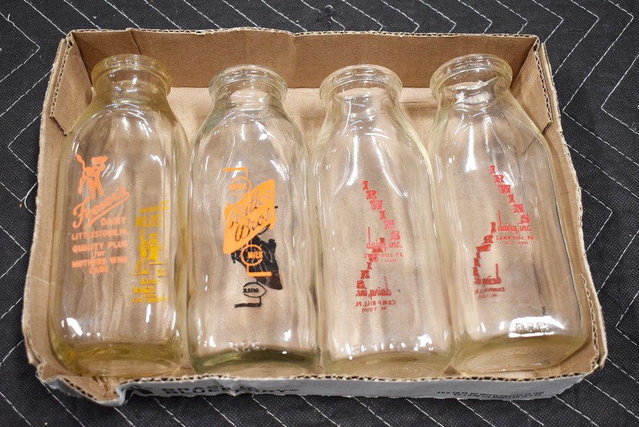 Antique Glassware: Large Amount of Vintage/Collectible Glass Bottles and Jars (Many are Local), (9) Various Glass Cookie Jars, Dietz No. 3 New York Tinted Kero Lamp Shade, 1991 Swarovski “Save Me” Seal Figure, Milk Bottles, Uranium Glass, Milk Glass, Mixing Bowls, Oil Lamps, Oriental China Set, Gibson Christmas Pattern Dinnerware Set for Service of 8, Coca-Cola Bottles in Crates, and Other