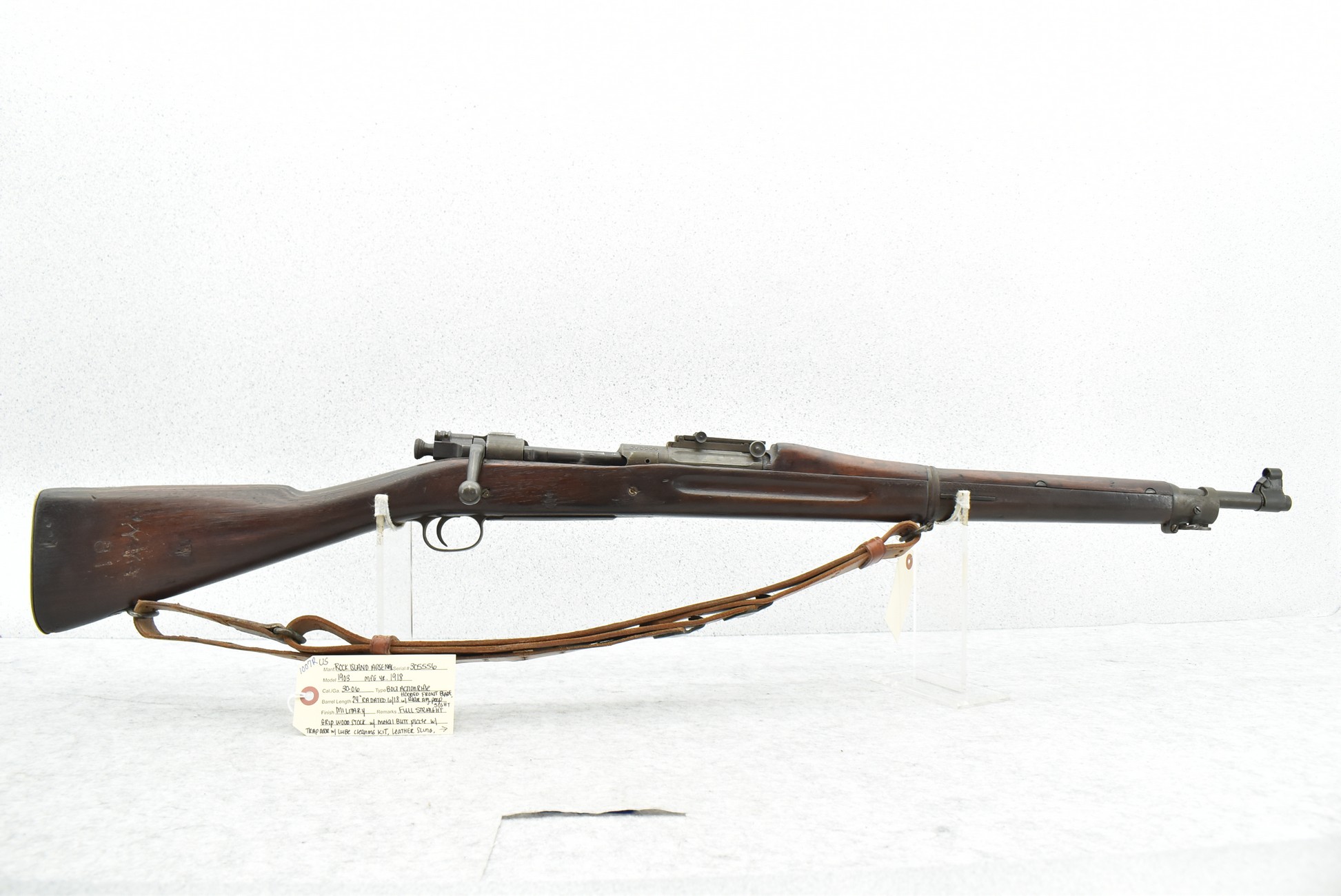 1007R. U.S. Rock Island Arsenal – Mod. 1903 – 30-06 Cal. Bolt Action Rifle – w/24” RA 6-18 Dated Barrel w/Hooded Front Blade & Rear Adj. Peep Sights – Military Finish – w/Full Straight Grip Wood Stock w/Metal Butt Plate w/Trap Door w/Lube Cleaning Kit in Butt – Right Side of Stock Marked “Y.Y.Y. 81” – w/Leather Sling – Mfg. 1918