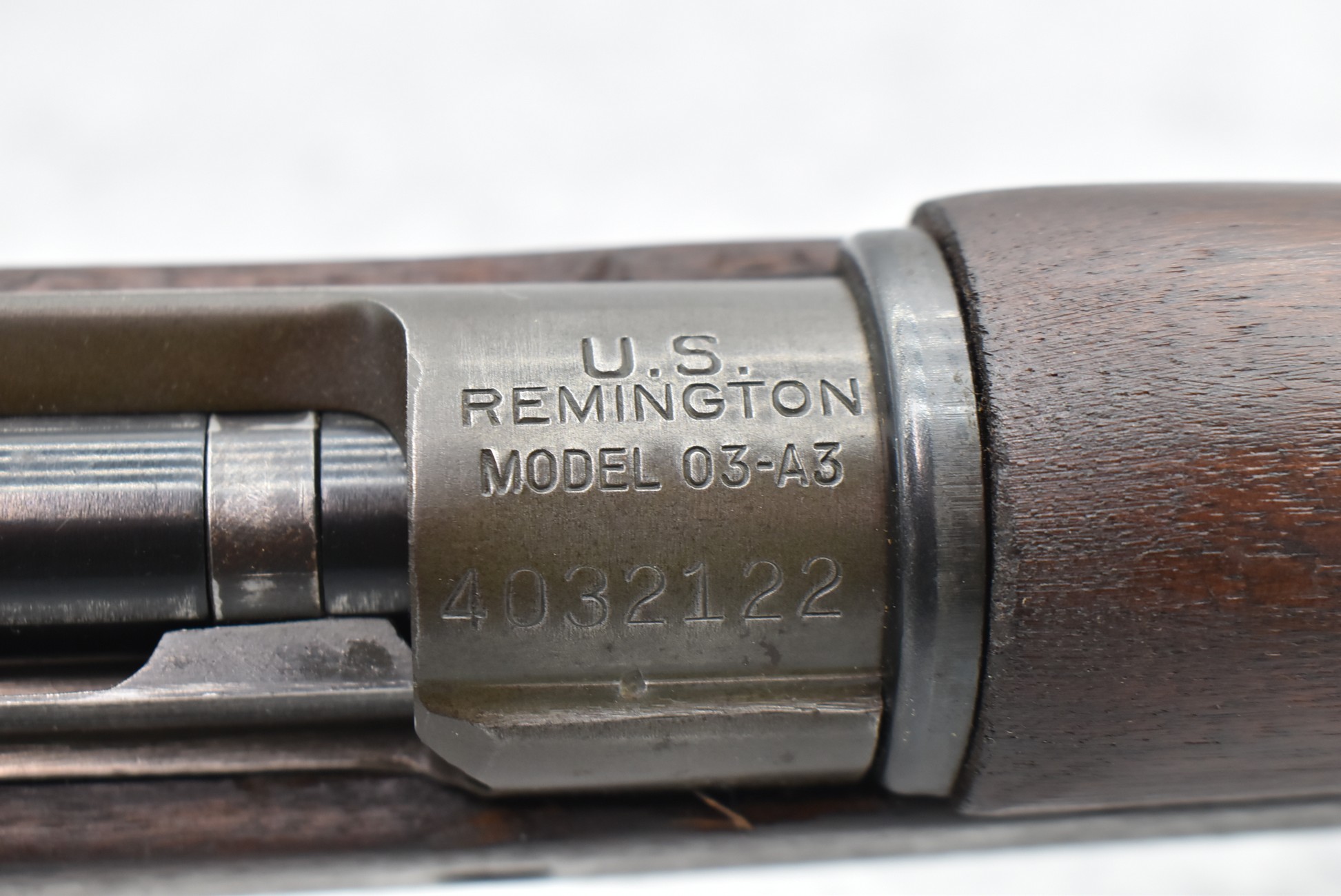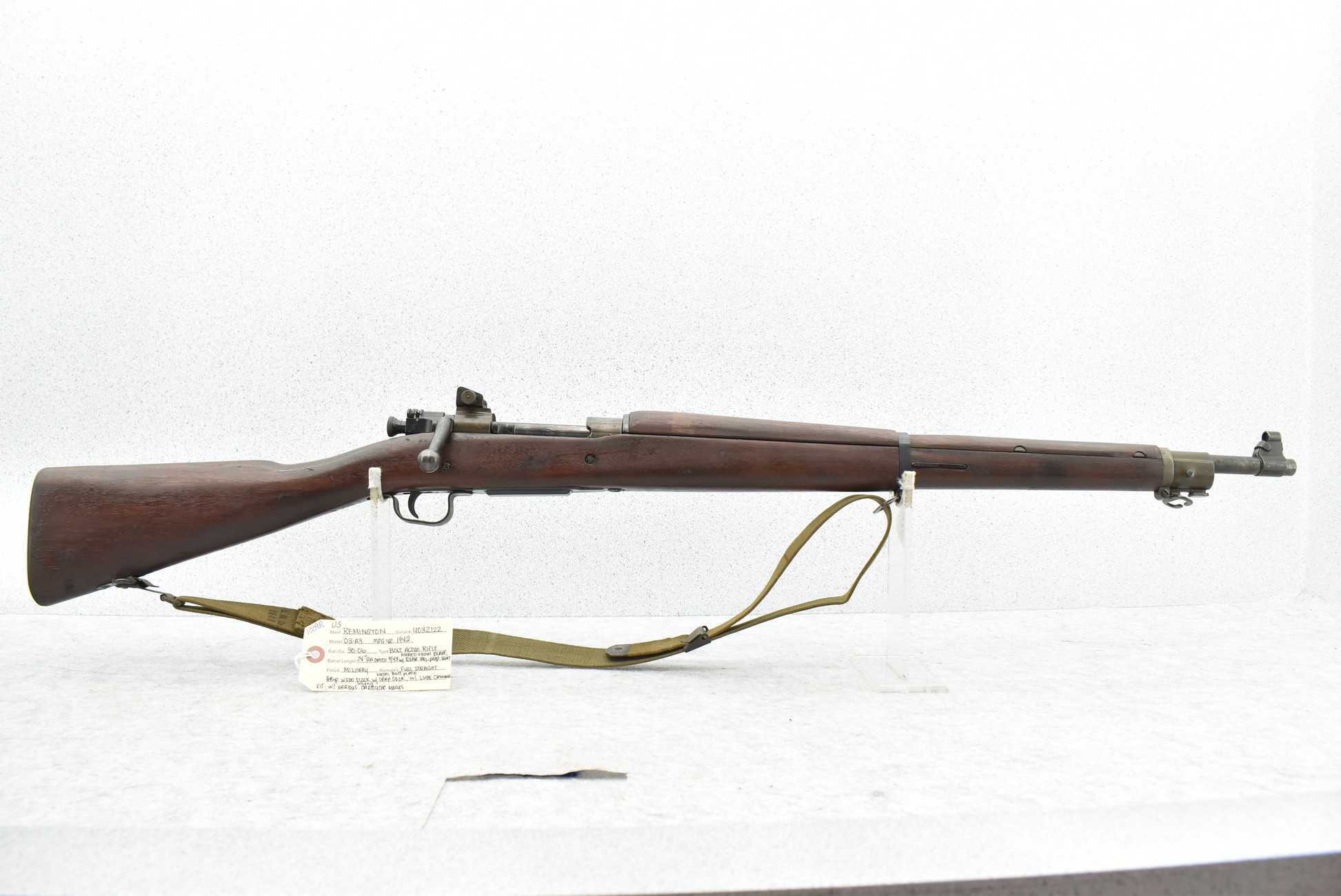 1009R. U.S. Remington – Mod. 03-A3 – 30-06 Cal. Bolt Action Rifle – w/24” RA 9-43 Dated Barrel w/Hooded Front Blade & Rear Adj. Peep Sights – Military Finish – w/Full Straight Grip Wood Stock w/Metal Butt Plate w/Trap Door w/Lube Cleaning Kit in Butt – w/Various Strong Cartouche – Mfg. 1942