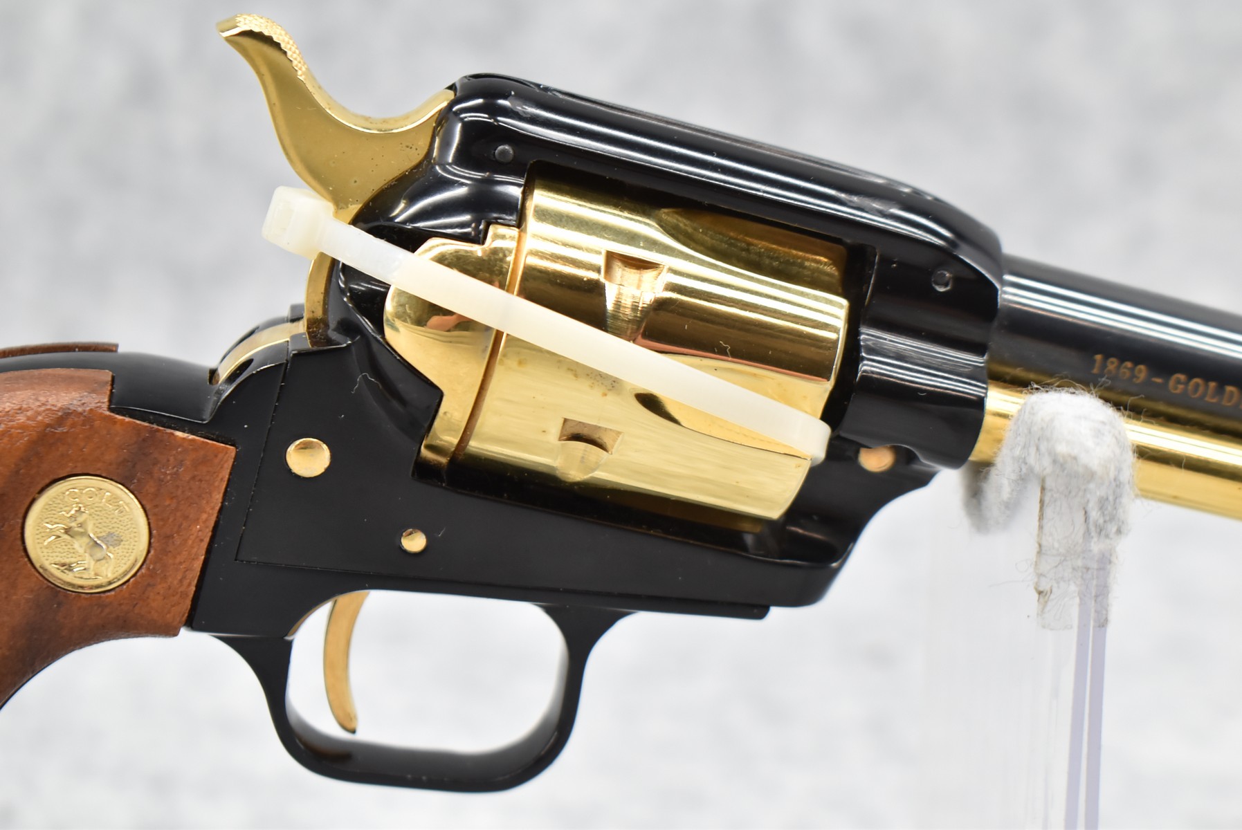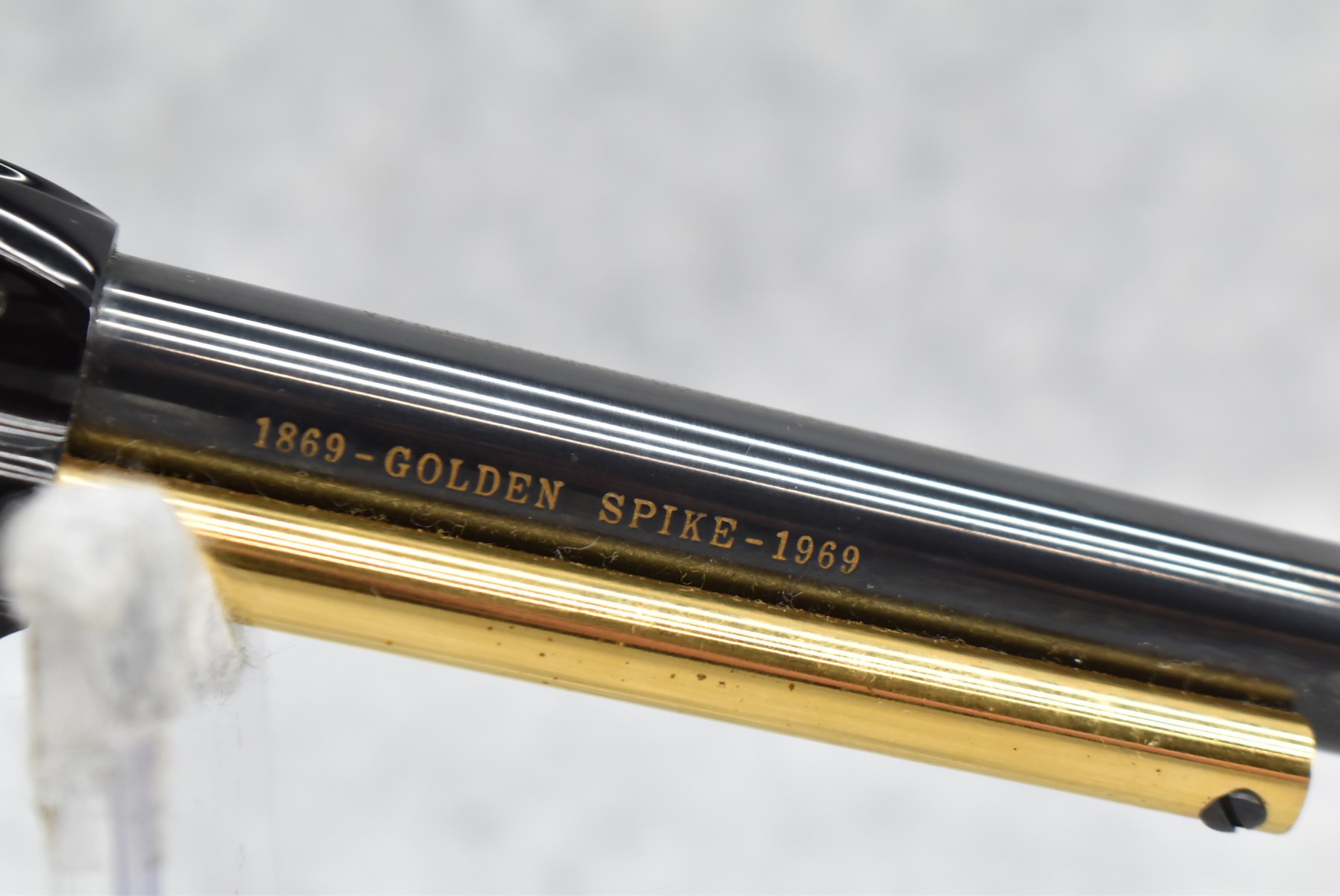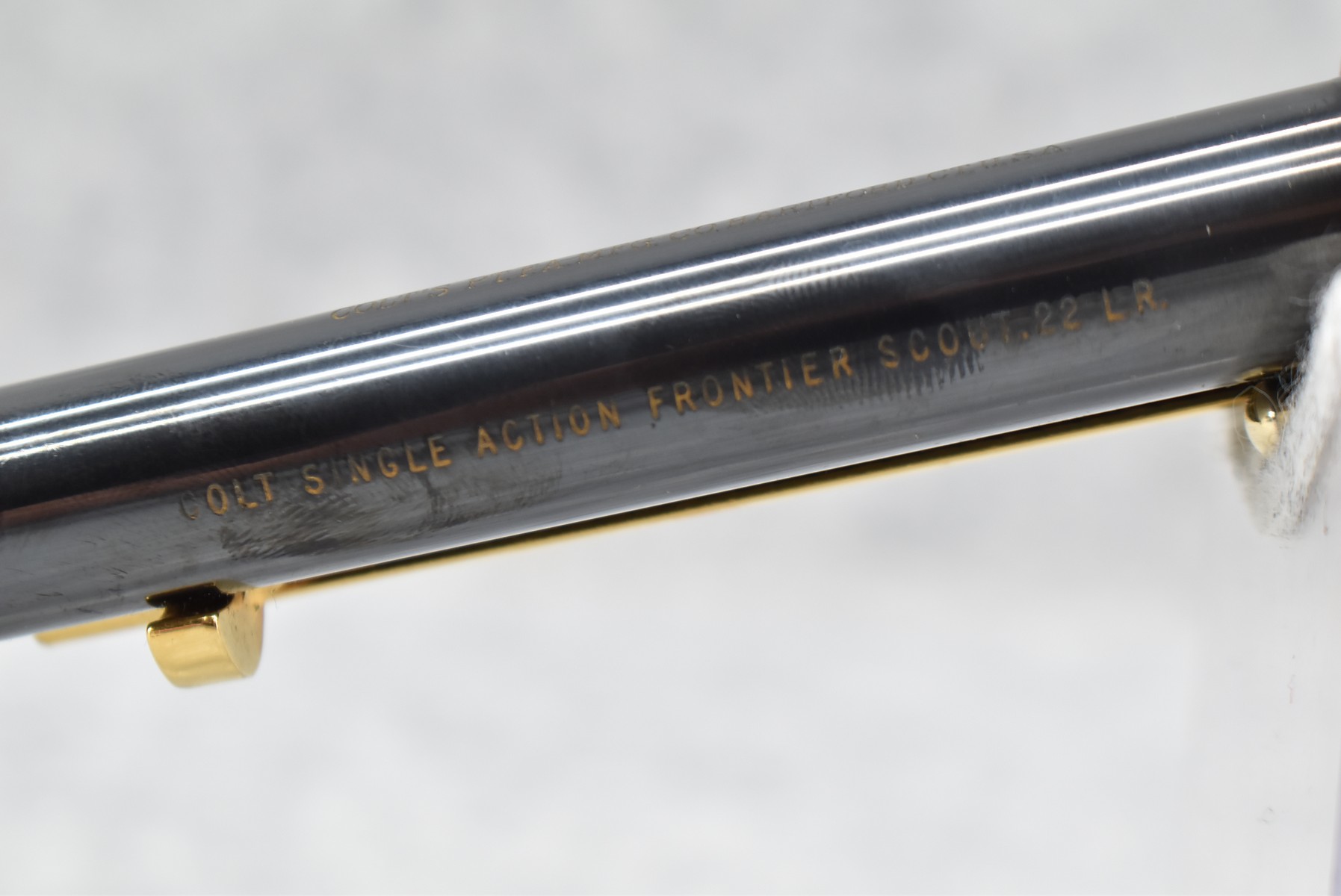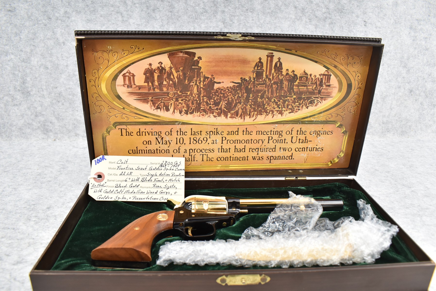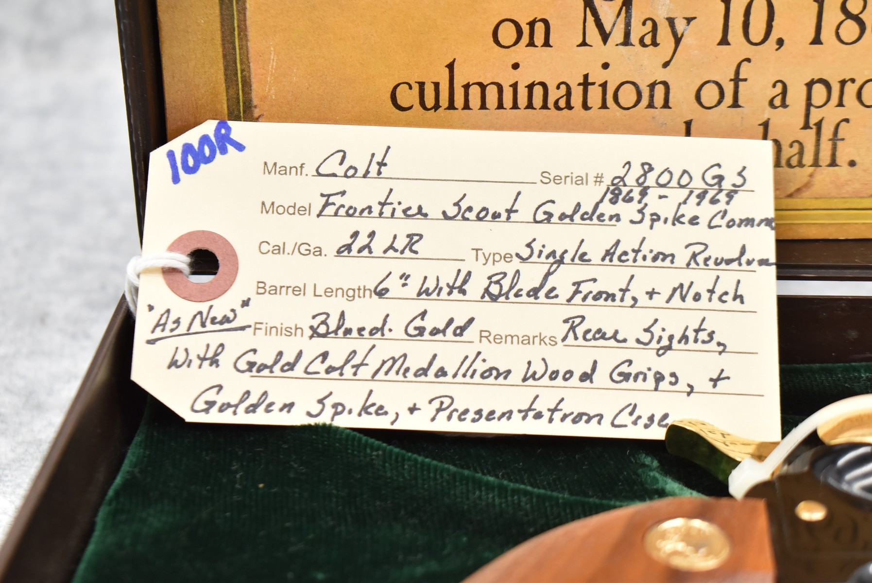 100R. Colt – Mod. Frontier Scout Golden Spike Commemorative – 22LR Cal. Single Action Revolver – w/6” Barrel w/Blade Front and Rear Notch Sights – Blued/Gold Finish – w/Gold Colt Medallion Wood Grips and Golden Spike – As New w/Presentation Case