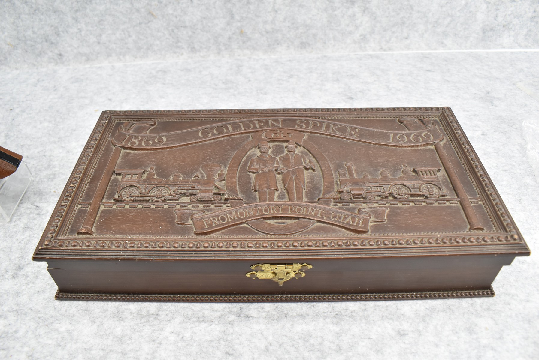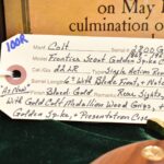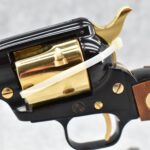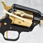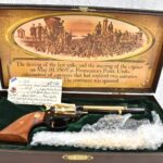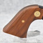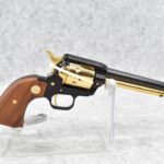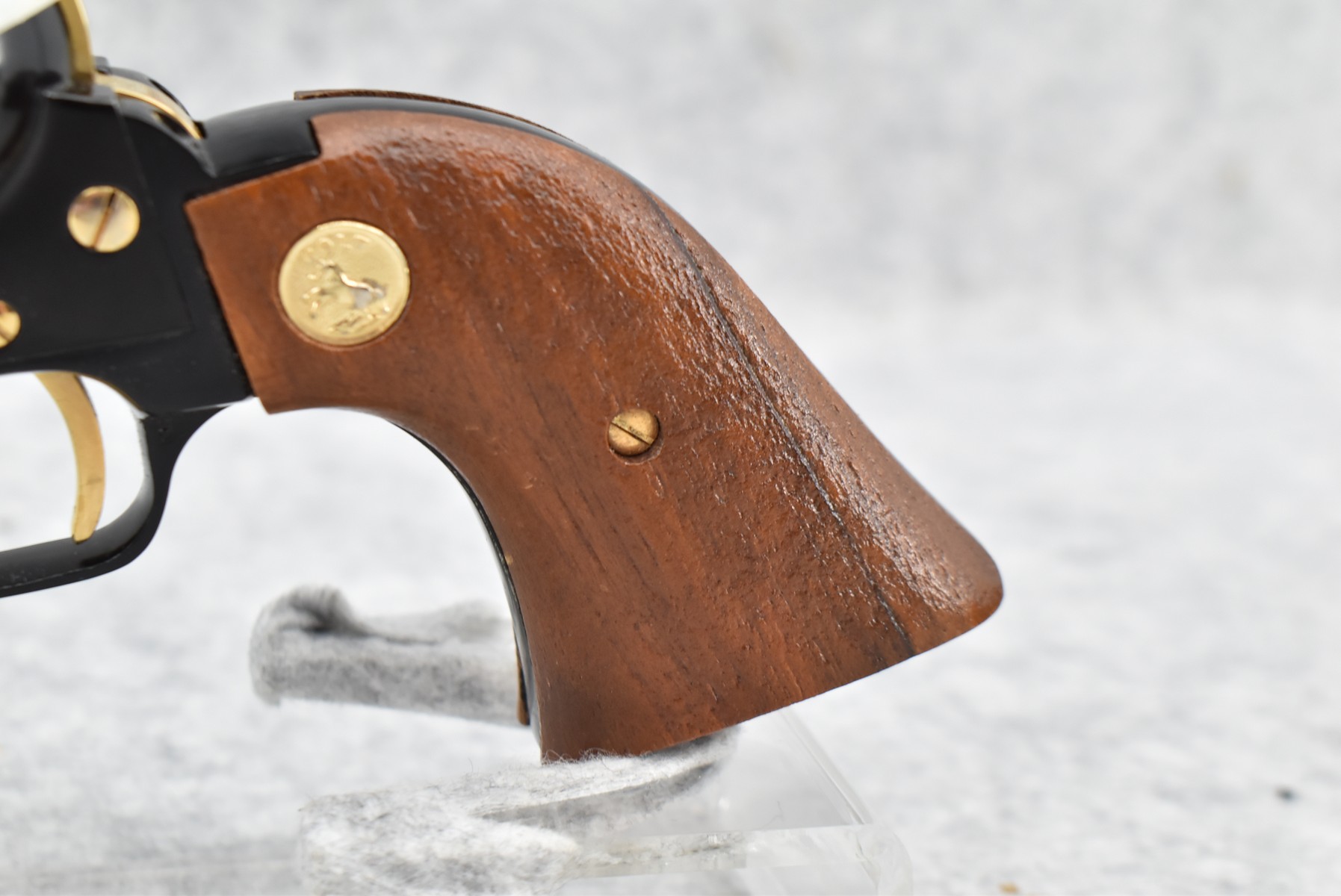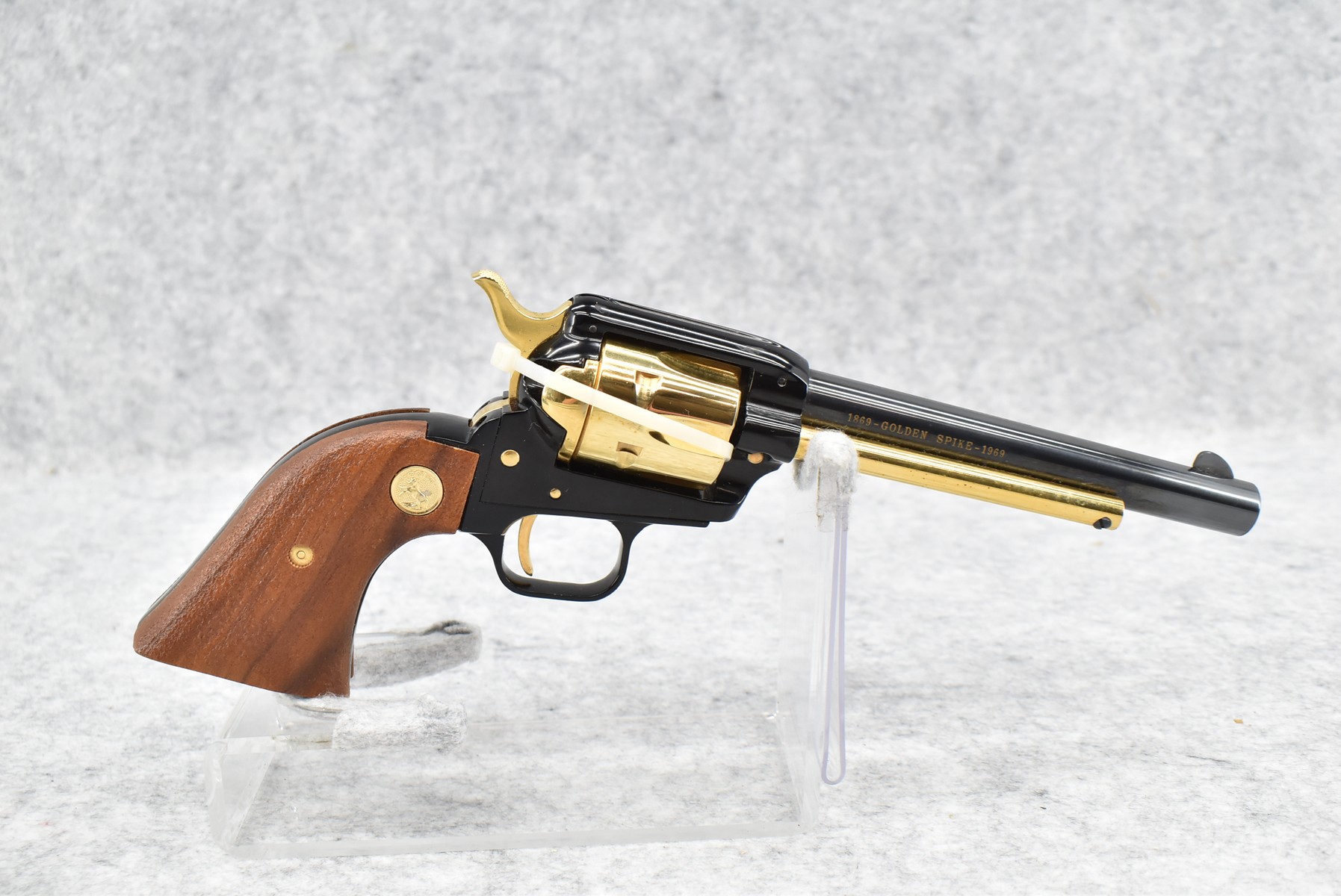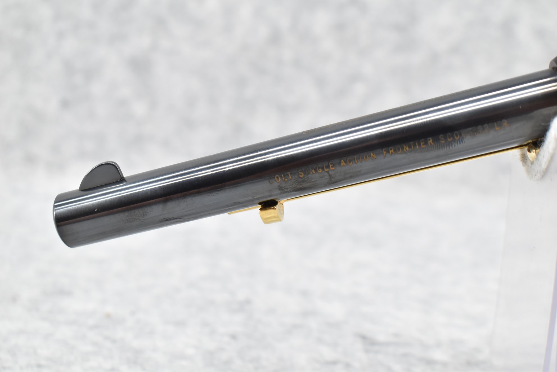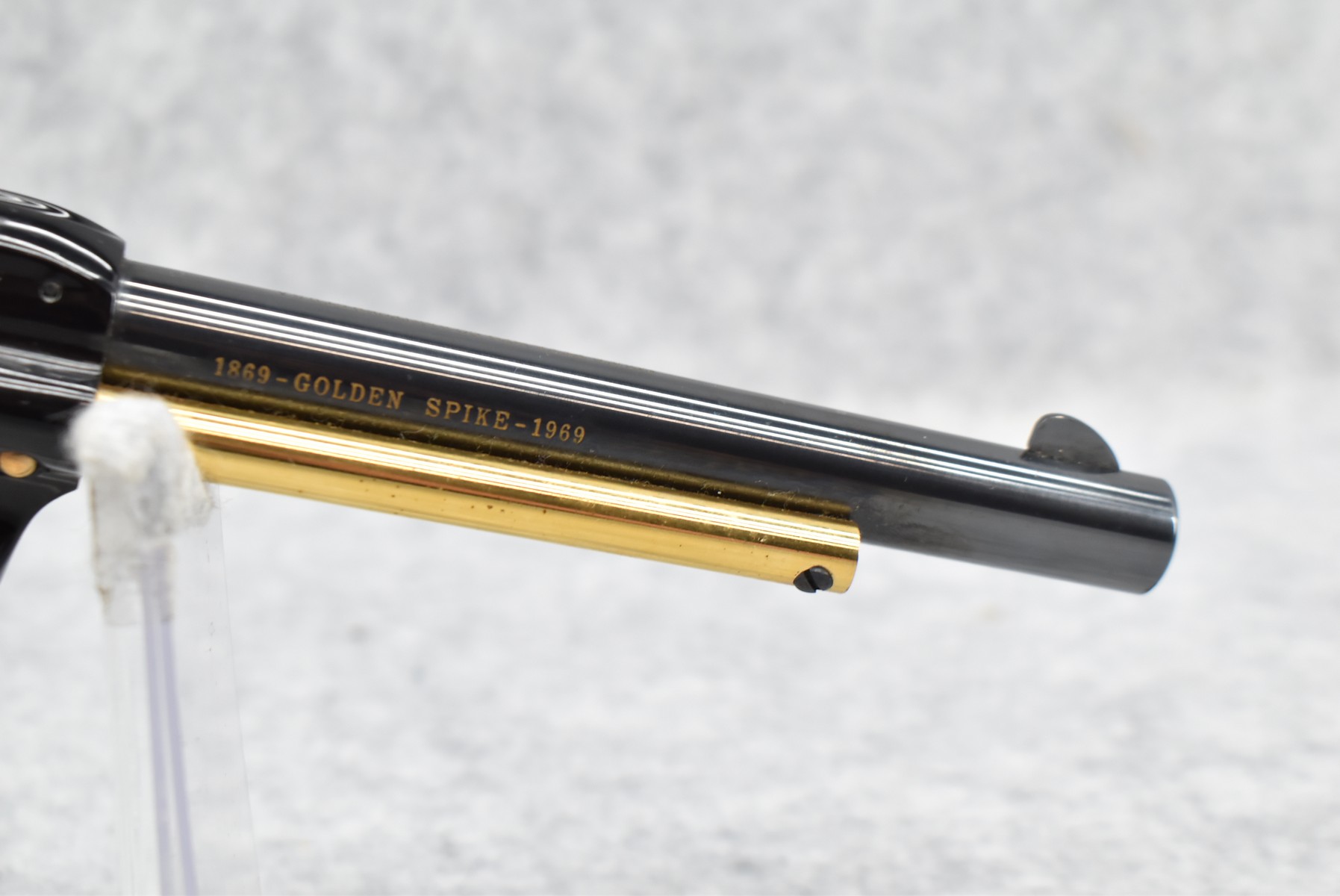 100R. Colt – Mod. Frontier Scout Golden Spike Commemorative – 22LR Cal. Single Action Revolver – w/6” Barrel w/Blade Front and Rear Notch Sights – Blued/Gold Finish – w/Gold Colt Medallion Wood Grips and Golden Spike – As New w/Presentation Case