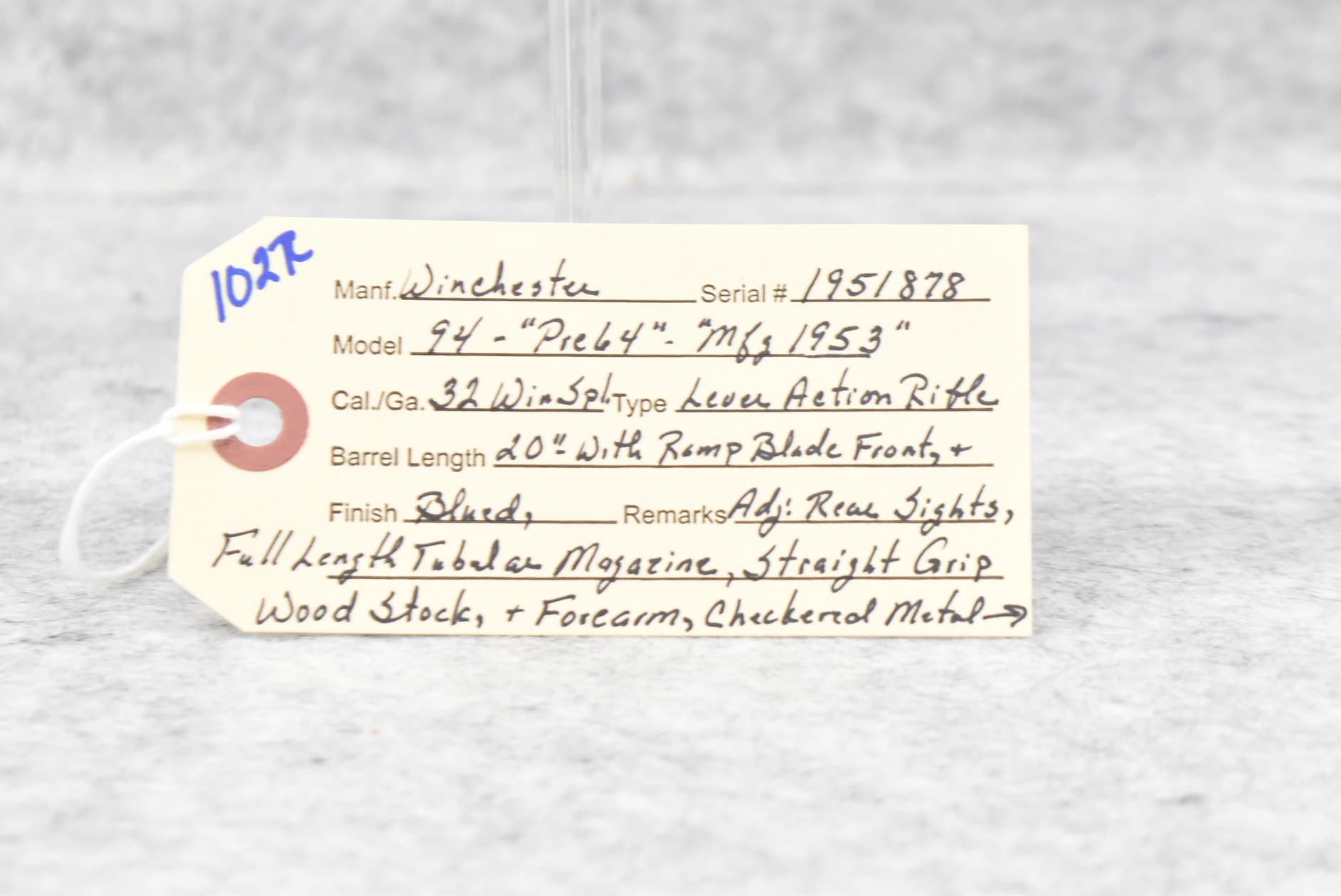 102R. Winchester – Mod. 94 (Pre-64) – 32 Win. Spl. Cal. Lever Action Rifle – w/20” Barrel w/Ramp Blade Front & Adj. Rear Sights w/Full Length Tubular Magazine – Blued Finish – w/Straight Grip Wood Stocks w/Checkered Metal Butt Plate – Mfg. 1953