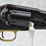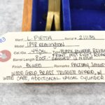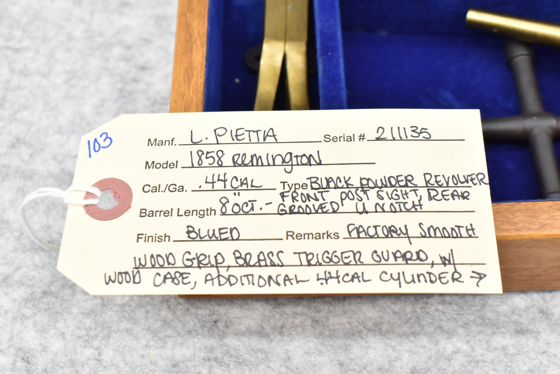 103. L.Pietta – Mod. 1858 Remington – 44 Cal. Black Powder Revolver – w/8” Octagon Barrel w/Front Post Sight & Rear Grooved Notch Sights – Blued Finish – w/Factory Smooth Wood Grip – w/Brass Trigger Guard – w/Wood Case, Additional 44 Cal. Cylinder, Powder Flask, Bullet Mold, Tin & Tool
