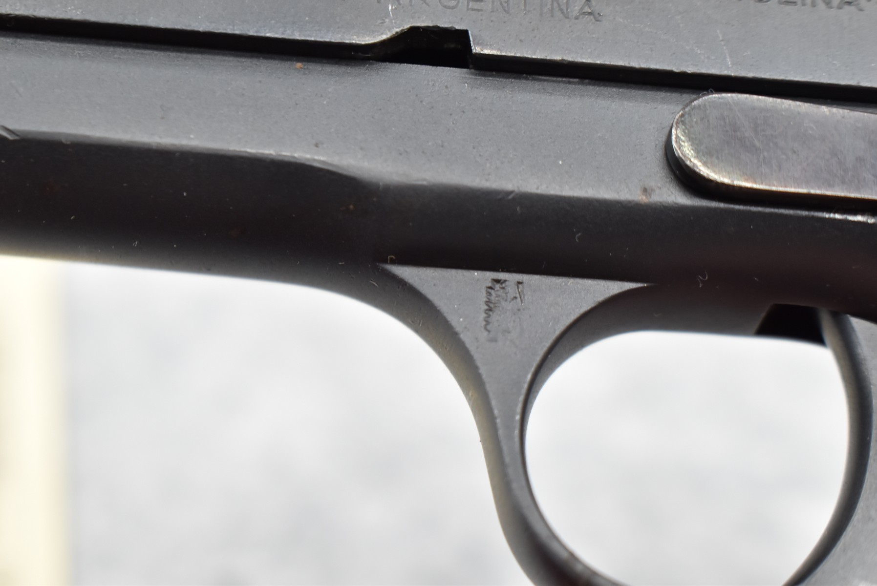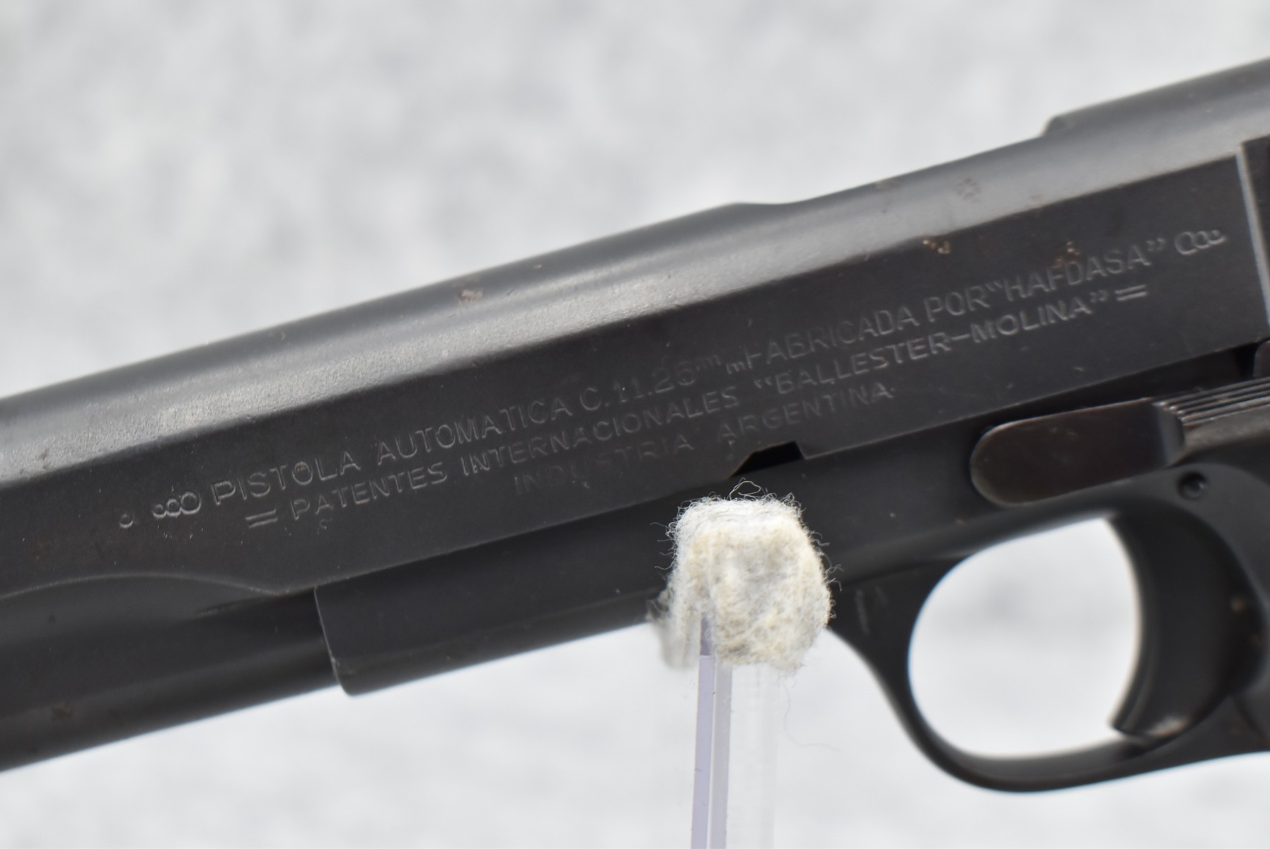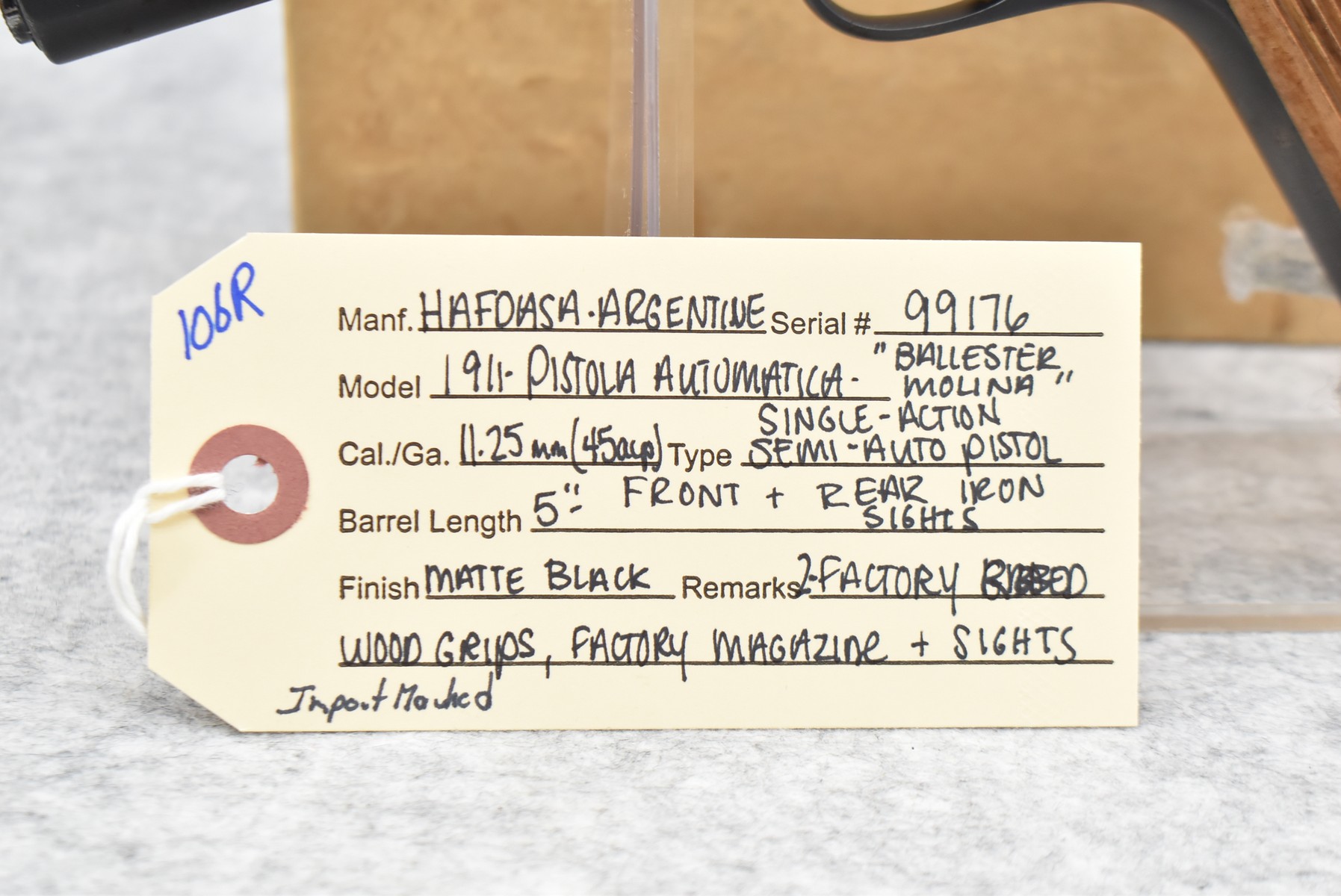 106R. Argentine – Mod. Ballester-Molina (1911) – 11.25mm (45 ACP) Cal. Semi-Auto Pistol – w/5” Barrel w/Front & Rear Iron Sights – Matte Black Finish – w/2 Factory Wood Grips – w/Factory Magazine & Factory Sights – Import Marked