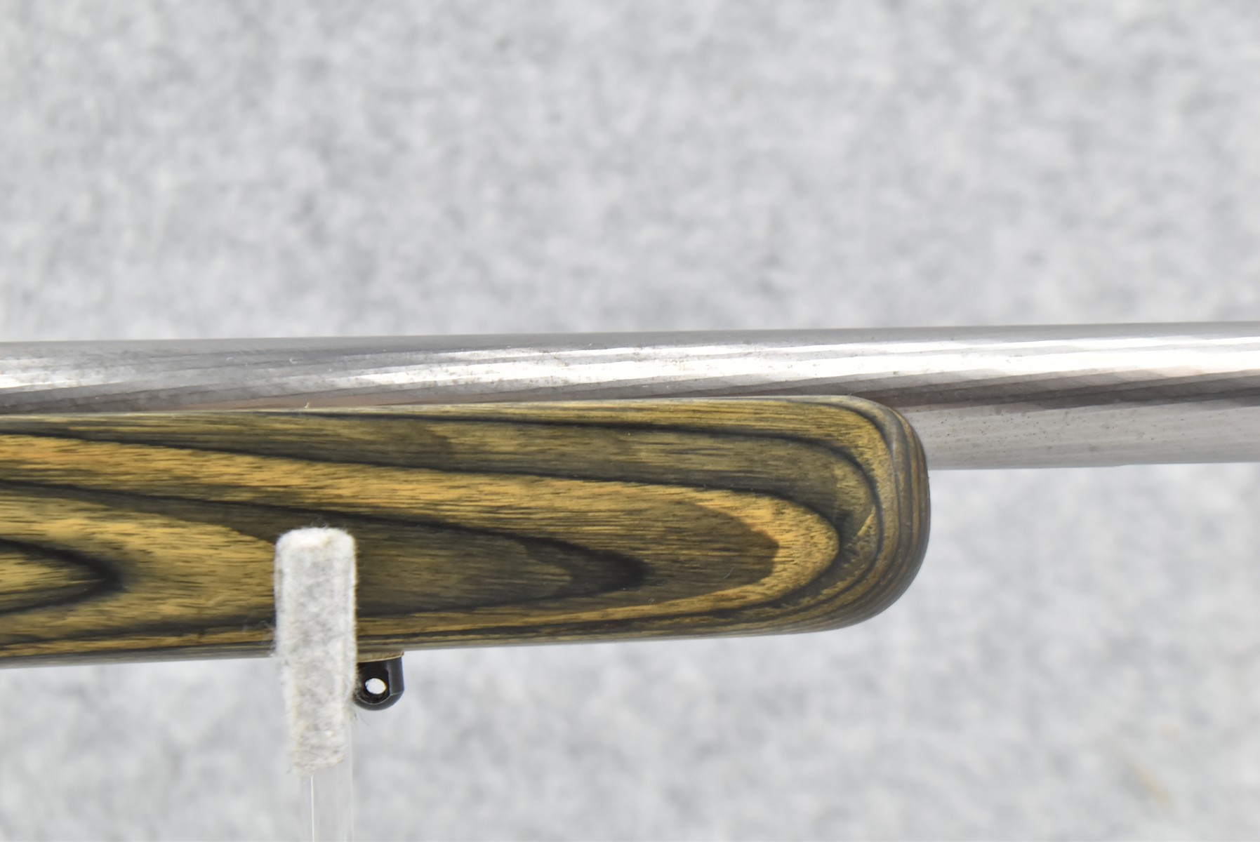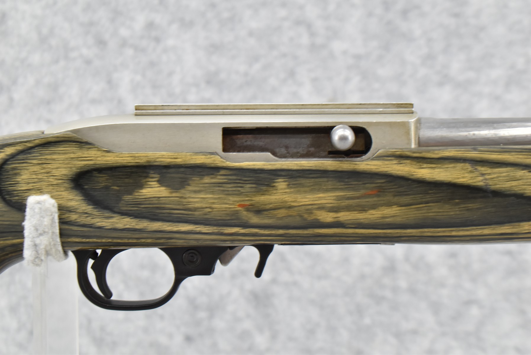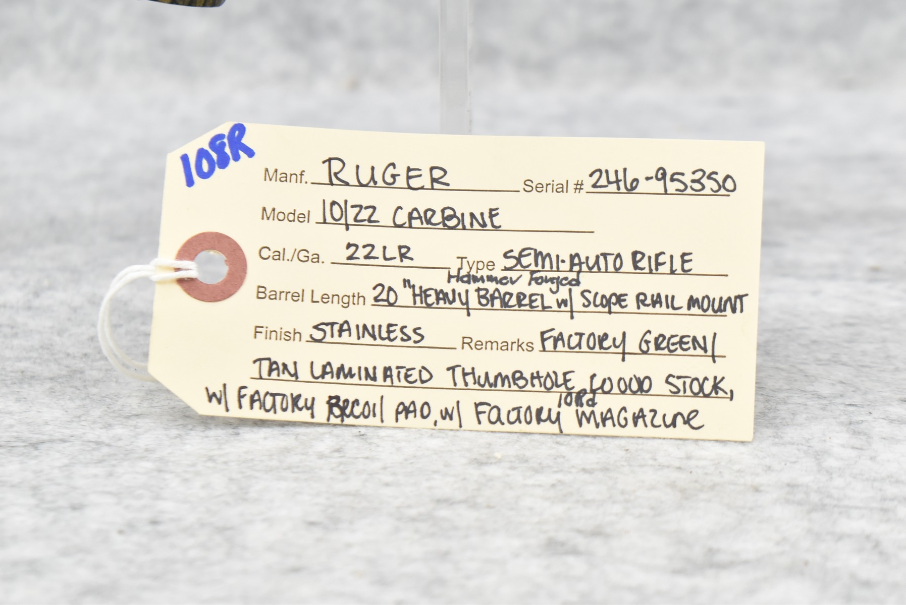 108R. Ruger – Mod. 10/22 Carbine – 22LR Cal. Semi-Auto Rifle – w/20” Heavy Hammer Forged Barrel – Stainless Finish – w/Green Laminated Thumbhole Wood Stock w/Factory Recoil Pad – w/Factory 10Rd Magazine – w/Scope Rail Base