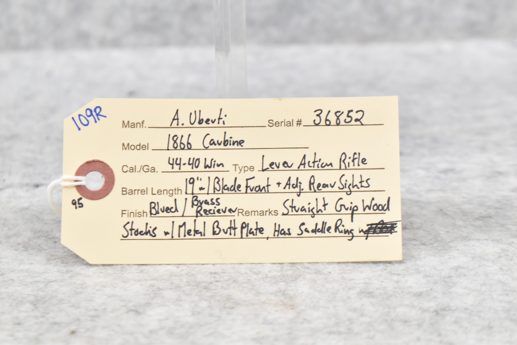 109R. Uberti – Mod. 1866 Saddle Ring Carbine – 44-40 Win. Cal. Lever Action Rifle – w/19” Barrel w/Blade Front & Adj. Rear Sights – Blued Finish w/Brass Receiver – w/Straight Grip Wood Stocks w/Metal Butt Plate
