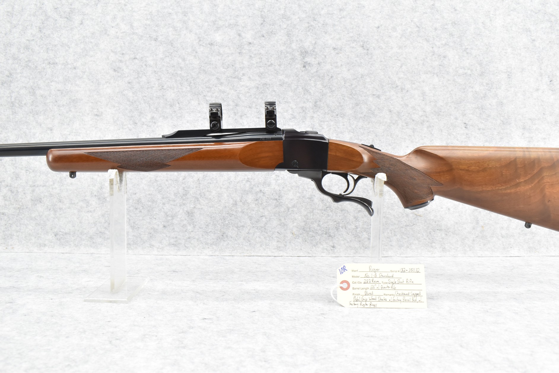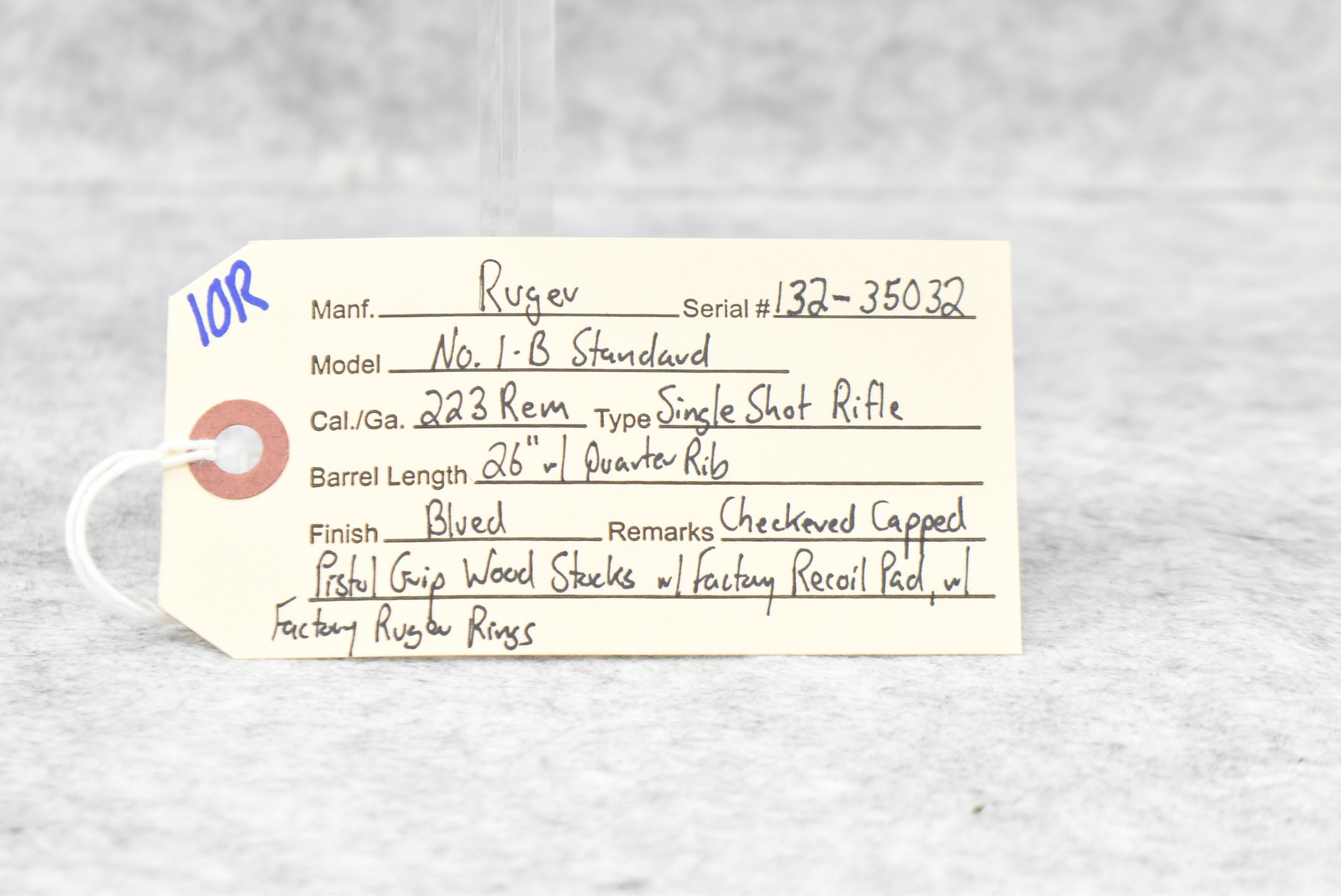 10R. Ruger – Mod. No. 1-B Standard – 223 Rem. Cal. Single Shot Rifle – w/26” Barrel w/Quarter Rib – Blued Finish – w/Chckered Capped Pistol Grip Wood Stocks w/Factory Recoil Pad – w/Factory Ruger Rings
