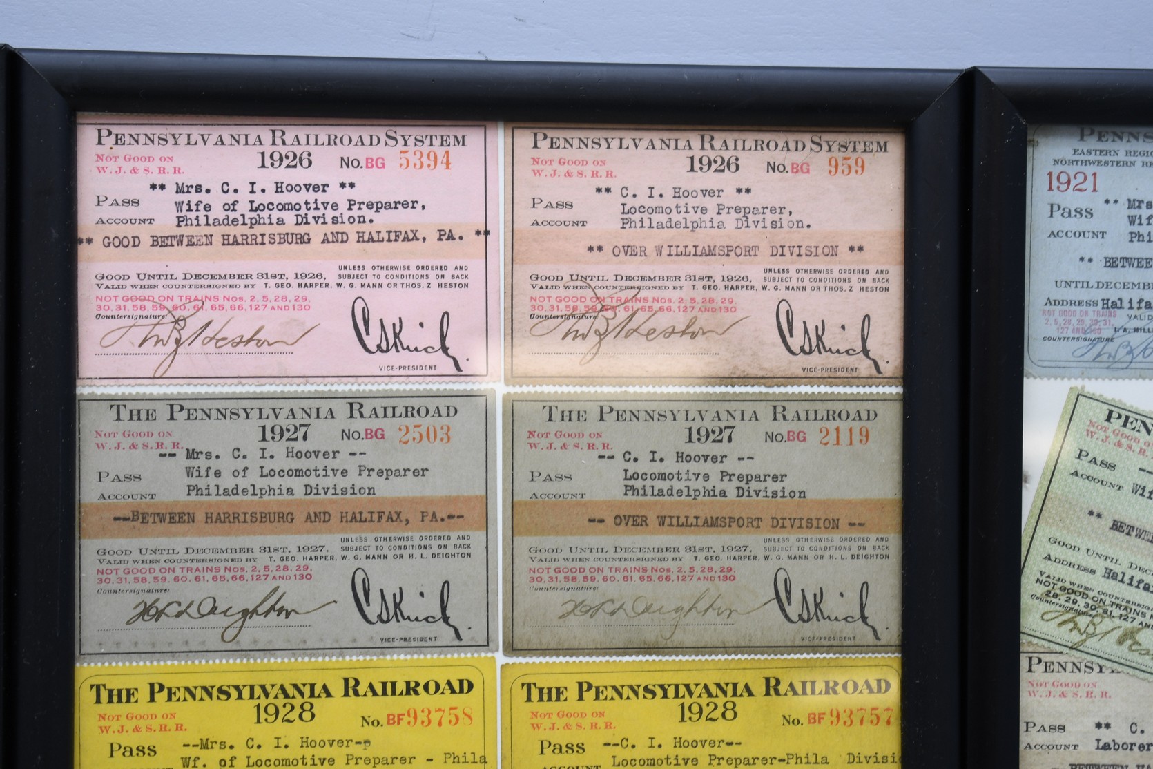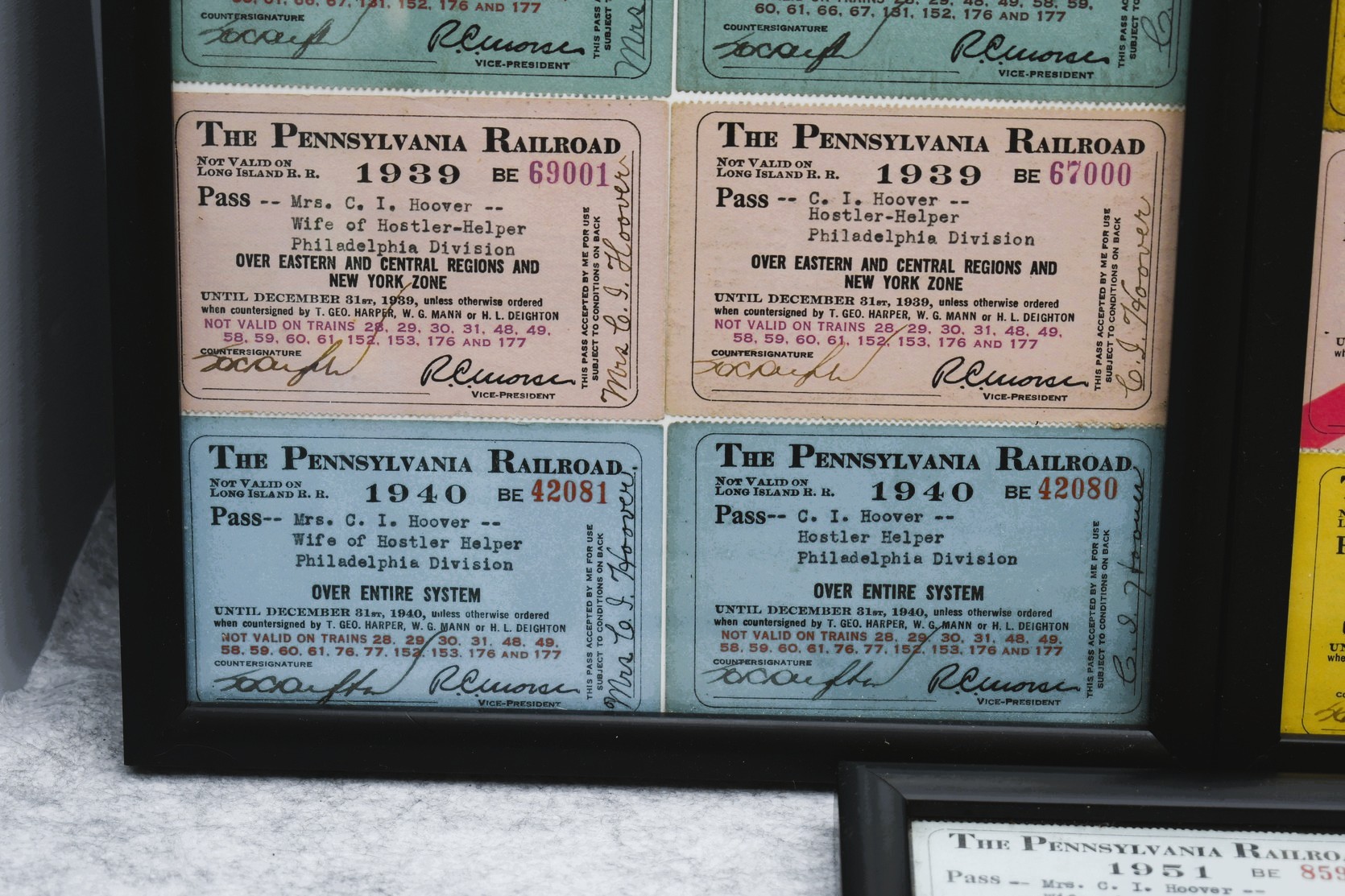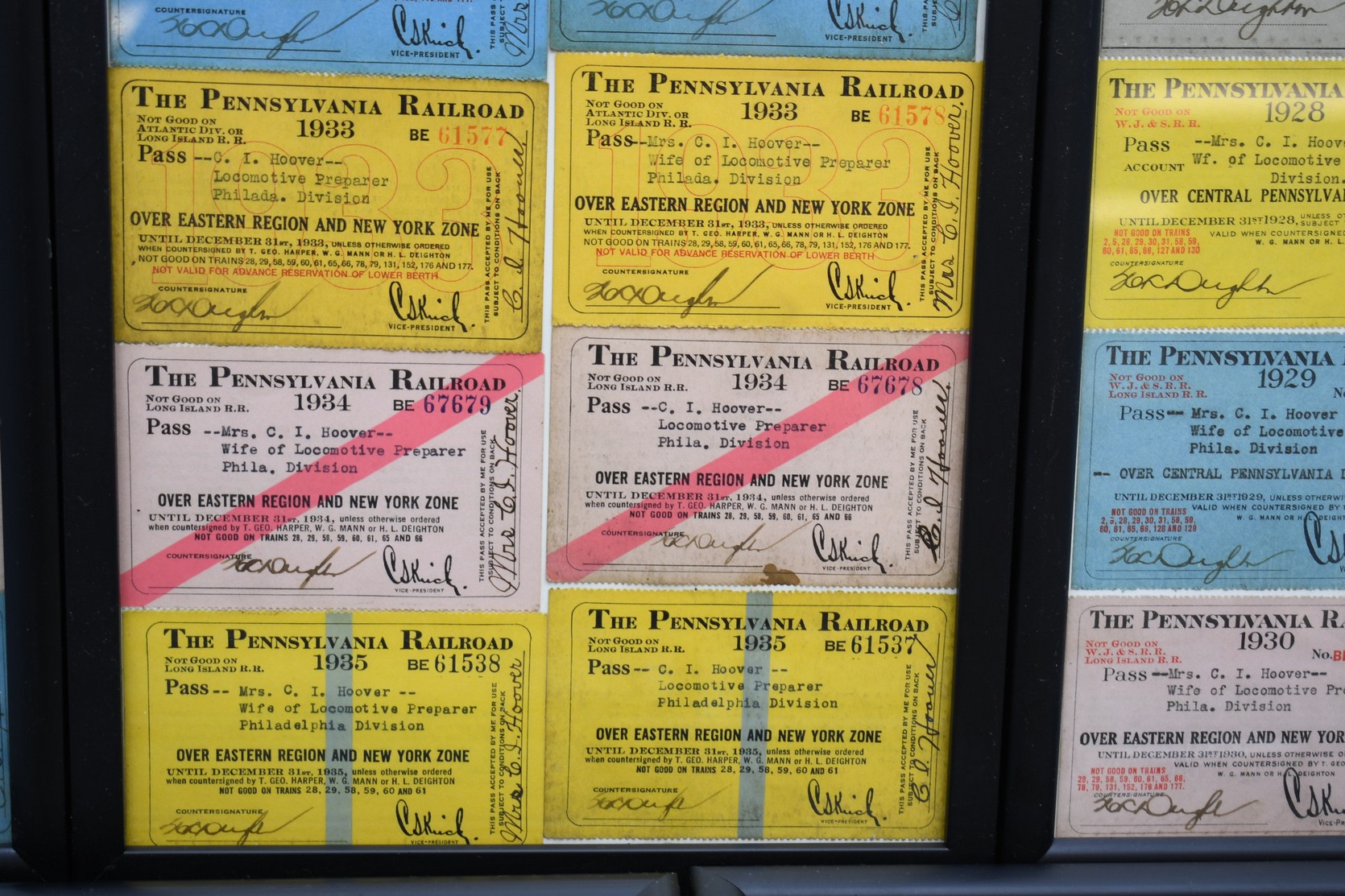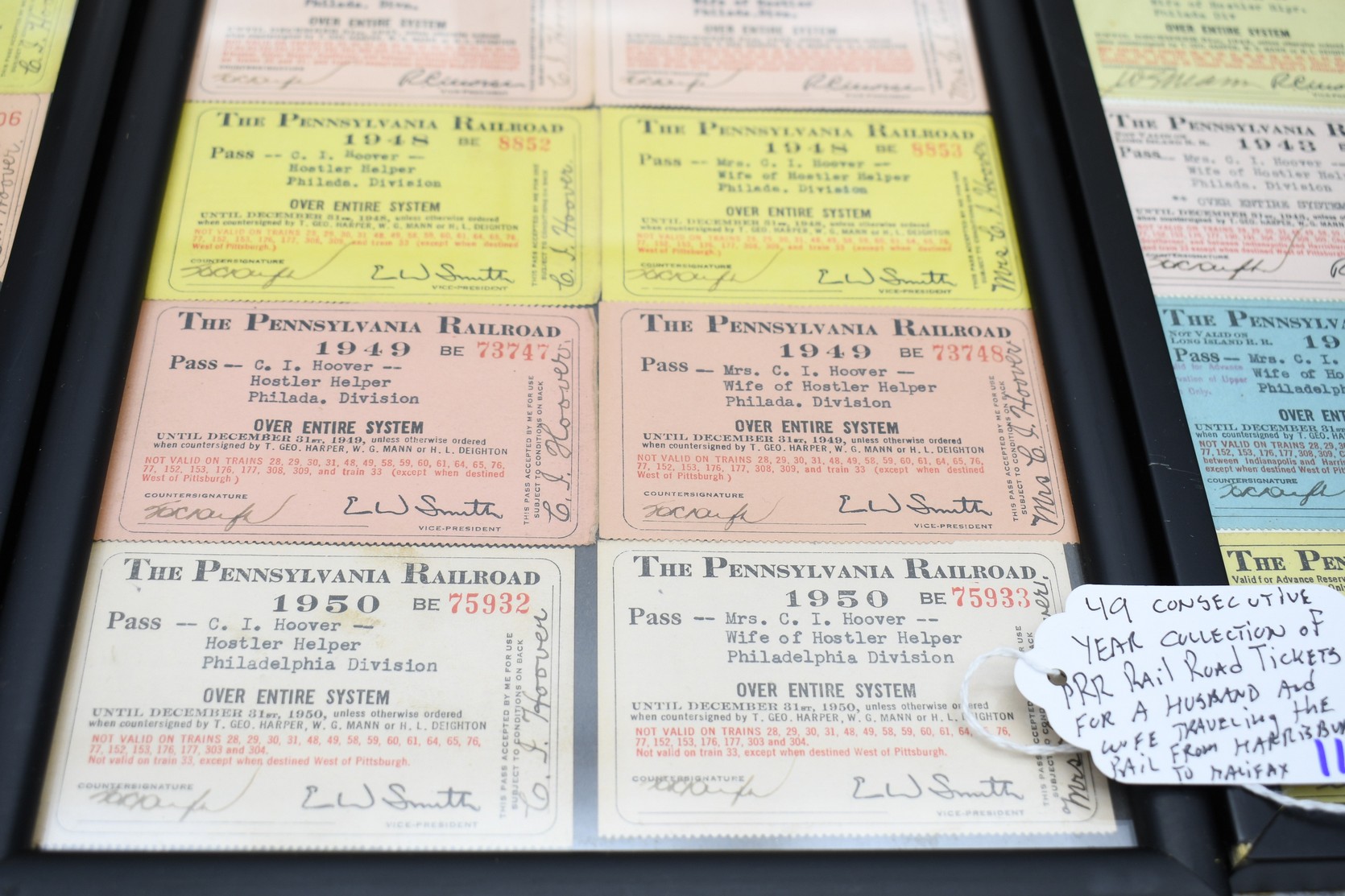 111. Exceptional Framed Consecutive Set of Pennsylvania Railroad Tickets – The Collection Dates from 1921 Through 1960 – Mr. C. I. Hoover and his Wife, Mrs. C. I. Hoover, Wife of Labor, Traveled from Harrisburg and Halifax Every Year – The Framed Collection of 49 Years has Both of their Tickets for Each Year – Very Unusual to Find Such a Consecutive Span of P.R.R. Tickets