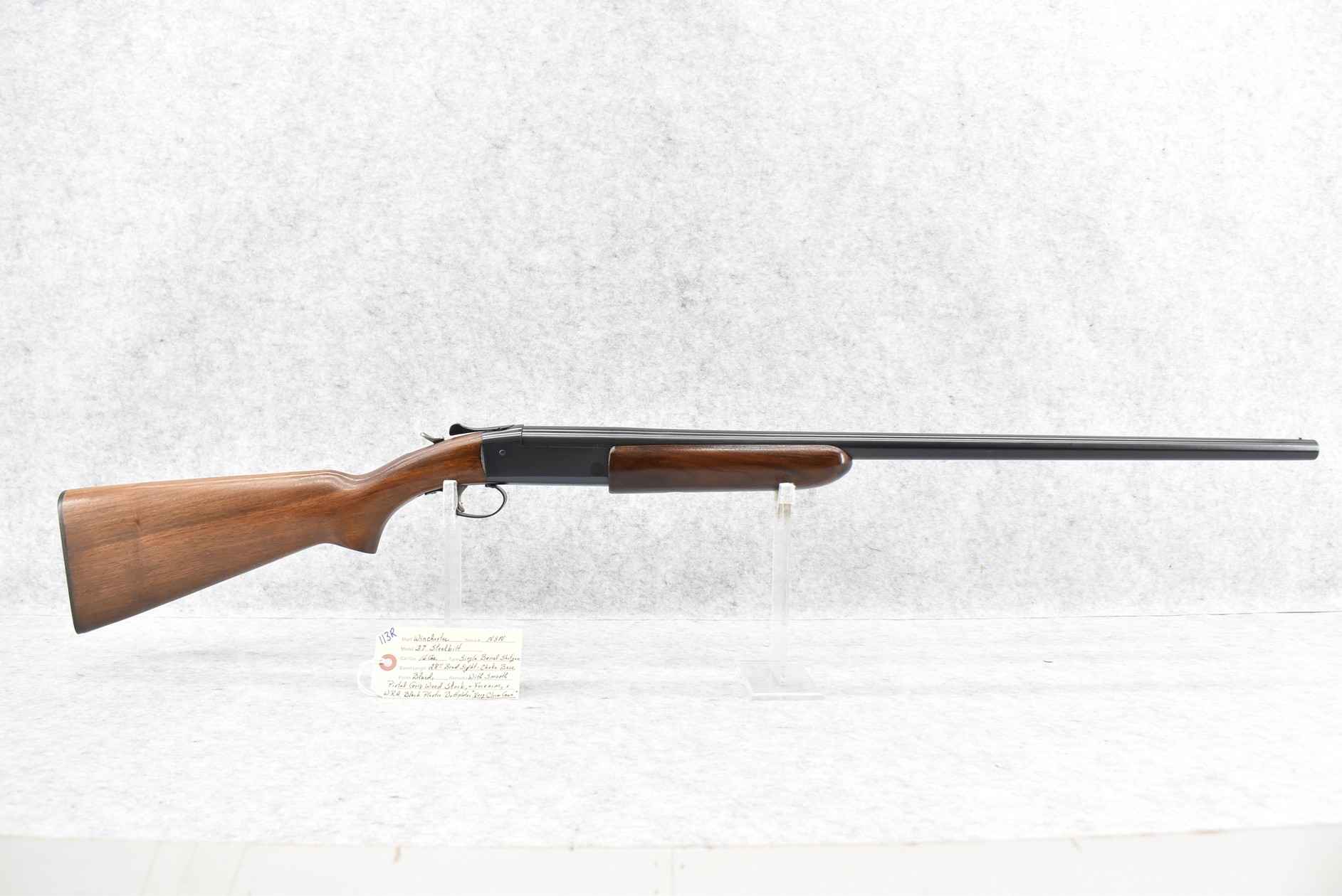 113R. Winchester – Mod. 37 Steelbilt – 16ga. Single Barrel Shotgun – w/28” Choked Barrel w/Bead Sight – Blued Finish – w/Smooth Pistol Grip Wood Stocks w/Factory Butt Plate – Very Clean Gun!
