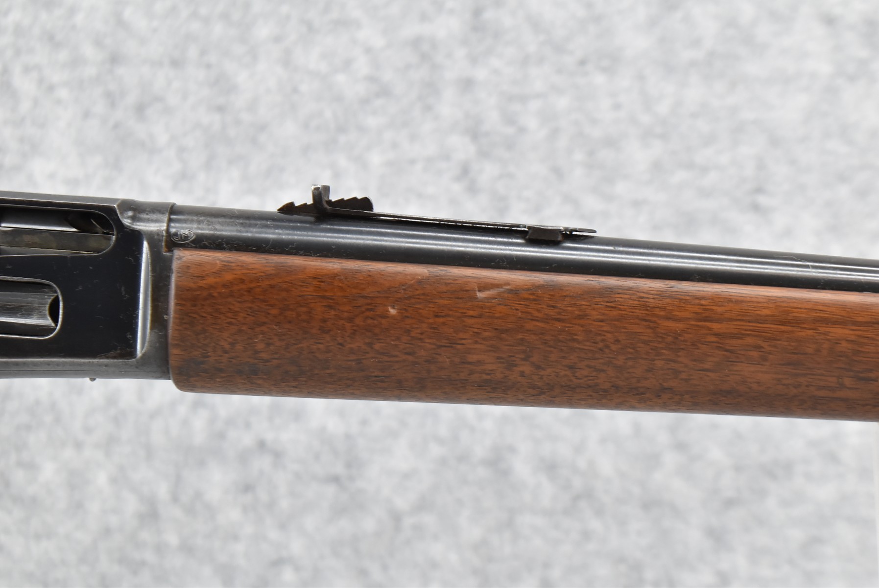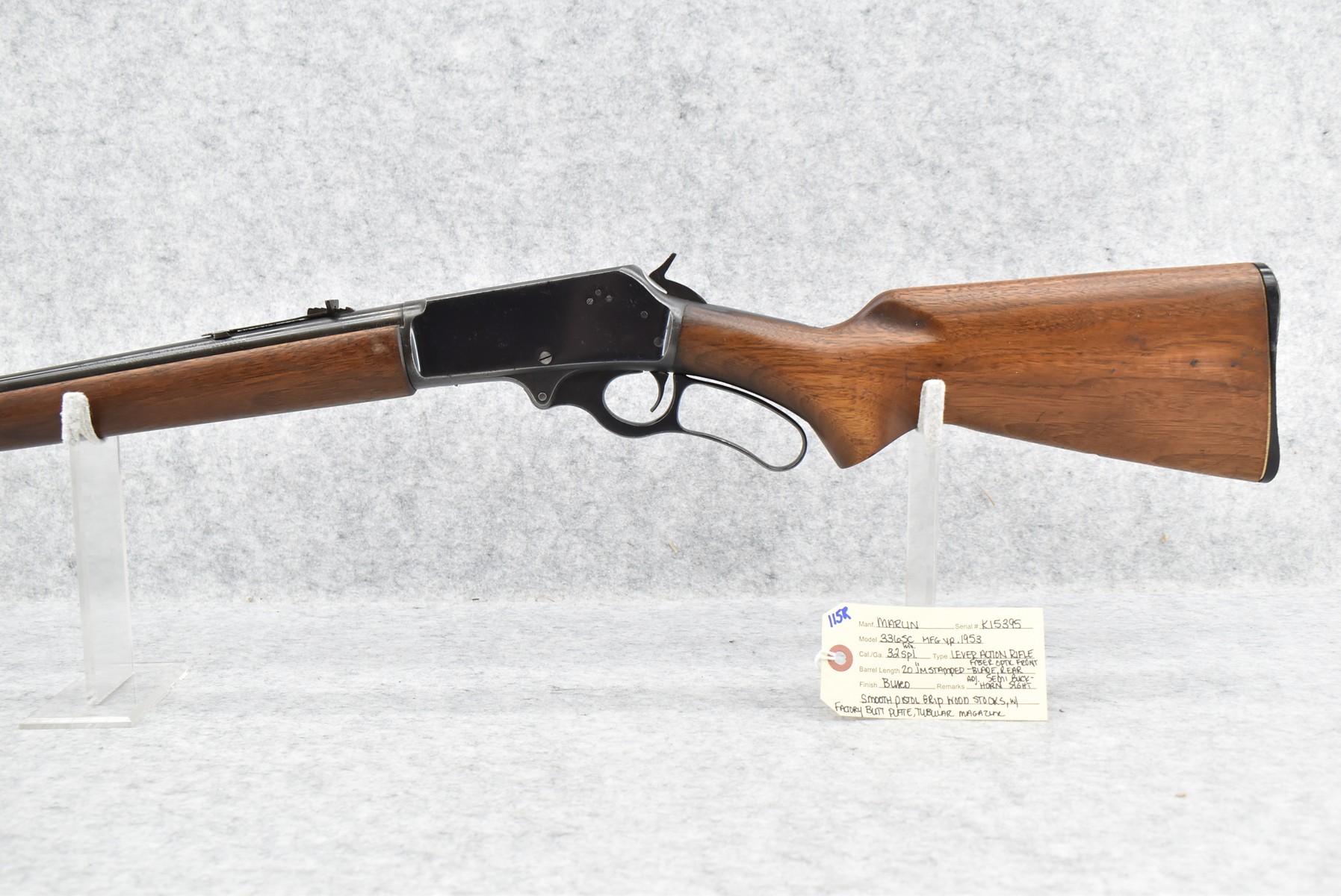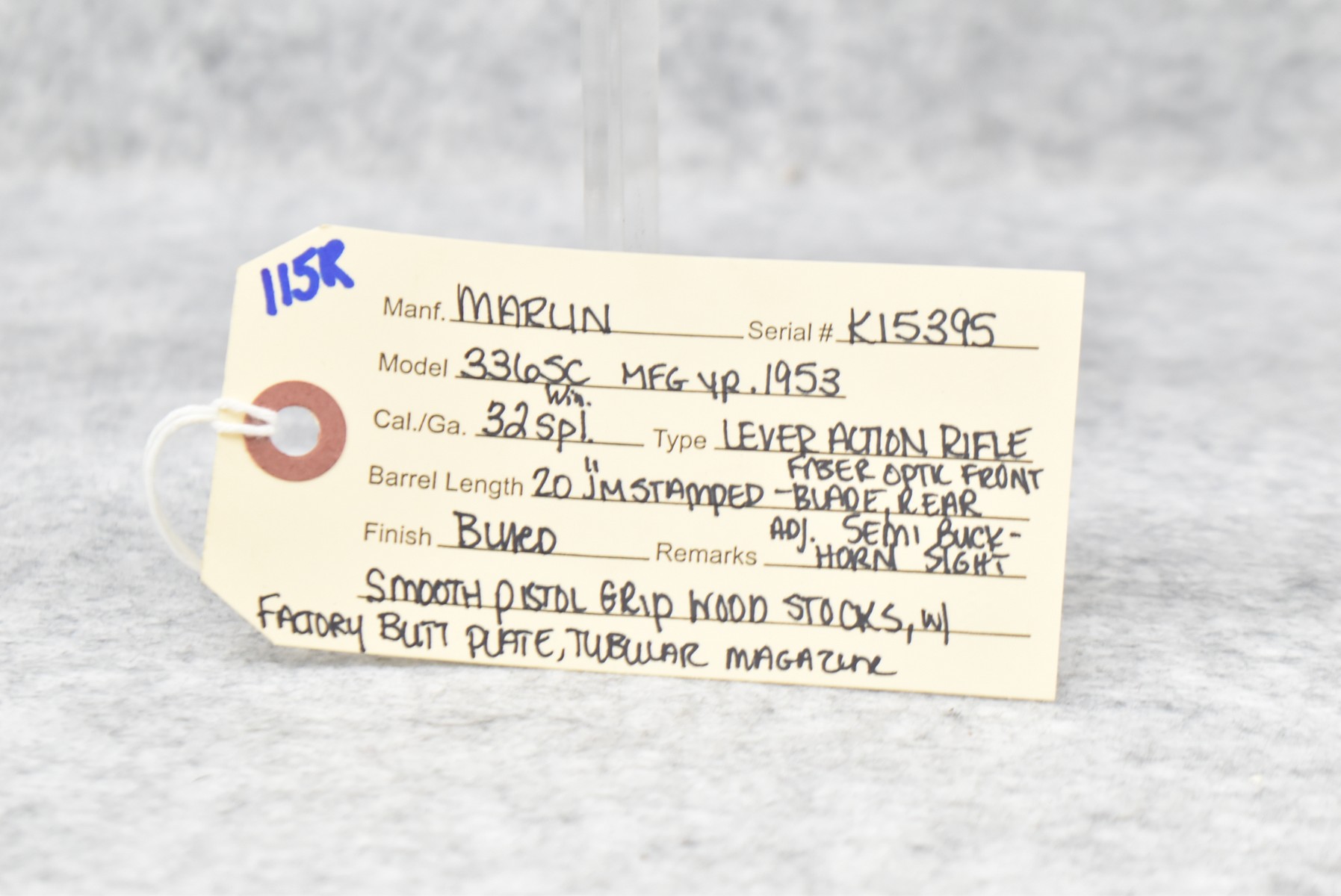 115R. Marlin – Mod. 336 SC – 32 Win. Spl. Cal. Lever Action Rifle – w/20” JM Stamped Barrel w/Fiber Optic Front & Blade Rear Adj. Semi-Buckhorn Sights w/Tubular Magazine – Blued Finish – w/Smooth Pistol Grip Wood Stocks w/Factory Butt Plate – Mfg. 1953