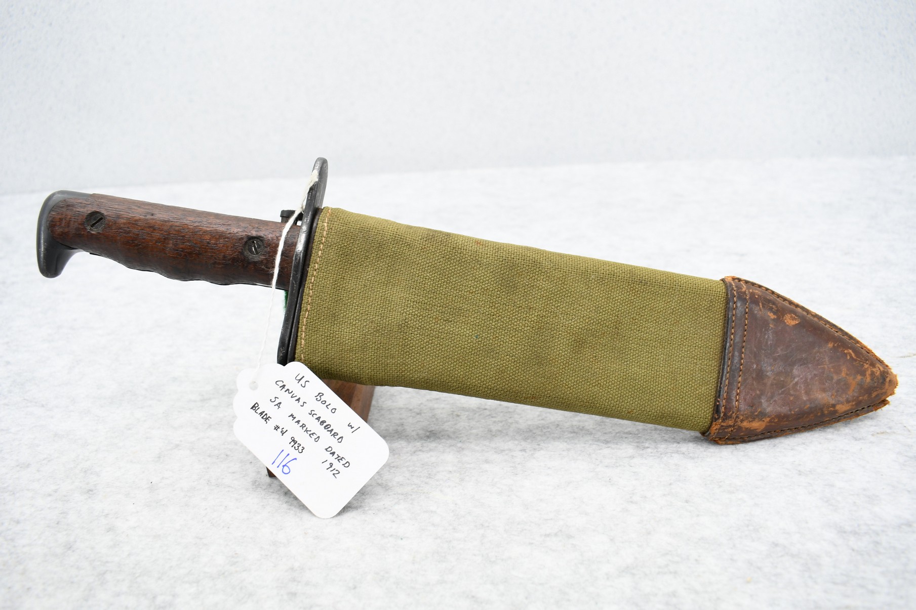 116. U.S. Springfield Bolo w/Canvas Scabbard – SA Marked Dated 1912 – Blade No. 9933
