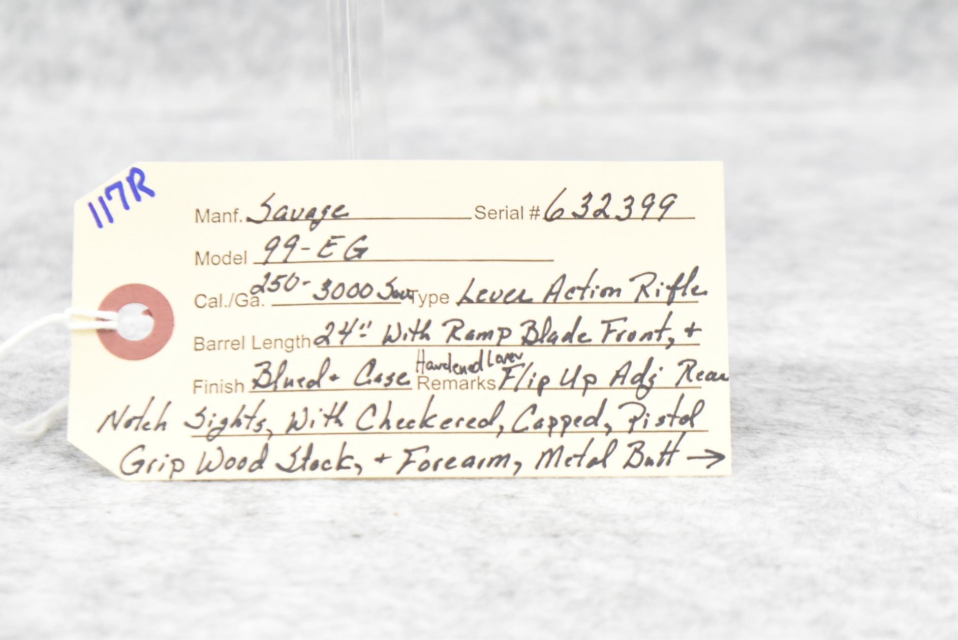 117R. Savage – Mod. 99-EG – 250-3000 Sav. Cal. Lever Action Rifle – w/24” Barrel w/Ramp Blade Front & Flip Up Adj. Rear Notch Sights – Blued Finish w/Case Hardened Lever – w/Checkered Capped Pistol Grip Wood Stocks w/Metal Butt Plate & Sling Loops – w/Redfield Scope Rings & Mounting Bases