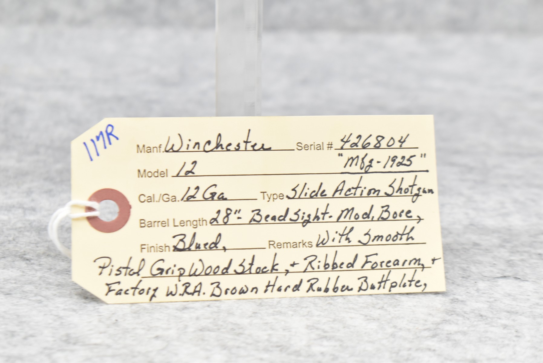 117R. Winchester – Mod. 12 – 12ga. Pump Action Shotgun – w/28” Mod. Choke Barrel w/Bead Sight – Blued Finish – w/Smooth Pistol Grip Wood Stock & Ribbed Forearm w/Factory Hard Rubber Butt Plate – Mfg. 1925