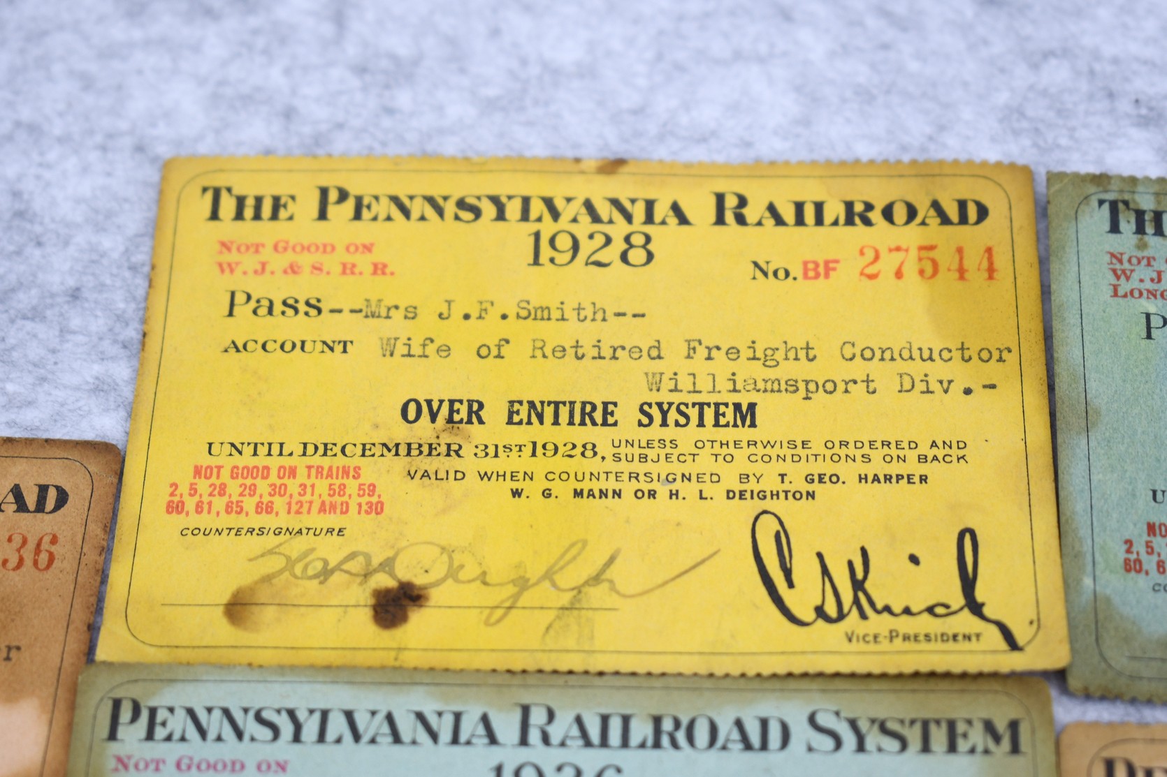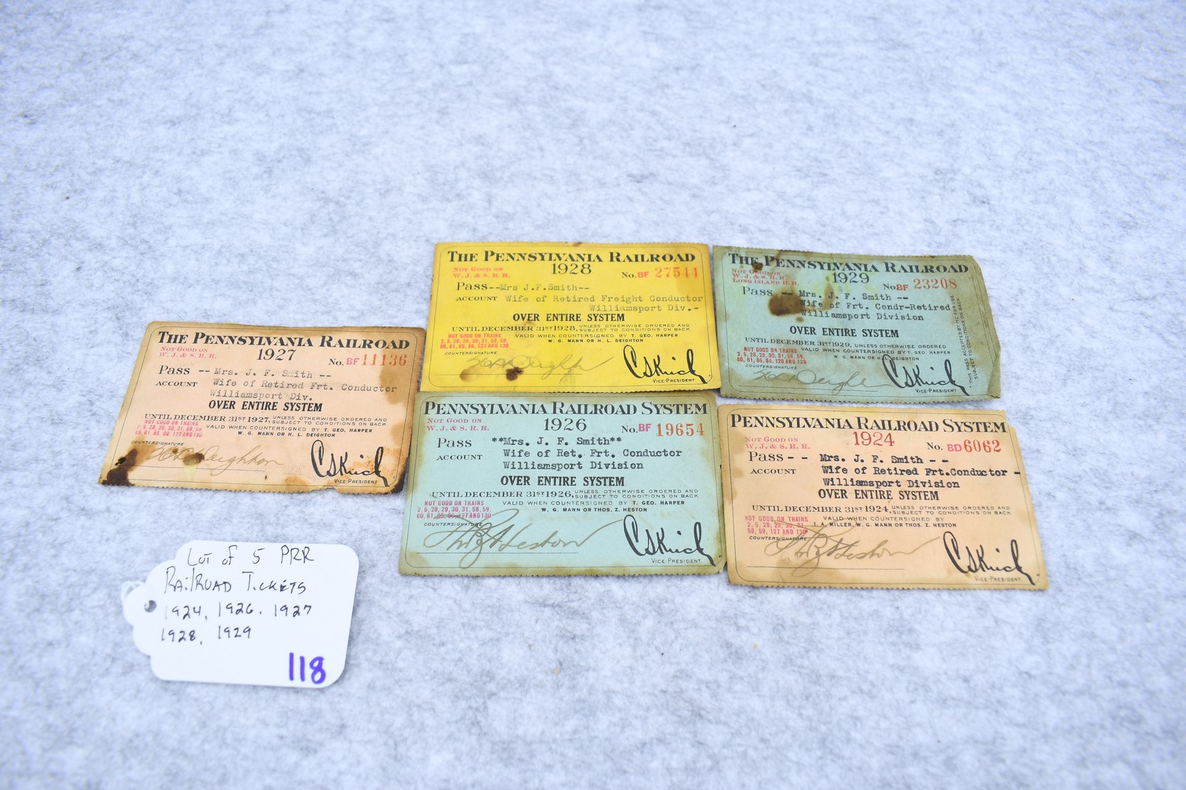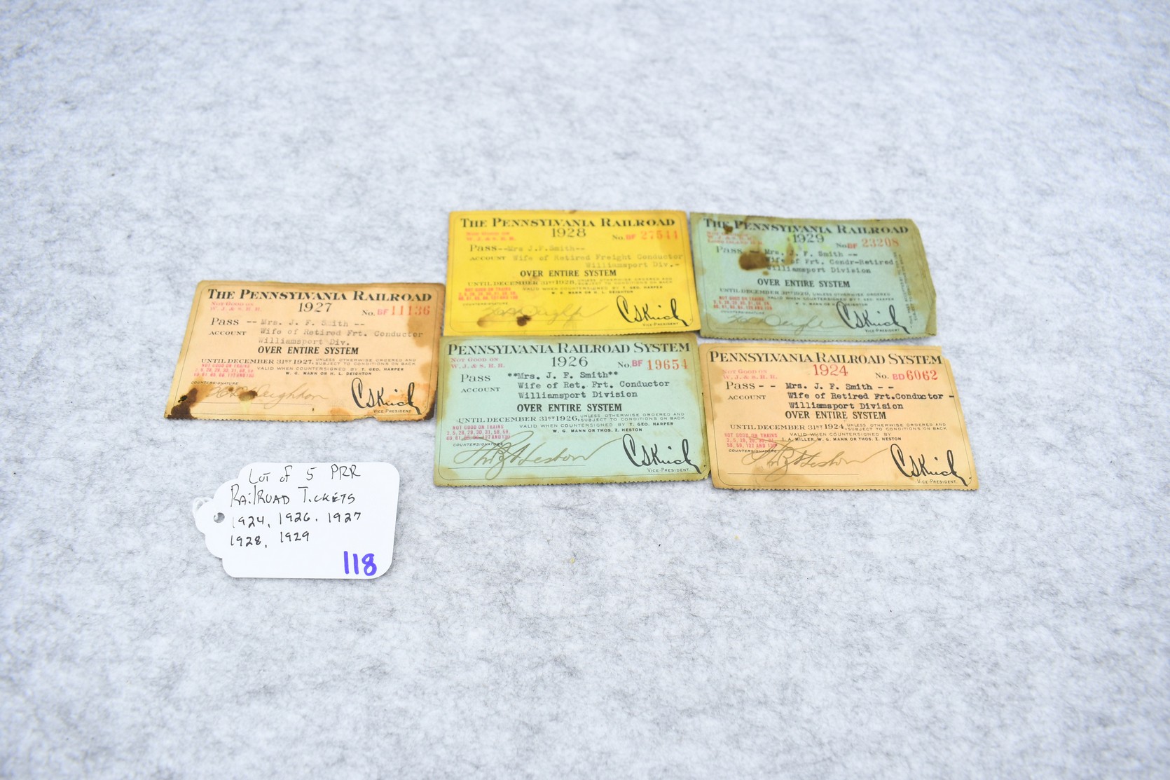 118. Lot of 5 P.R.R. Railroad Tickets Including: 1924, 1926, 1927, 1928, and 1929 – Tickets are Good for the Entire Railroad System