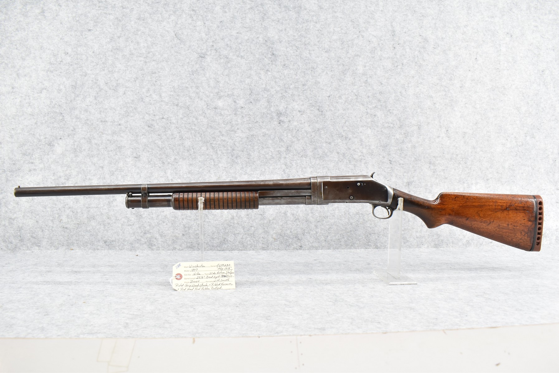 118R. Winchester – Mod. 1897 – 16ga. Pump Action Shotgun – w/25 ¼” Mod. Choke Barrel w/Bead Sight – Brown Finish – w/Smooth Pistol Grip Wood Stock & Ribbed Forearm w/Red Head Butt Pad – Mfg. 1918