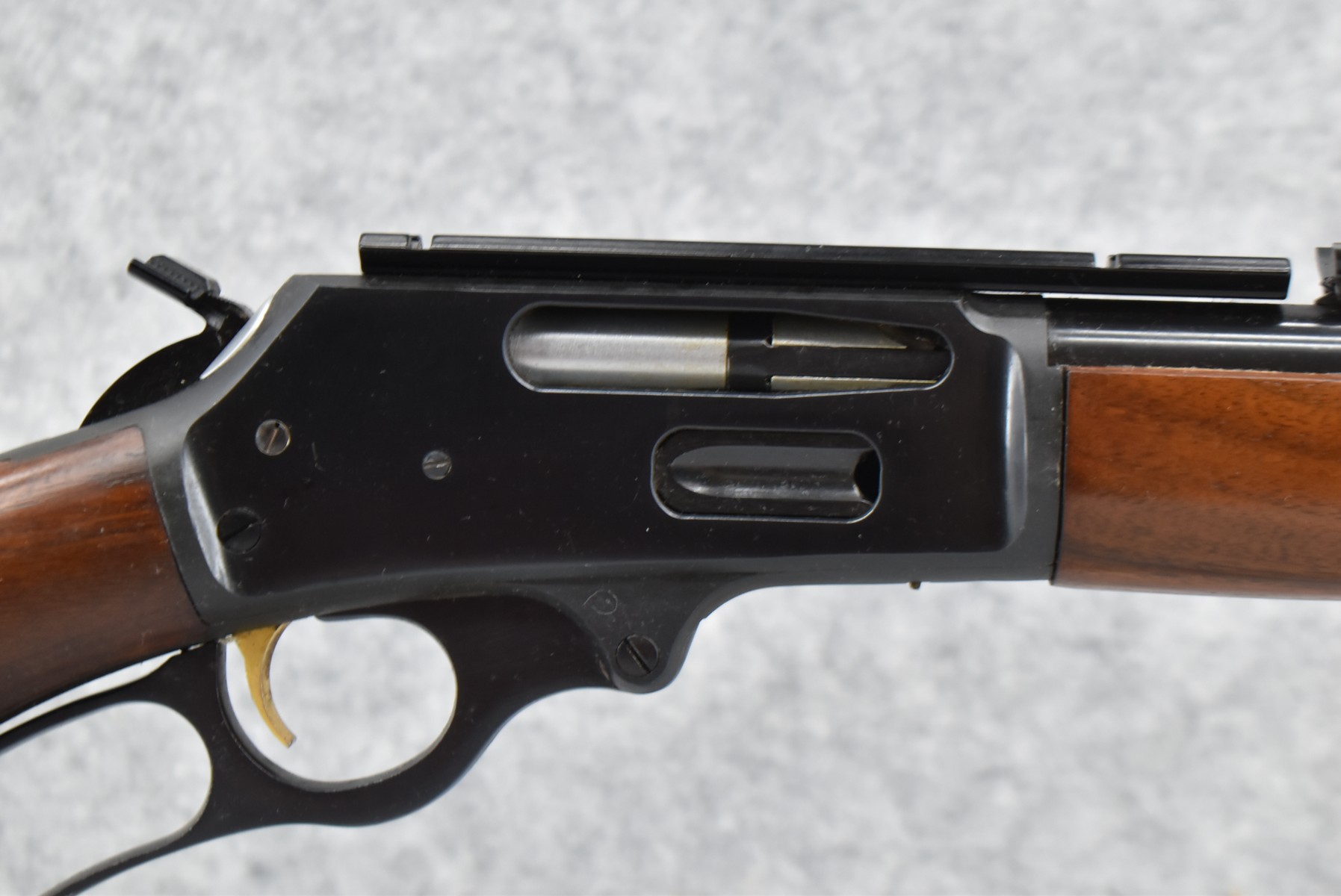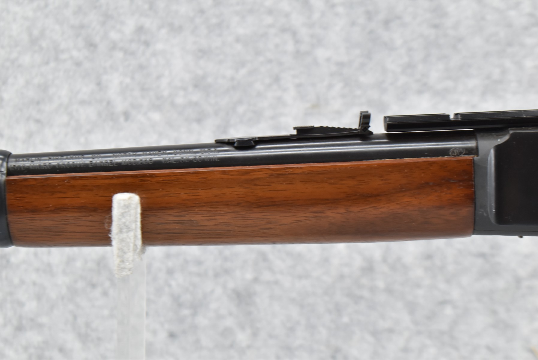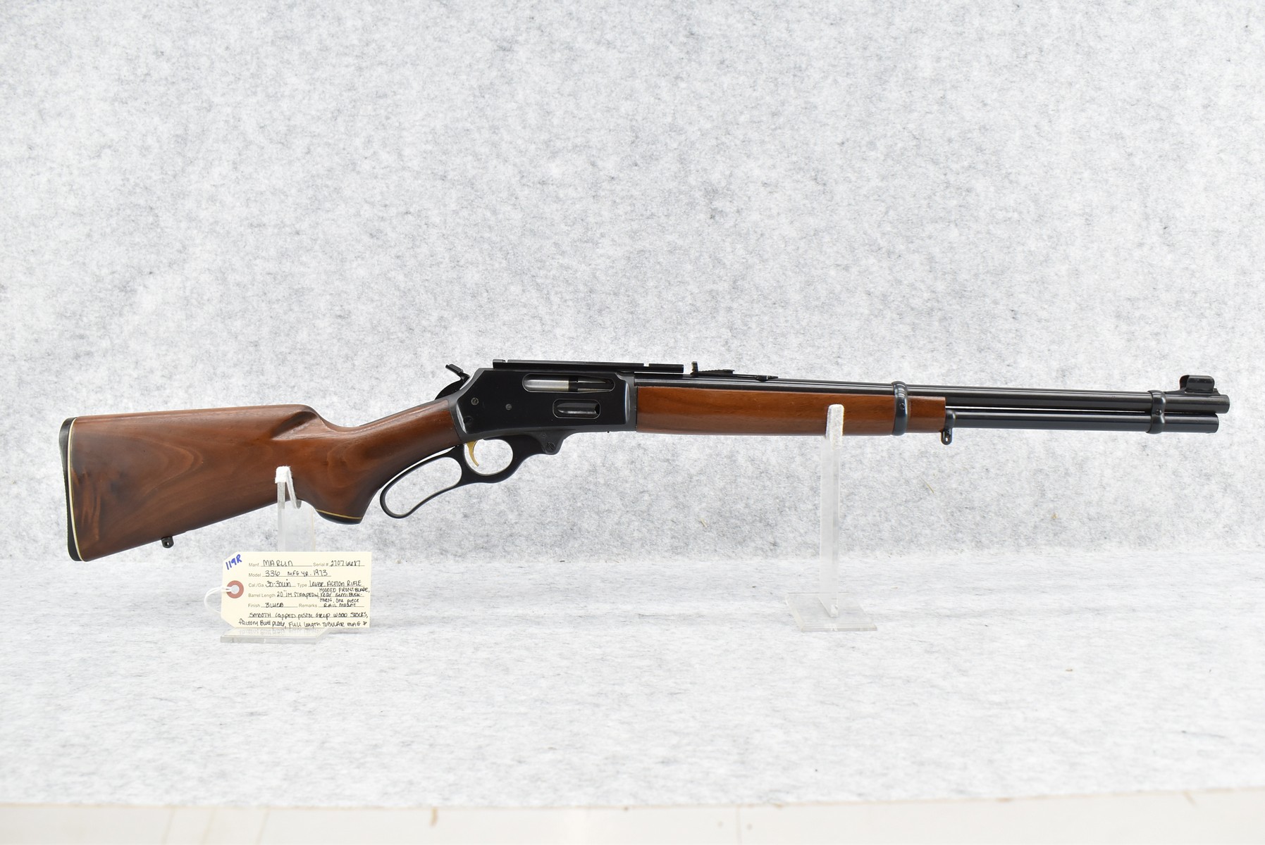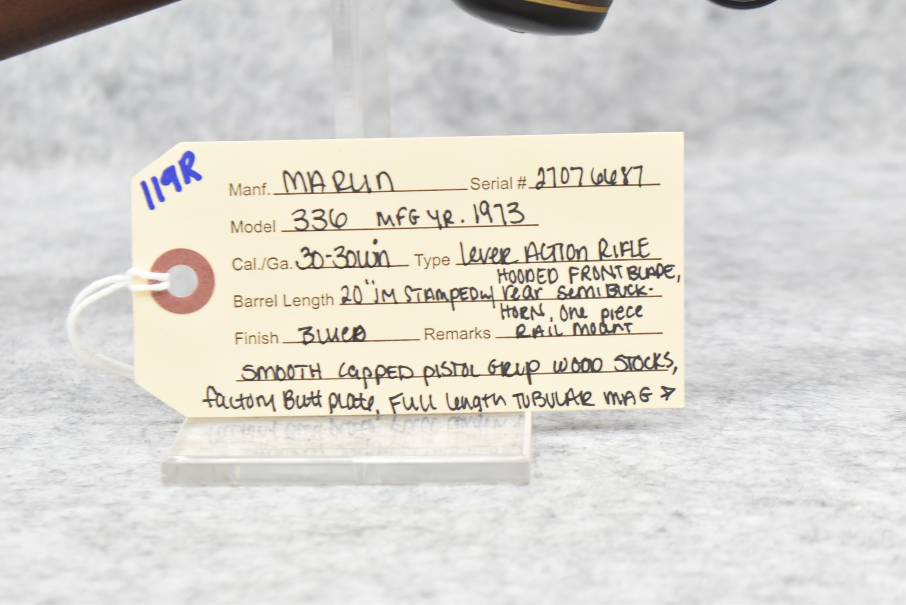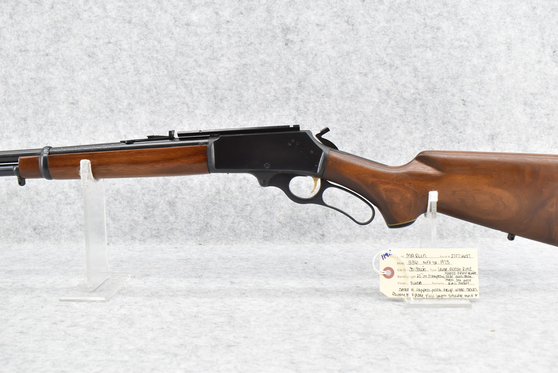 119R. Marlin – Mod. 336 – 30-30 Win. Cal. Lever Action Rifle – w/20” JM Stamped Barrel w/Hooded Front Blade & Rear Semi-Buckhorn Rear Sights w/Full Length Tubular Mag – Blued Finish – w/Smooth Capped Pistol Grip Wood Stocks w/Factory Butt Plate – w/Hammer Extension – w/1pc. Rail Mount – Mfg. 1973