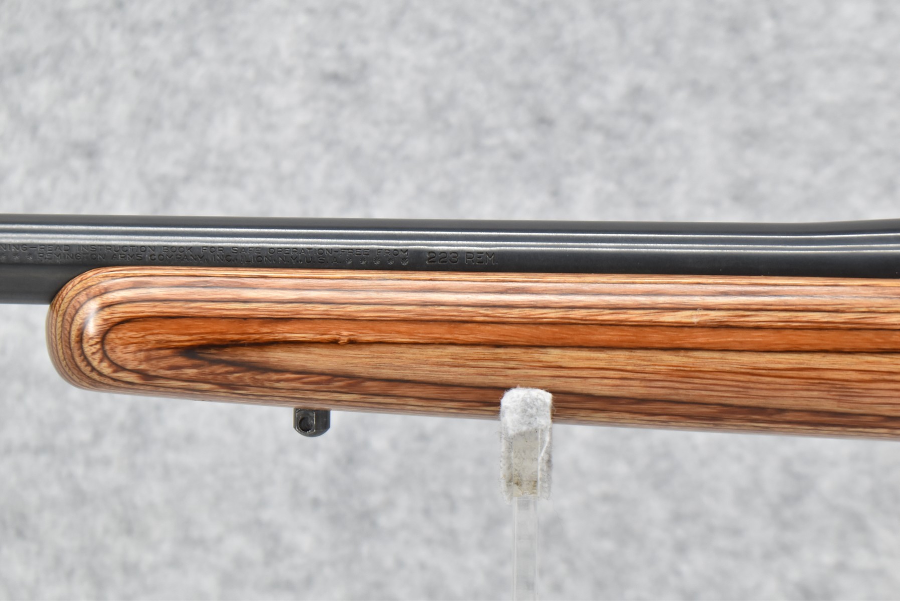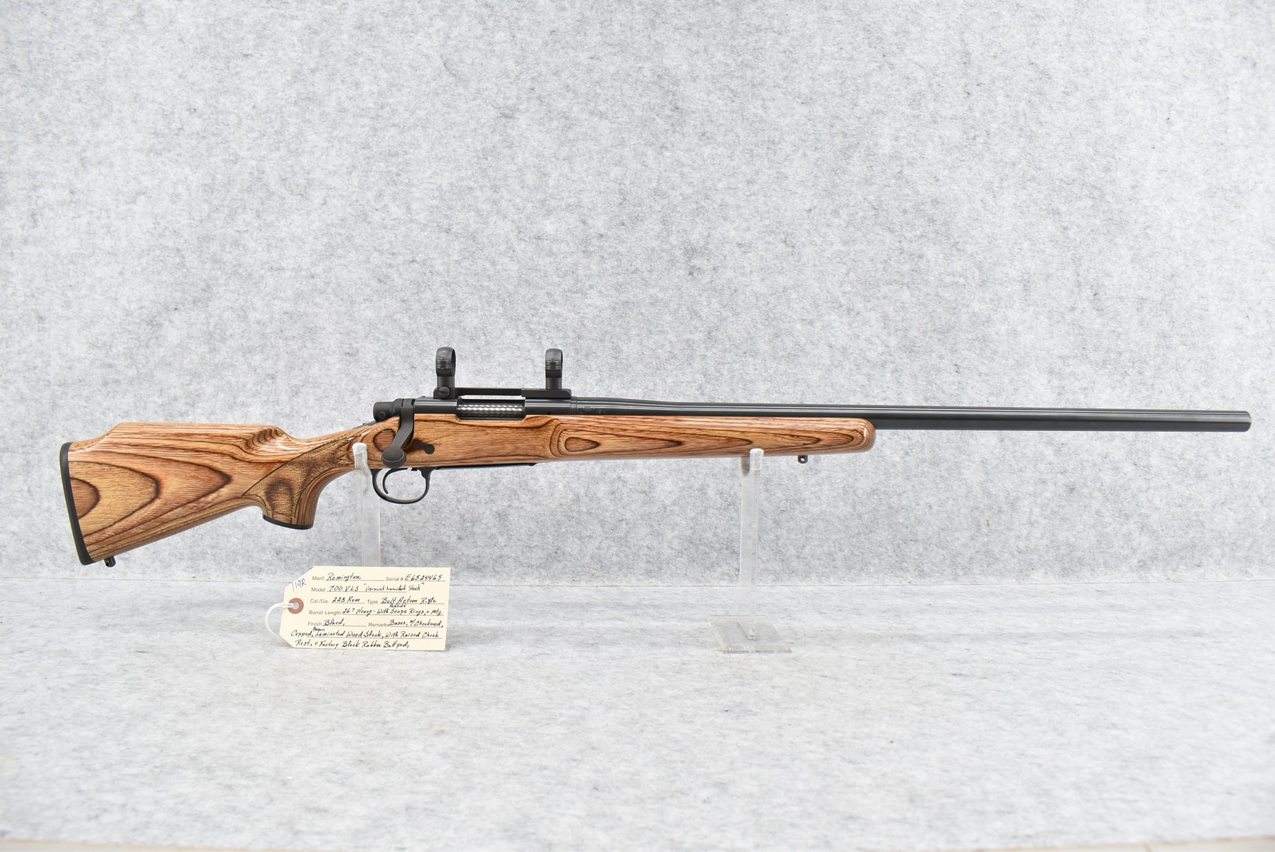 119R.     Remington – Mod. 700 VLS “Varmint Laminated Stock” – 223 Rem. Cal. Bolt Action Rifle – w/26” Heavy Barrel – Blue Finish – w/Checkered Capped Brown Laminated Wood Stock w/Raised Cheek Piece w/Factory Butt Pad – w/Redfield Scope Rings & Mounting Bases