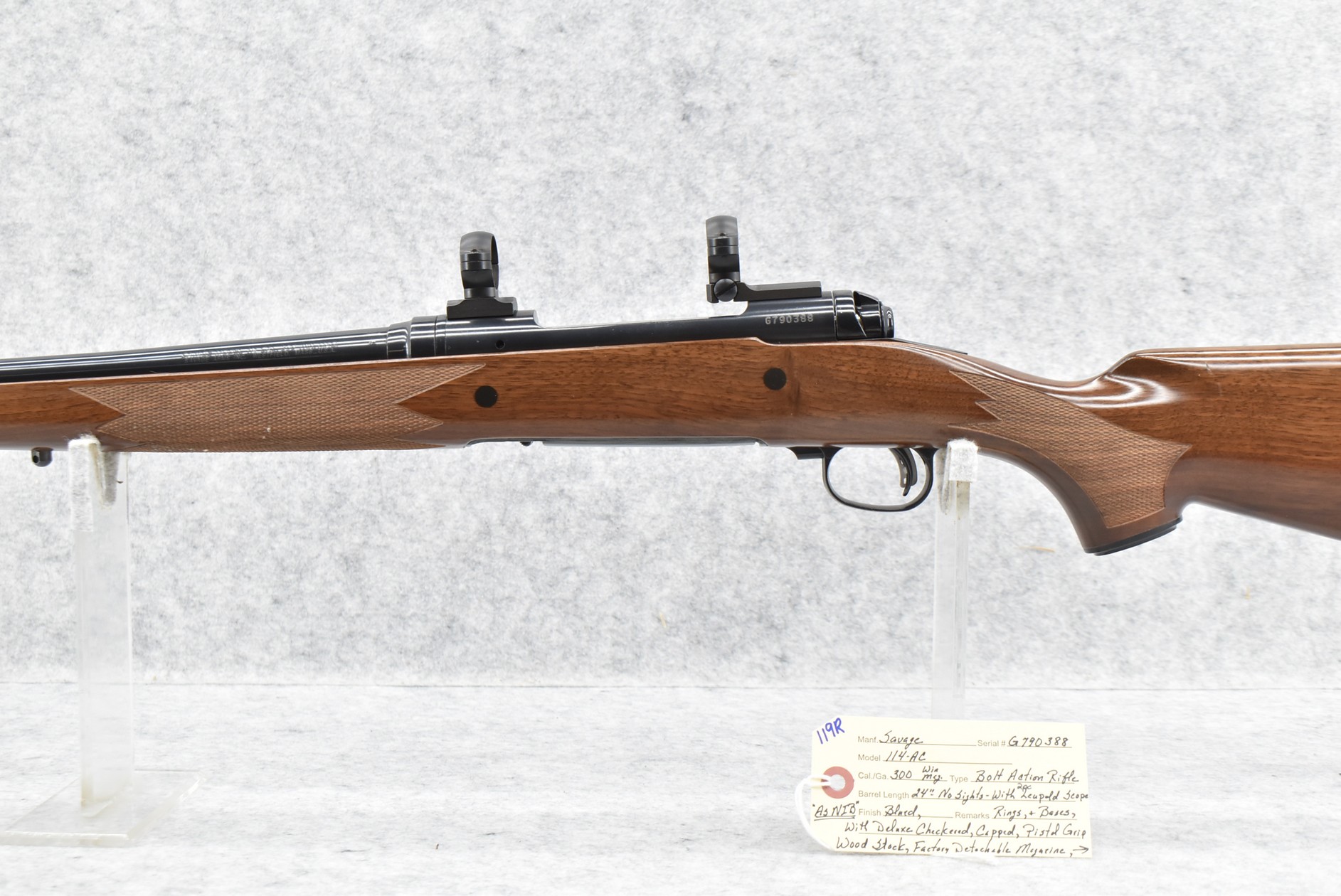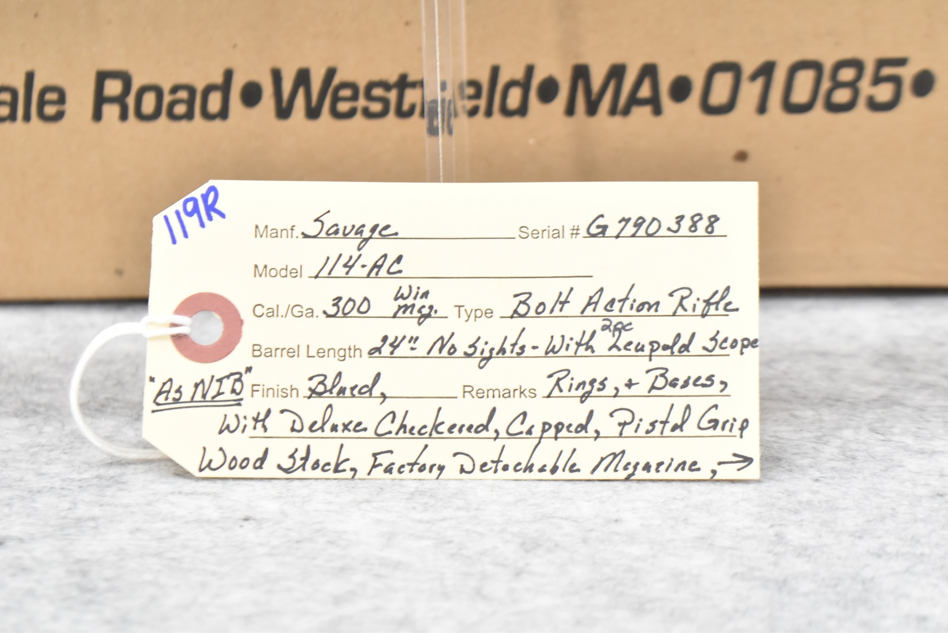 119R. Savage – Mod. 114-AC – 300 Win. Mag. Cal. Bolt Action Rifle – w/24” Barrel (No Sights) – w/2pc. Leupold Scope Rings & Bases – Blued Finish – w/Deluxe Checkered Capped Pistol Grip Wood Stock w/Limb Saver Butt Pad – w/Factory Detachable Magazine – As New w/Factory Box