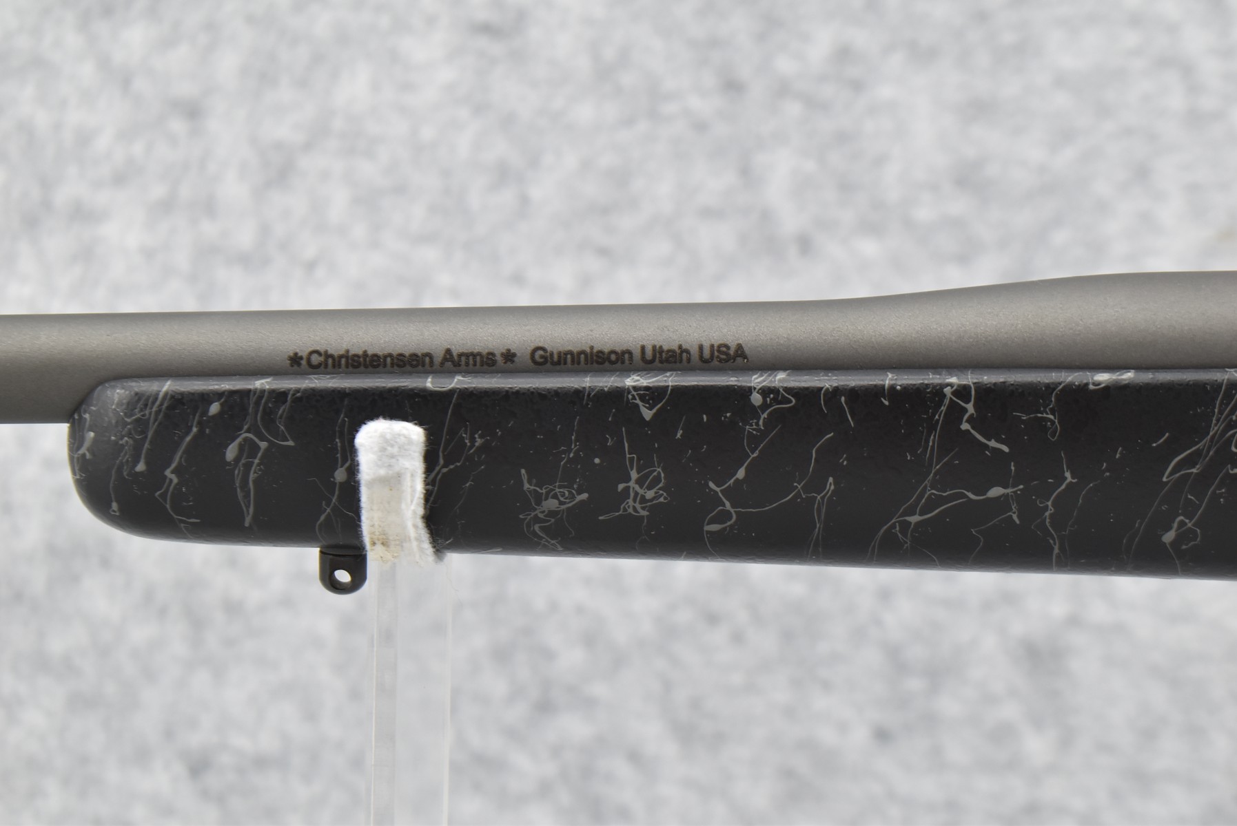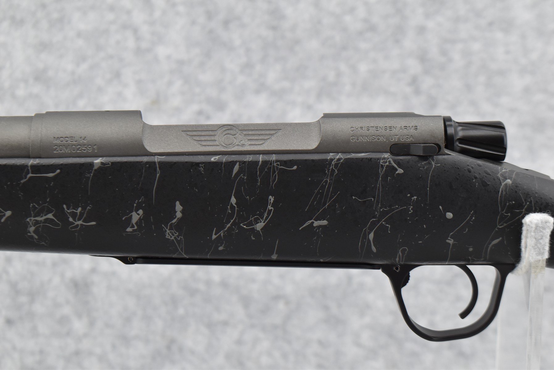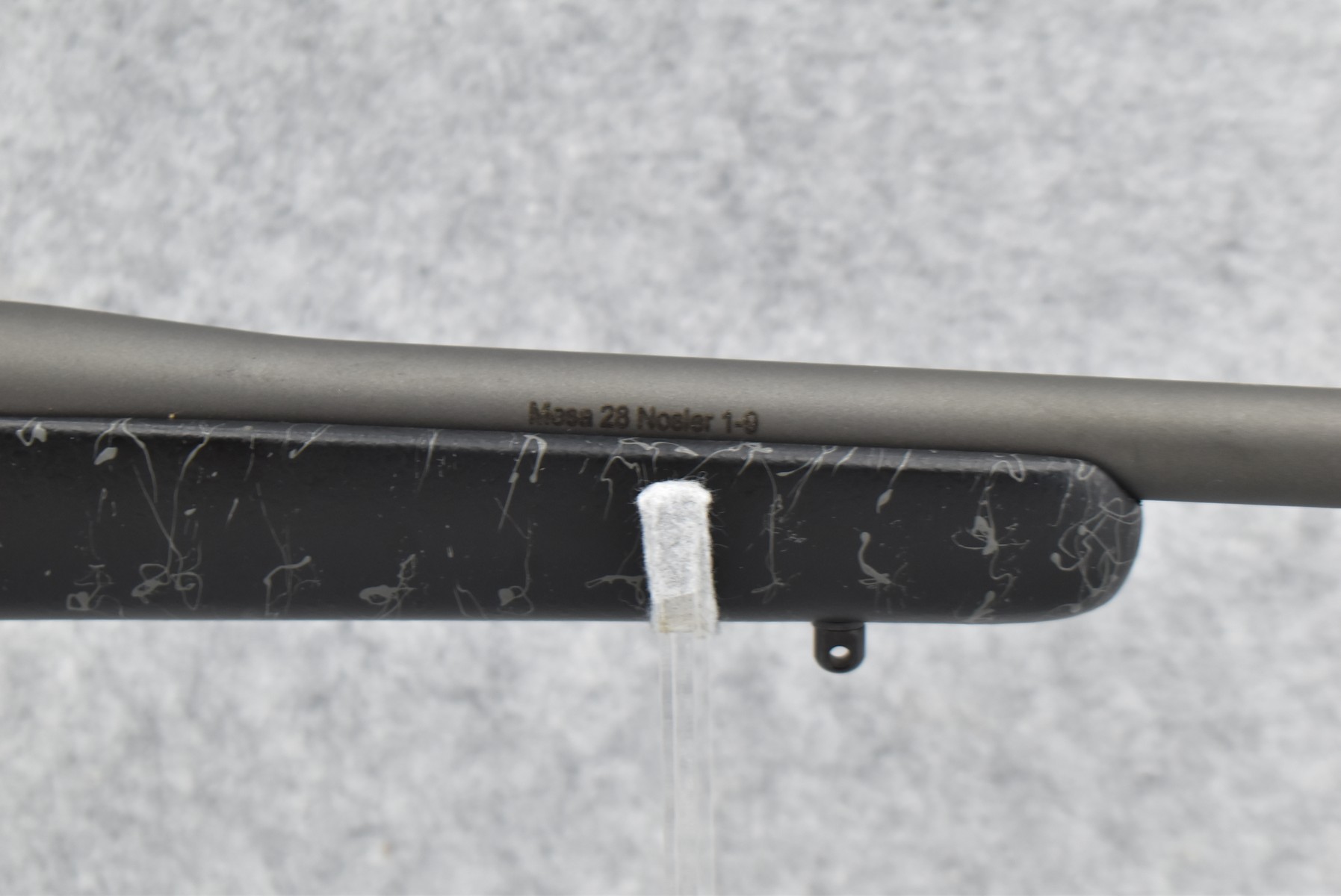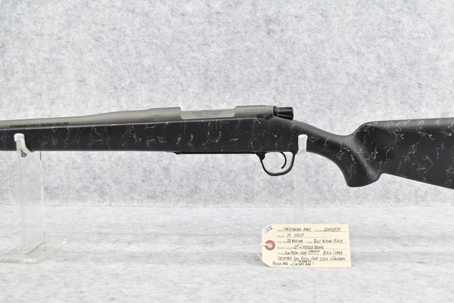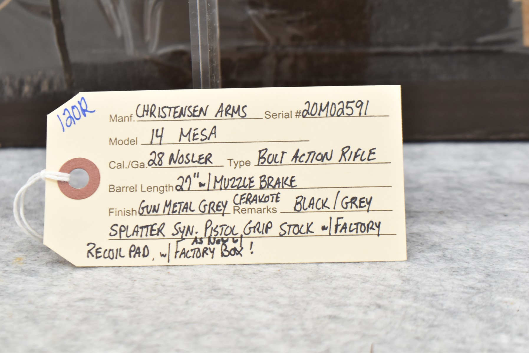 120R. Christensen Arms – Mod. 14 MESA – 28 Nosler Cal. Bolt Action Rifle – w/27” Barrel w/Muzzle Brake – Gun Metal Gray Cerakote Finish – w/Black/Gray Spider Web Synthetic Pistol Grip Stock w/Factory Recoil Pad – As new w/Factory Box