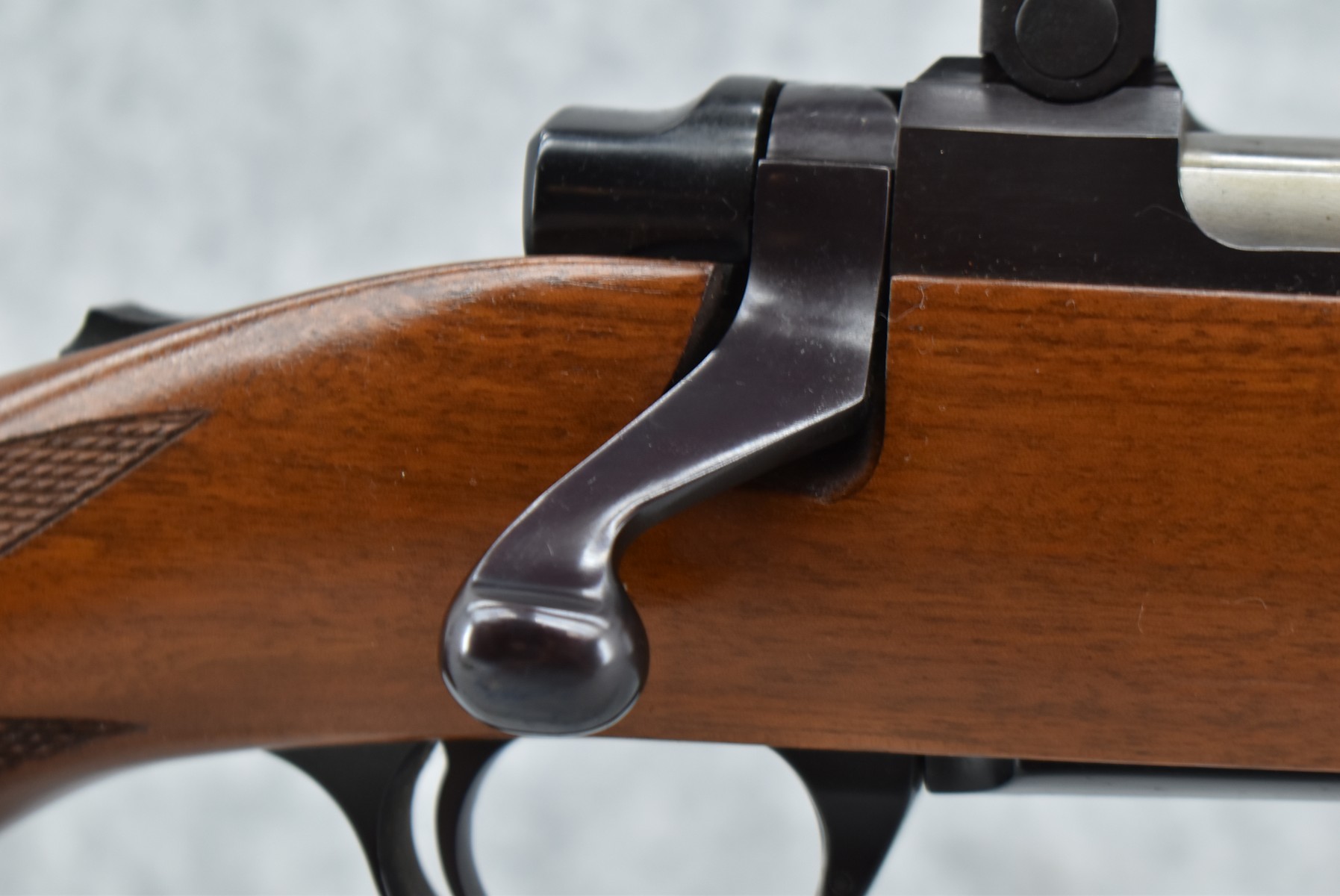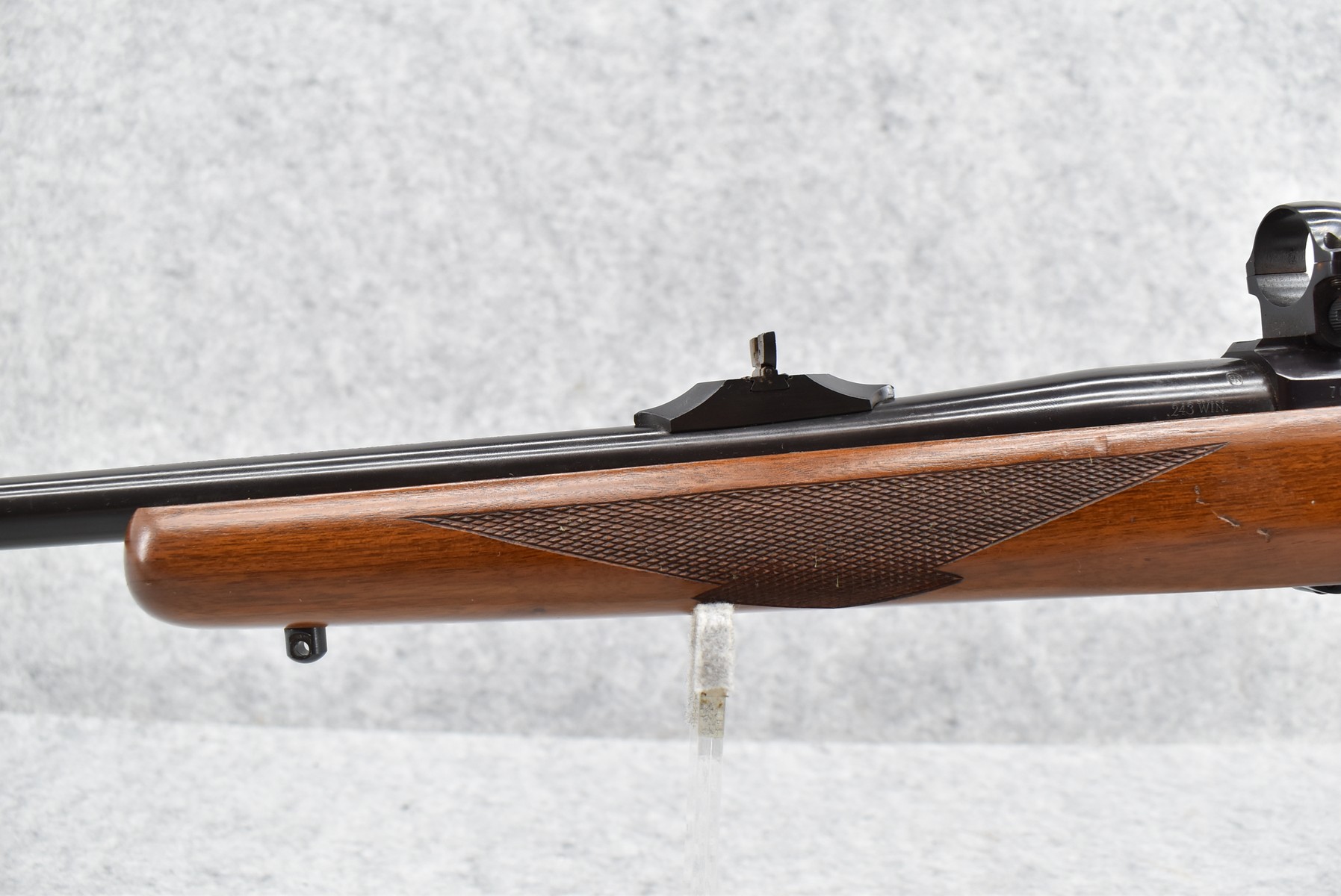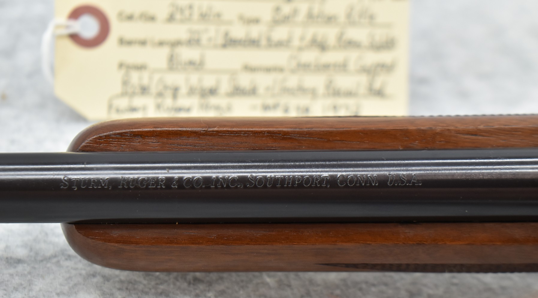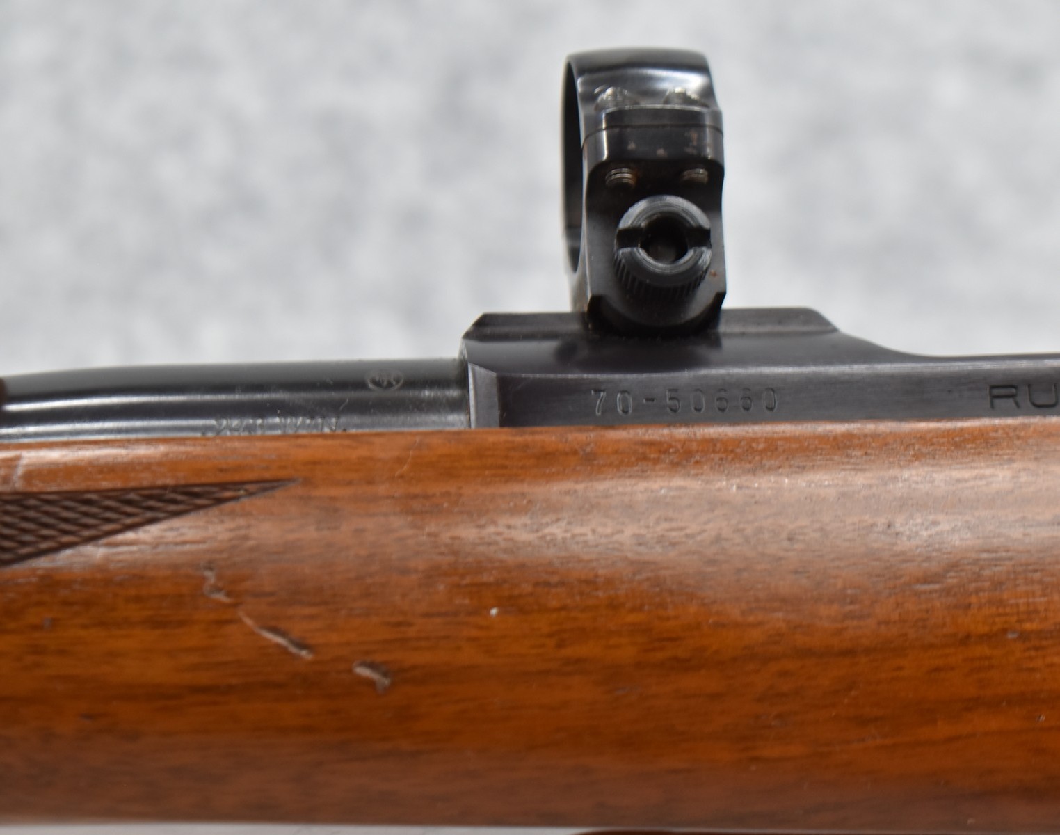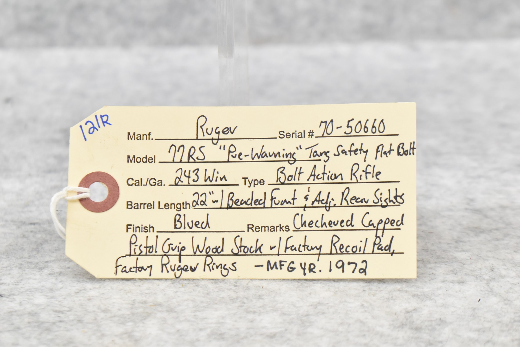 121R. Ruger – Mod. 77RS Tang Safety Flat Bolt (Pre-Warning) – 243 Win. Cal. Bolt Action Rifle – w/22” Barrel w/Bead Front & Adj. Rear Sights – Blued Finish – w/Checkered Capped Pistol Grip Wood Stock w/Factory Recoil Pad – w/Factory Rings – Mfg. 1972