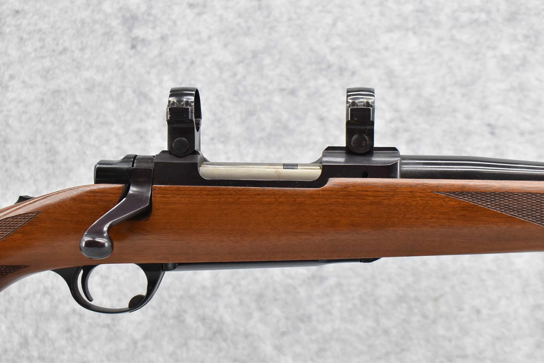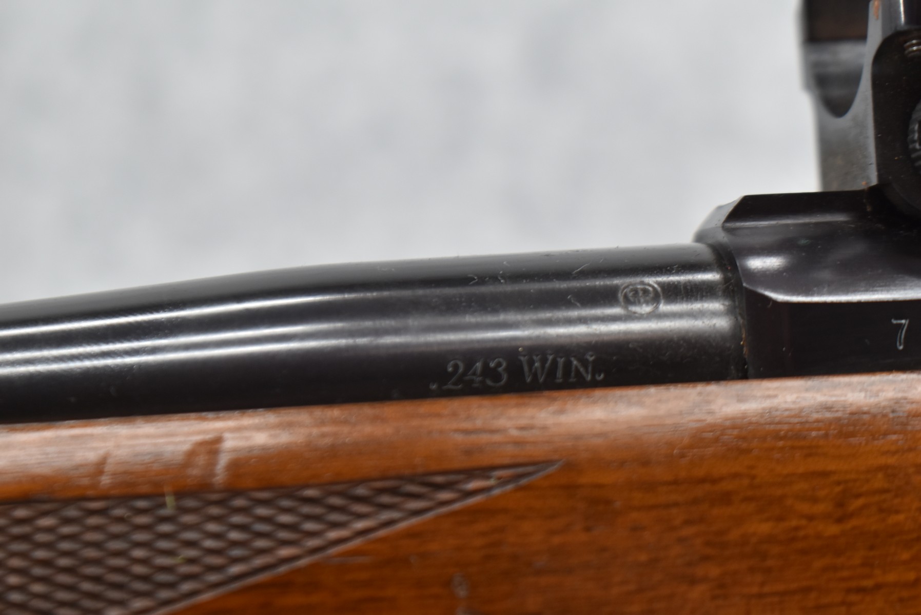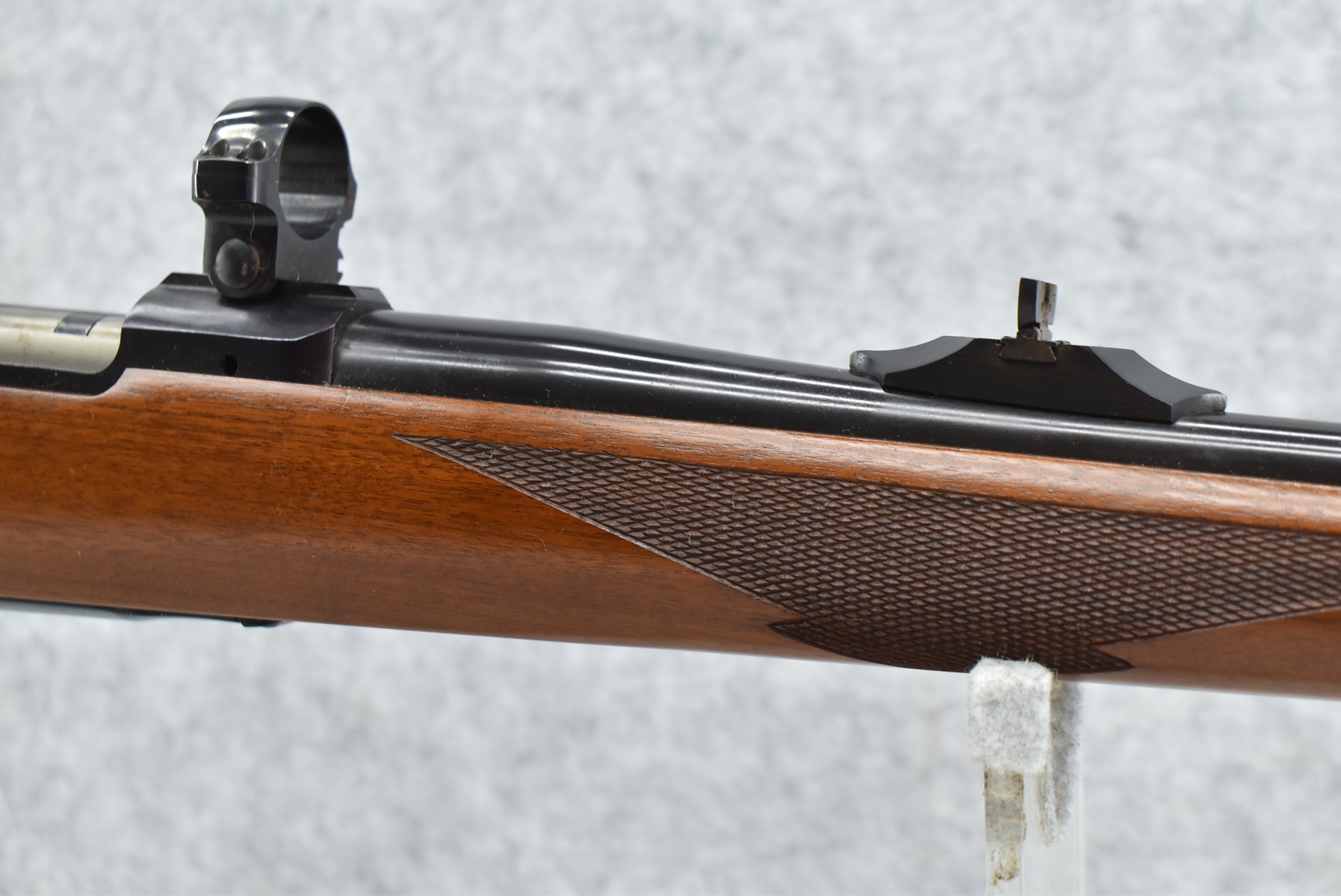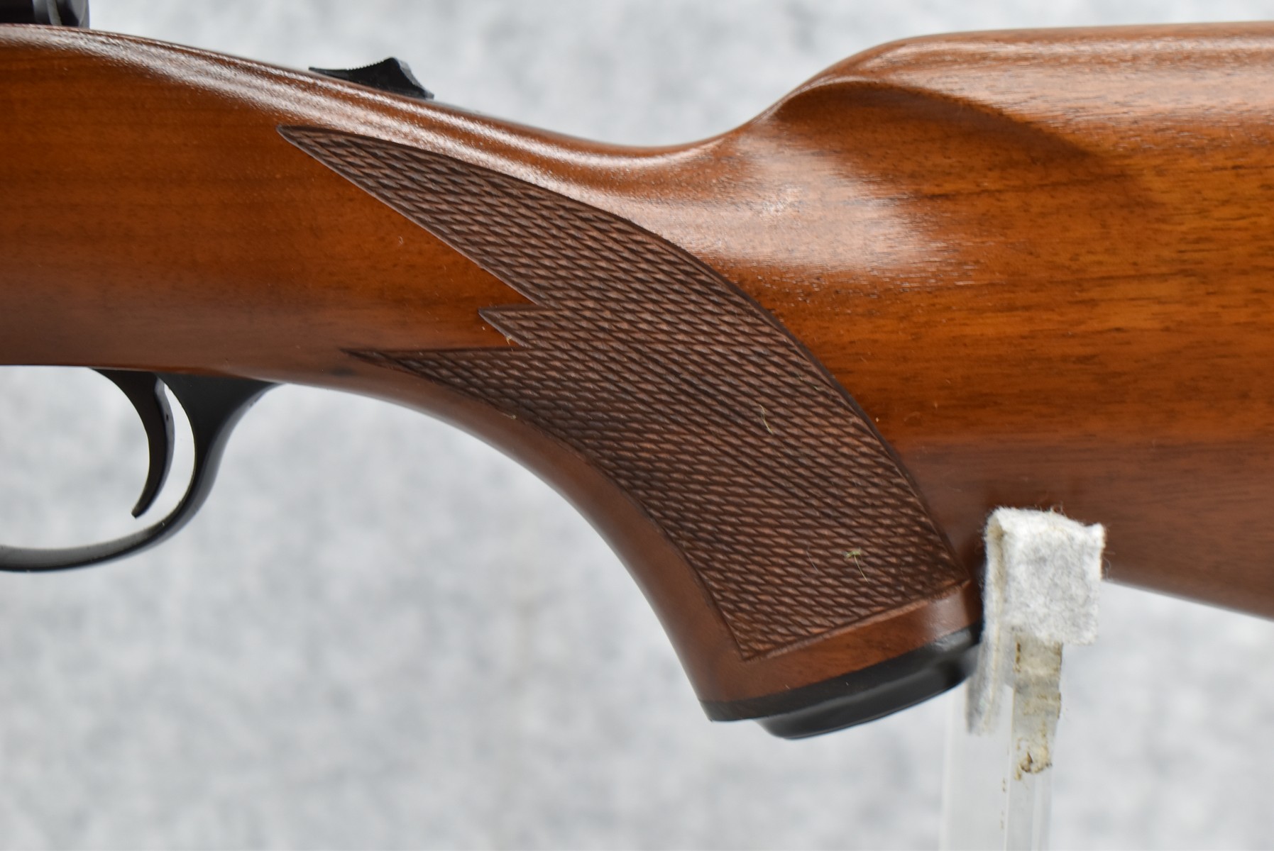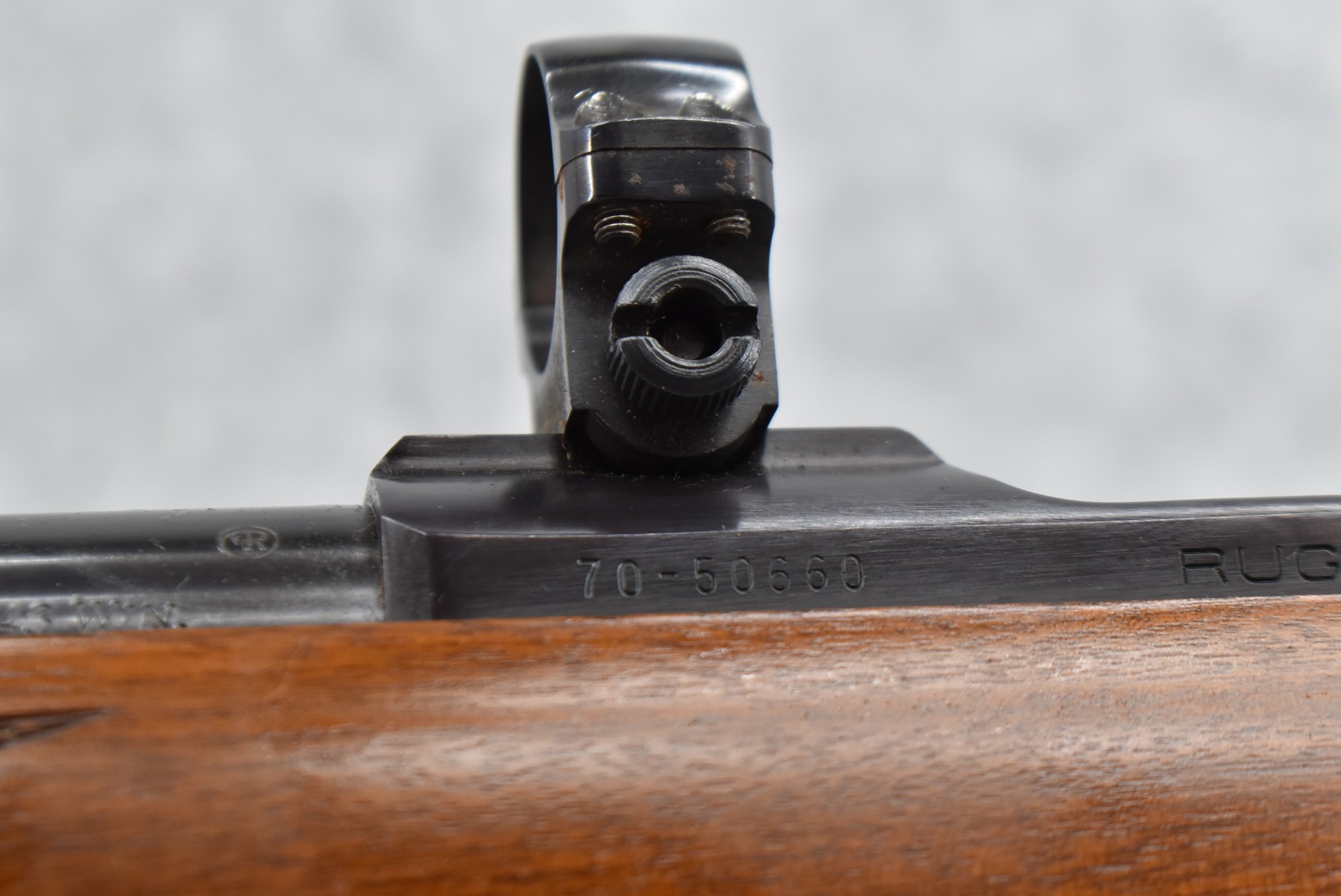 121R. Ruger – Mod. 77RS Tang Safety Flat Bolt (Pre-Warning) – 243 Win. Cal. Bolt Action Rifle – w/22” Barrel w/Bead Front & Adj. Rear Sights – Blued Finish – w/Checkered Capped Pistol Grip Wood Stock w/Factory Recoil Pad – w/Factory Rings – Mfg. 1972