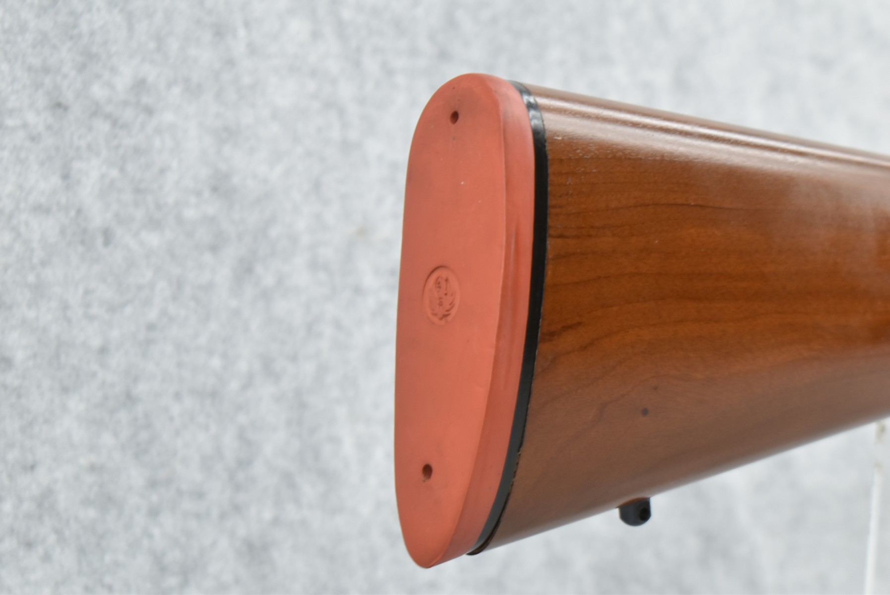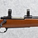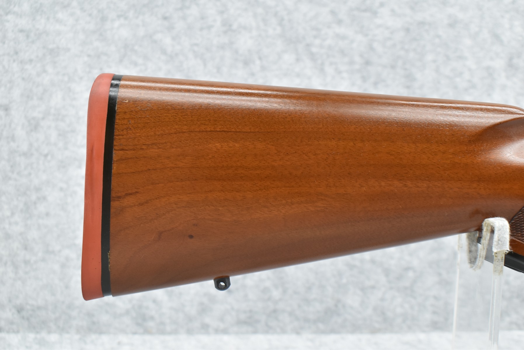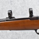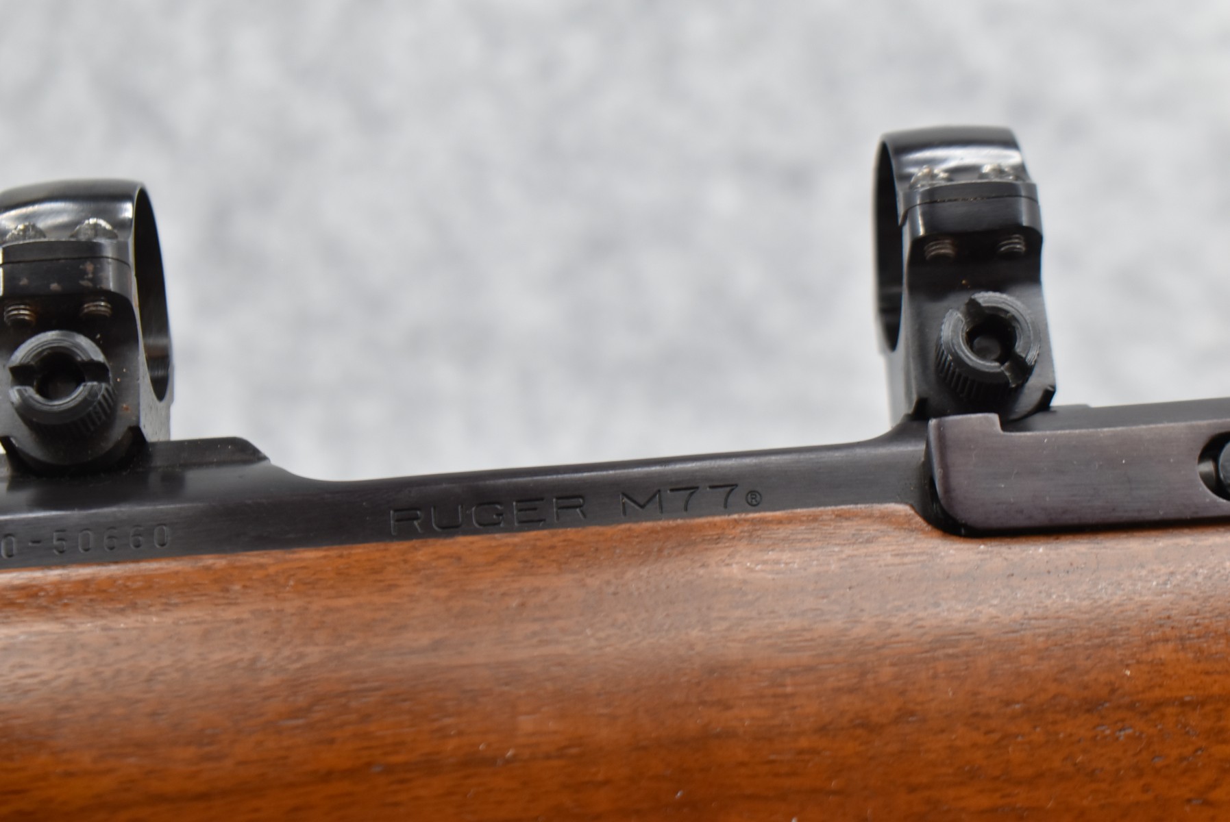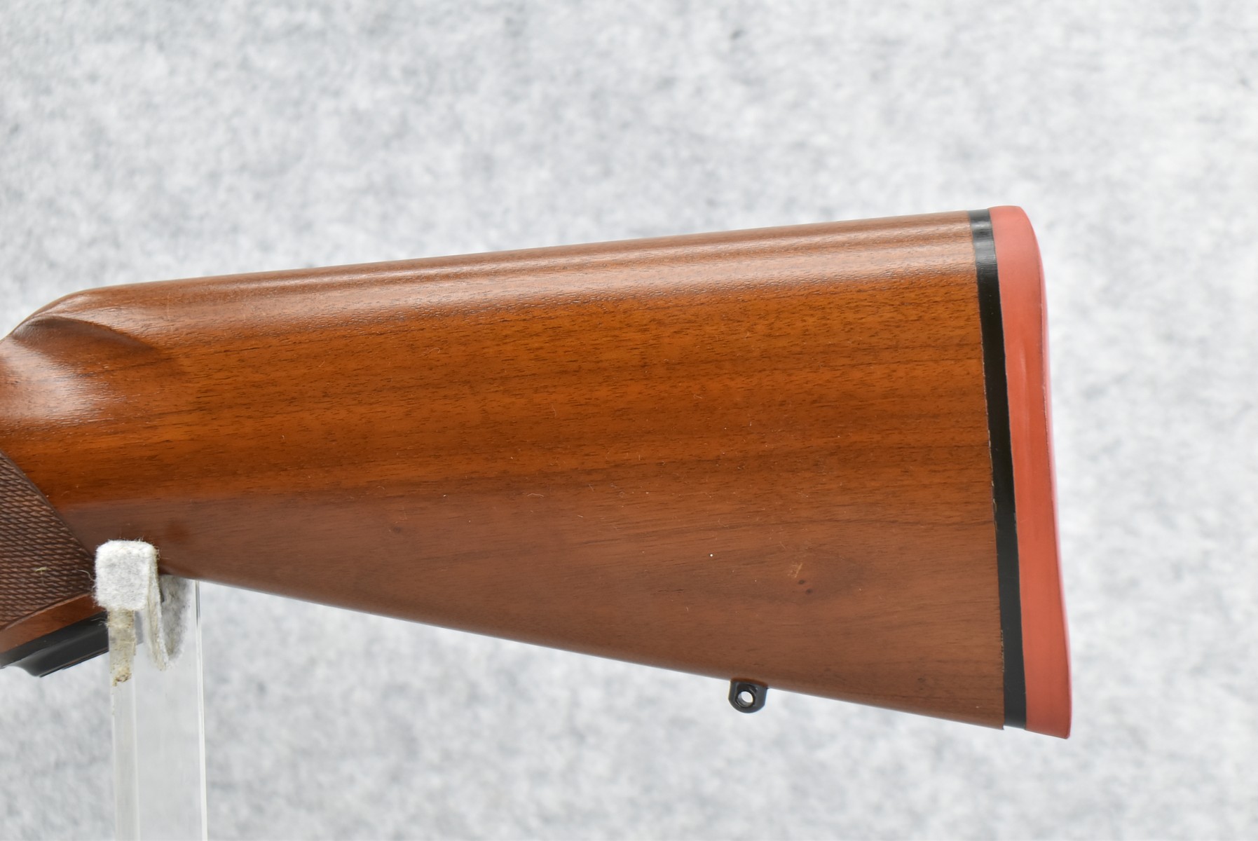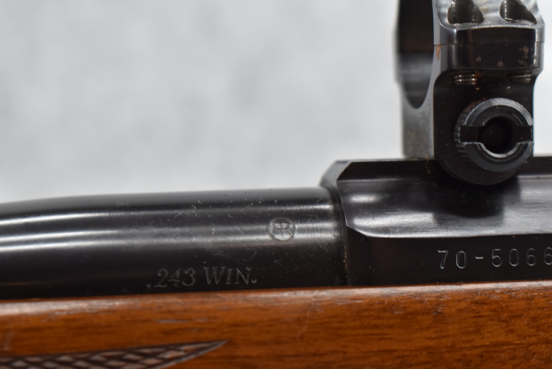 121R. Ruger – Mod. 77RS Tang Safety Flat Bolt (Pre-Warning) – 243 Win. Cal. Bolt Action Rifle – w/22” Barrel w/Bead Front & Adj. Rear Sights – Blued Finish – w/Checkered Capped Pistol Grip Wood Stock w/Factory Recoil Pad – w/Factory Rings – Mfg. 1972