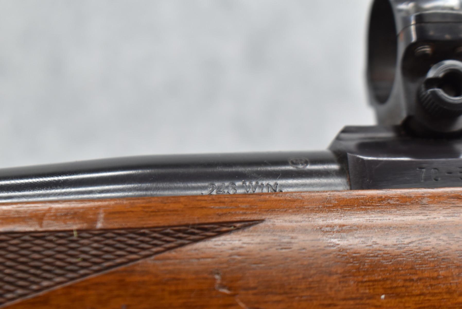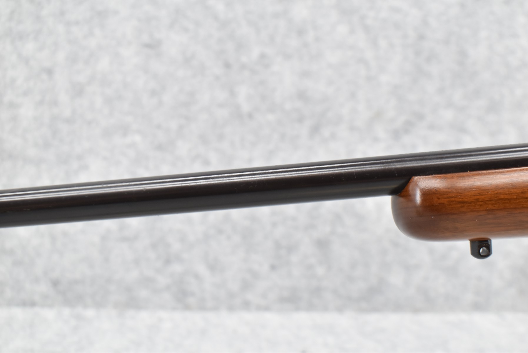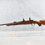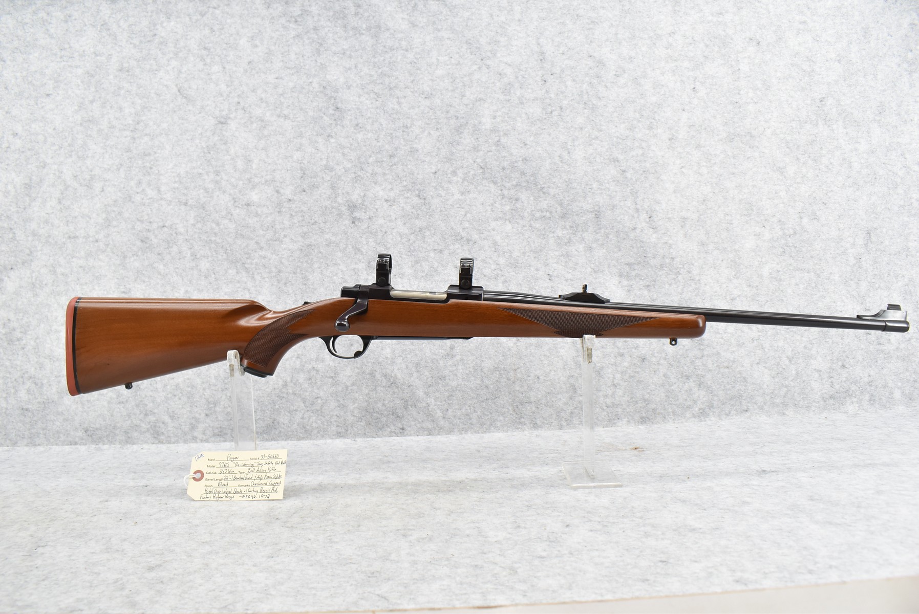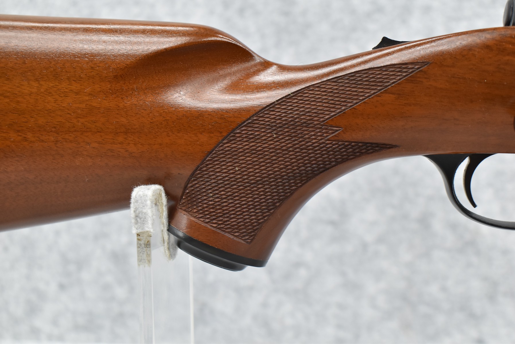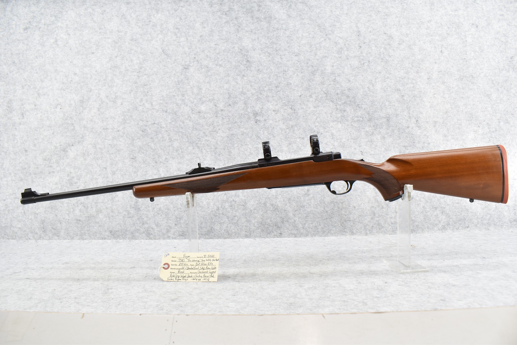 121R. Ruger – Mod. 77RS Tang Safety Flat Bolt (Pre-Warning) – 243 Win. Cal. Bolt Action Rifle – w/22” Barrel w/Bead Front & Adj. Rear Sights – Blued Finish – w/Checkered Capped Pistol Grip Wood Stock w/Factory Recoil Pad – w/Factory Rings – Mfg. 1972