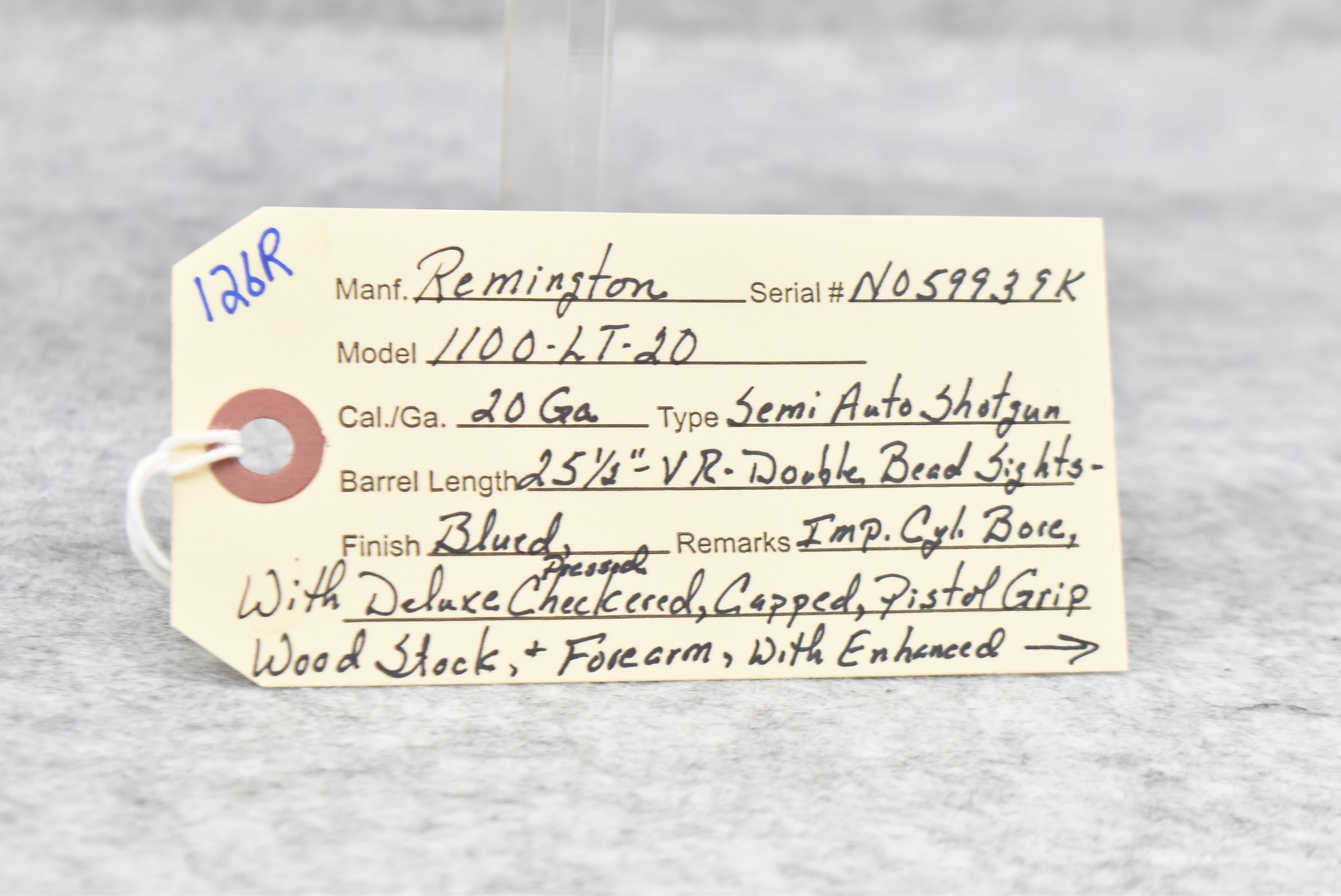 126R. Remington – Mod. 1100-LT-20 – 20ga. Semi-Auto Shotgun – w/25 ½” Imp. Cyl. Choked, Vent-Rib Barrel w/Double Bead Sights – Blued Finish – w/Deluxe Pressed Checkered Capped Pistol Grip Wood Stocks w/Factory Butt Plate