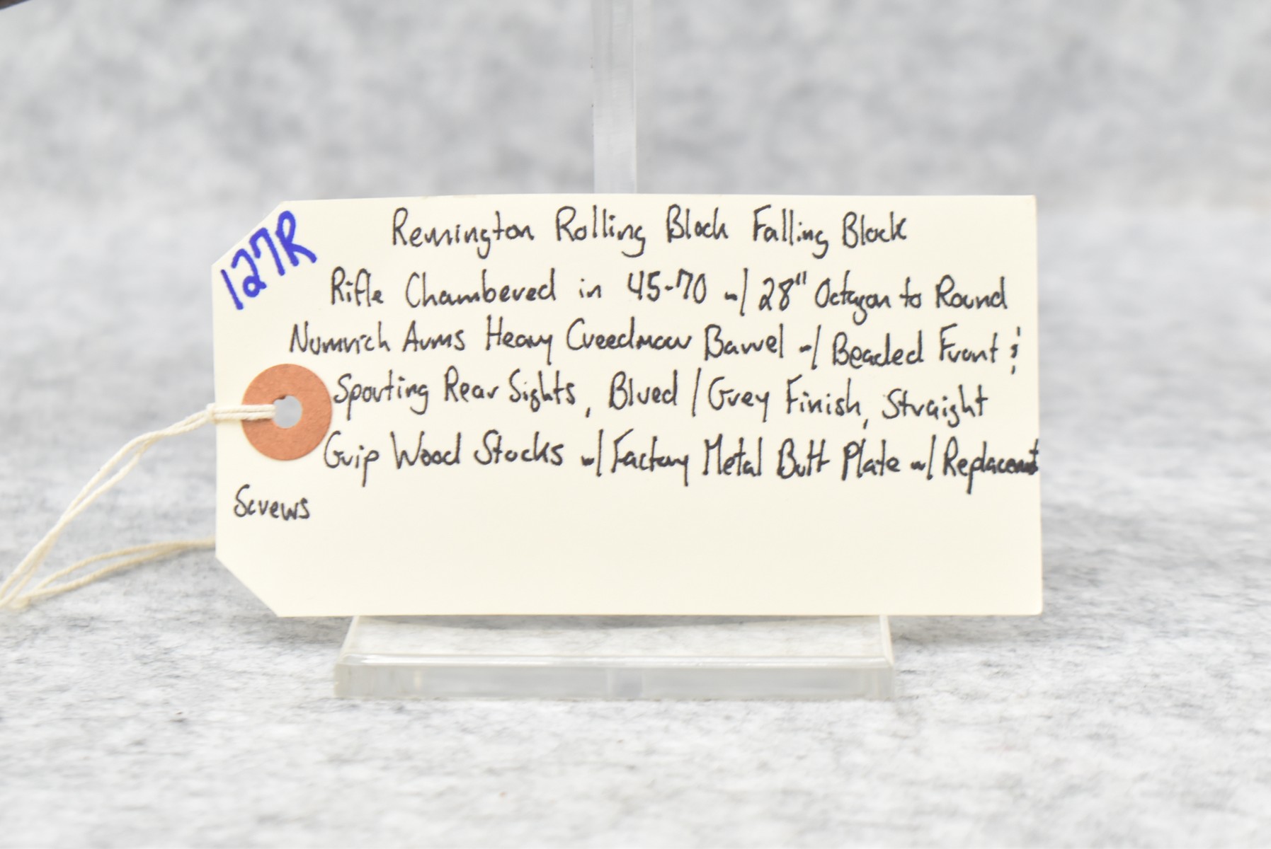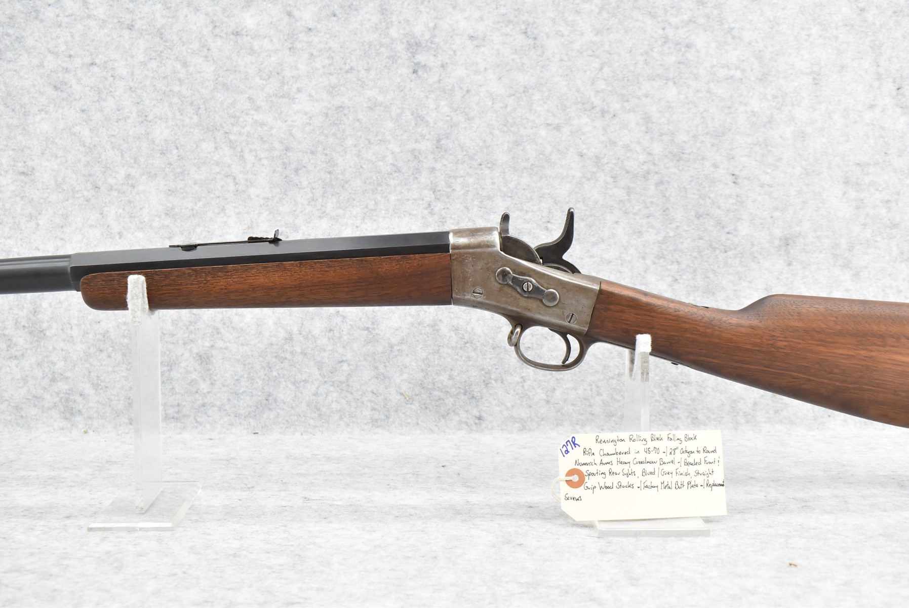 127R.     Remington – Mod. Rolling Block Falling Block Rifle – Chambered in 45-70 Cal. – w/28” Octagon to Round Numrich Arms Heavy Creedmoor Barrel w/Beaded Front & Sporting Rear Sights – Blued/Gray Finish – w/Straight Grip Wood Stocks w/Factory Metal Butt Plate
