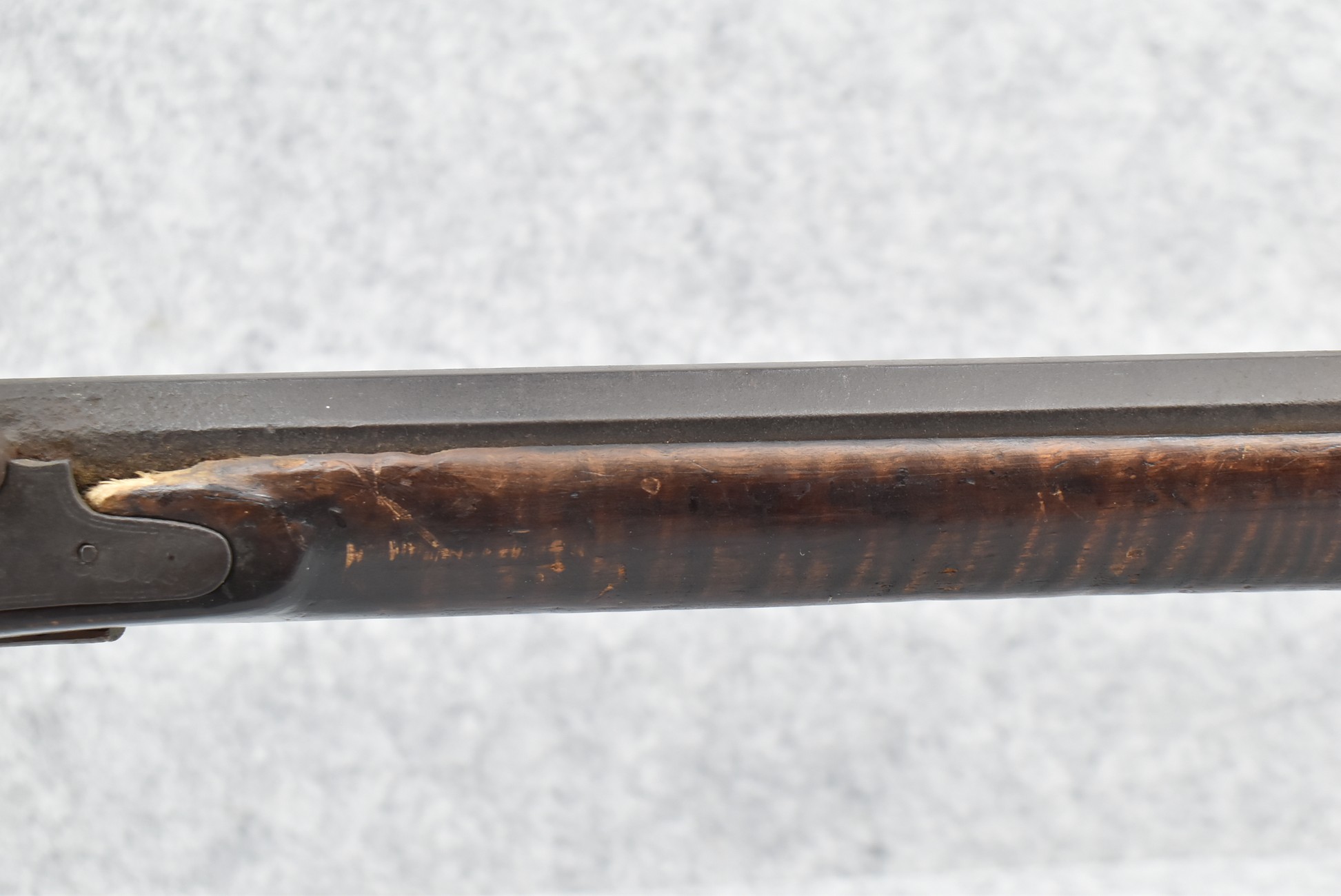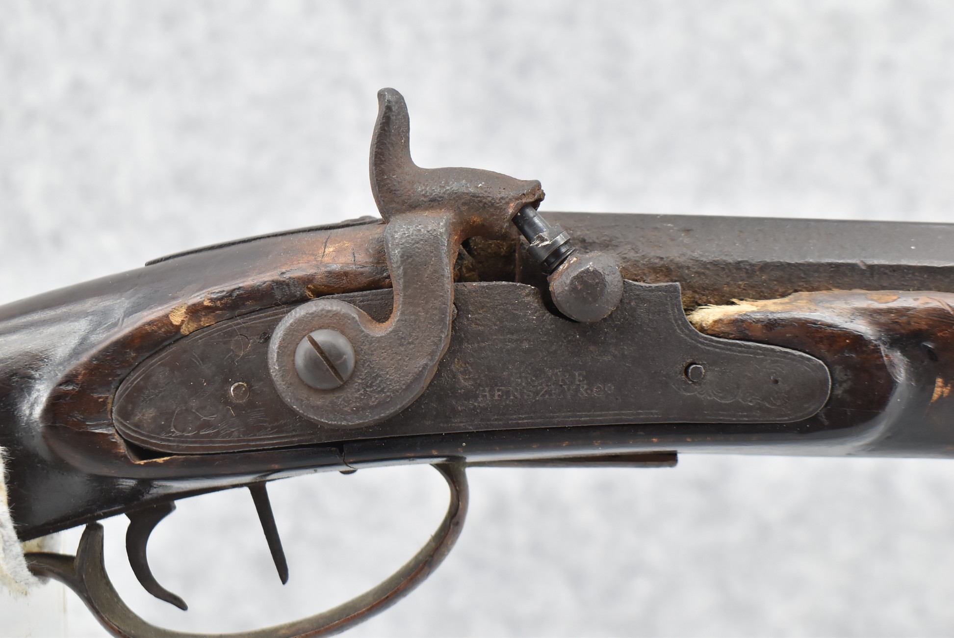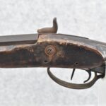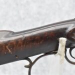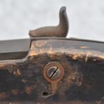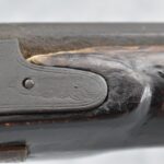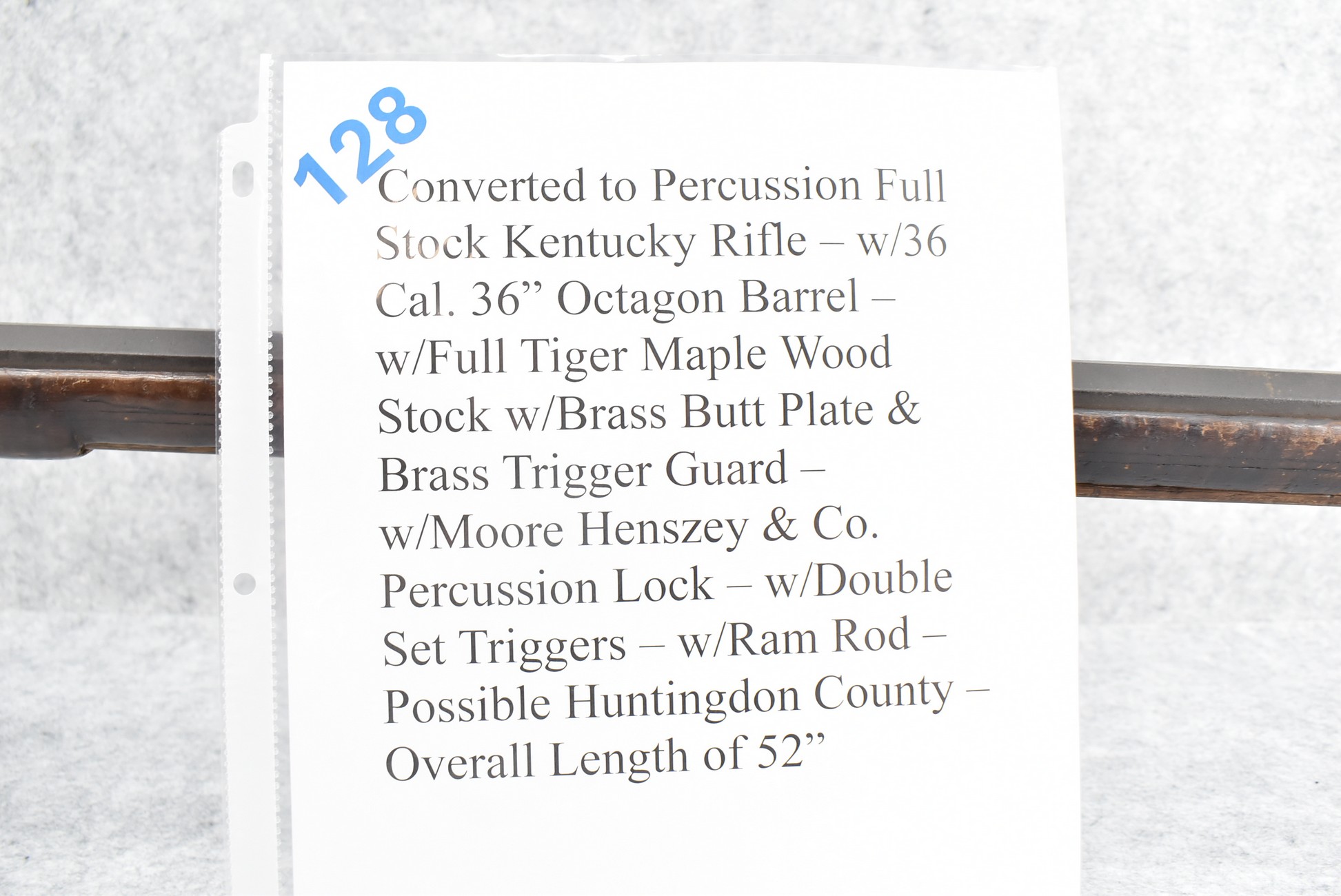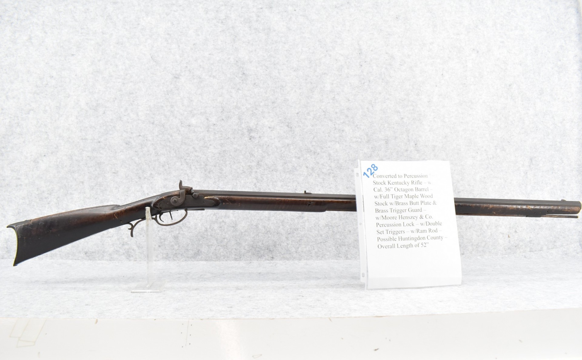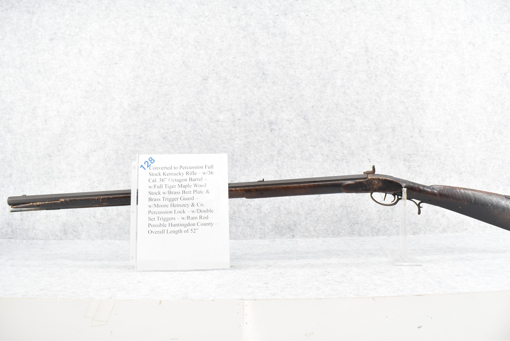 128. Converted to Percussion Full Stock Kentucky Rifle – w/36 Cal. 36” Octagon Barrel – w/Full Tiger Maple Wood Stock w/Brass Butt Plate & Brass Trigger Guard – w/Moore Henszey & Co. Percussion Lock – w/Double Set Triggers – w/Ram Rod – Possible Huntingdon County – Overall Length of 52”