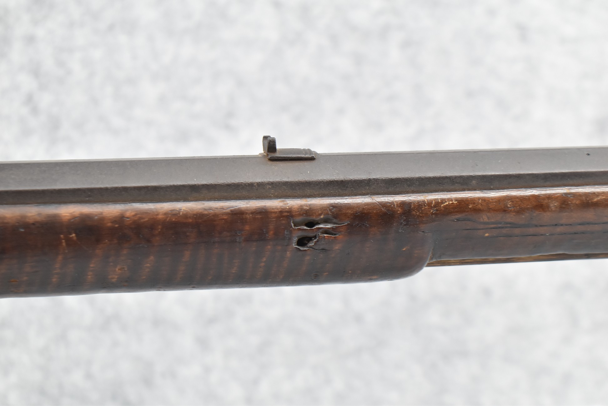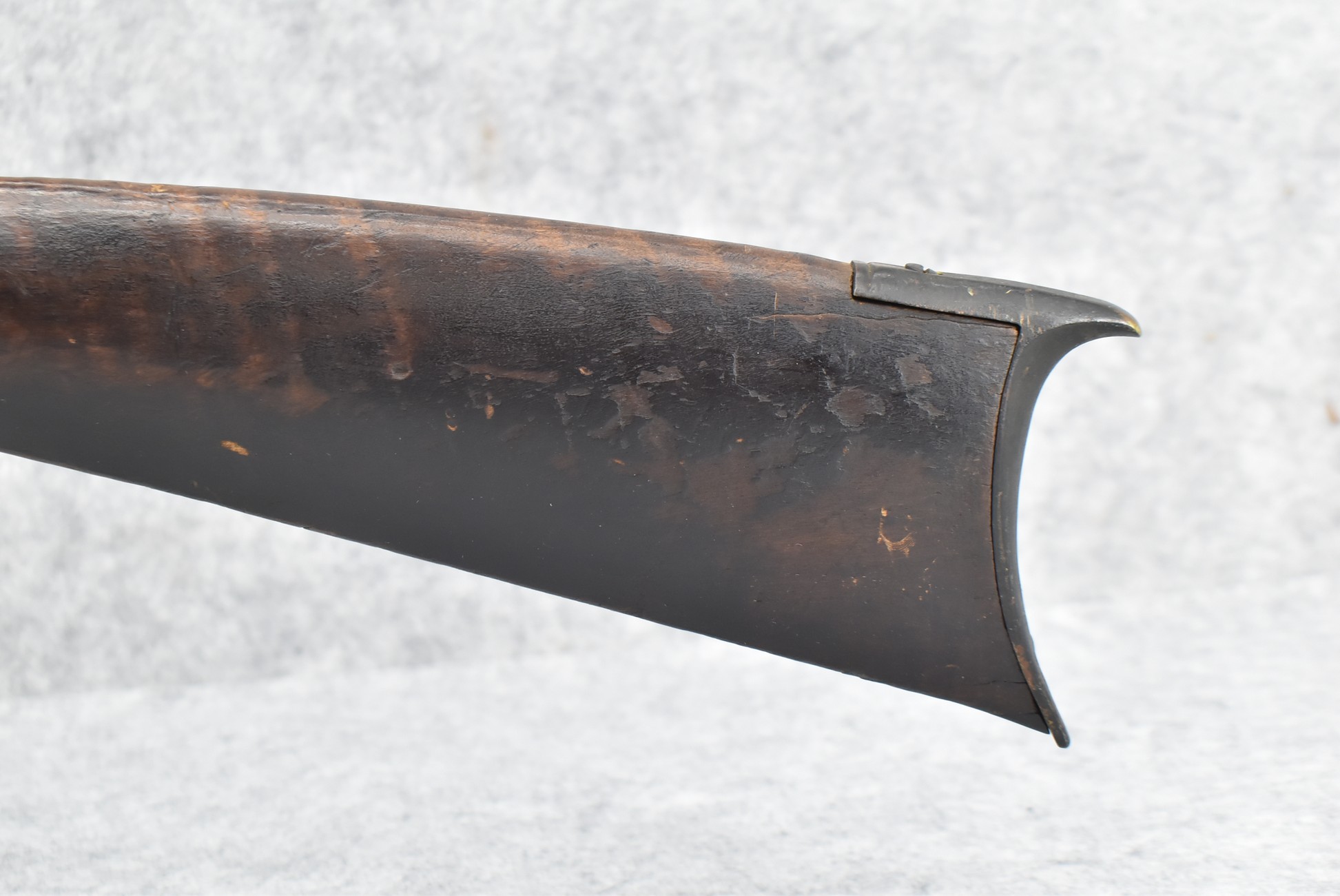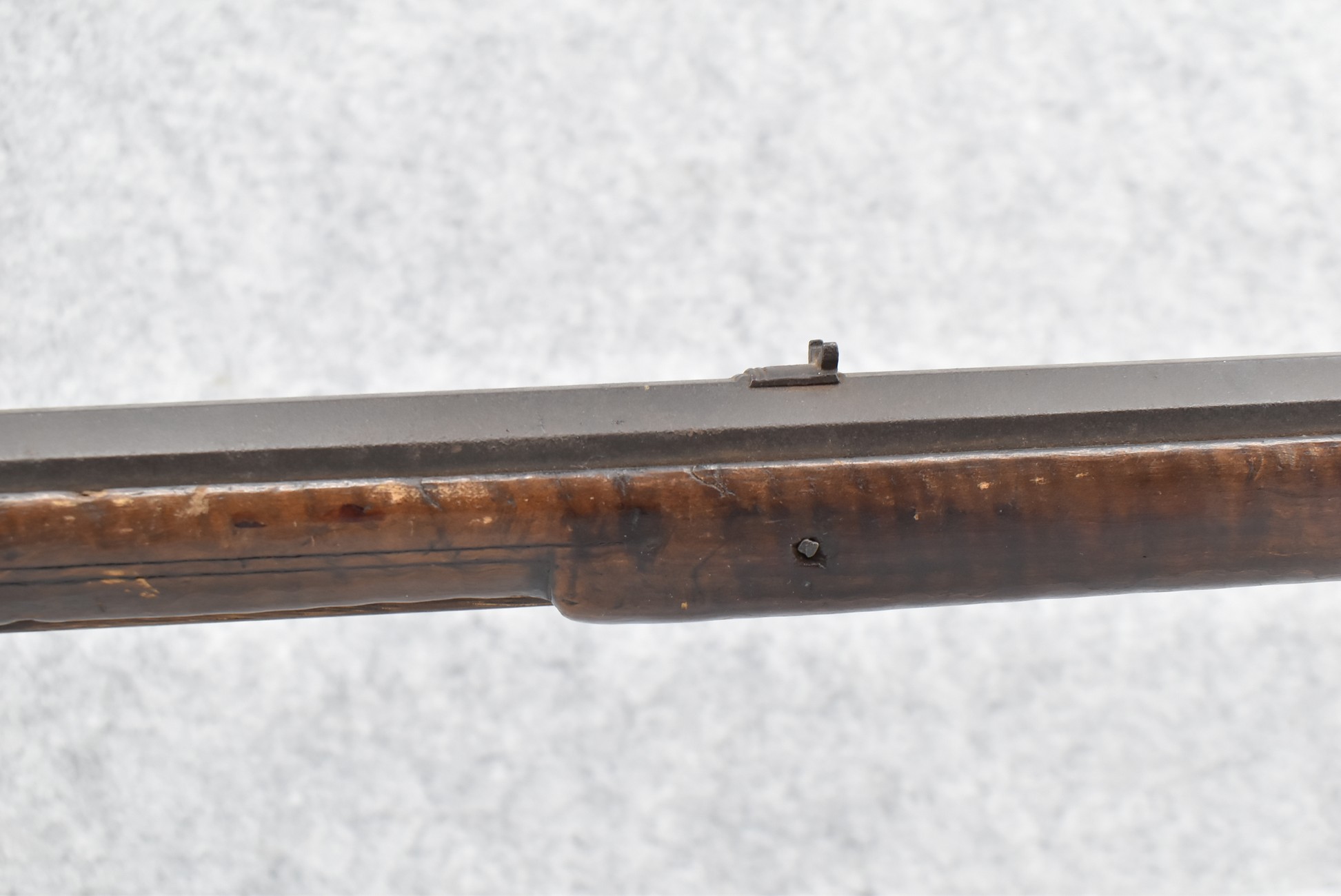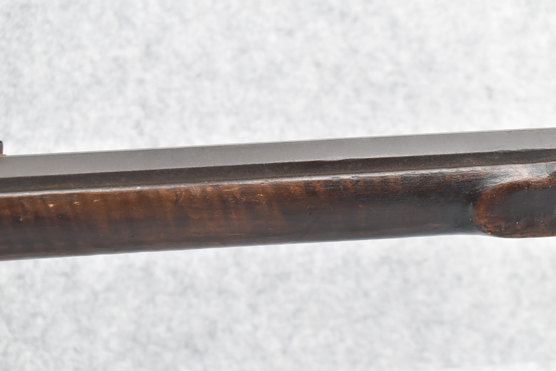 128. Converted to Percussion Full Stock Kentucky Rifle – w/36 Cal. 36” Octagon Barrel – w/Full Tiger Maple Wood Stock w/Brass Butt Plate & Brass Trigger Guard – w/Moore Henszey & Co. Percussion Lock – w/Double Set Triggers – w/Ram Rod – Possible Huntingdon County – Overall Length of 52”