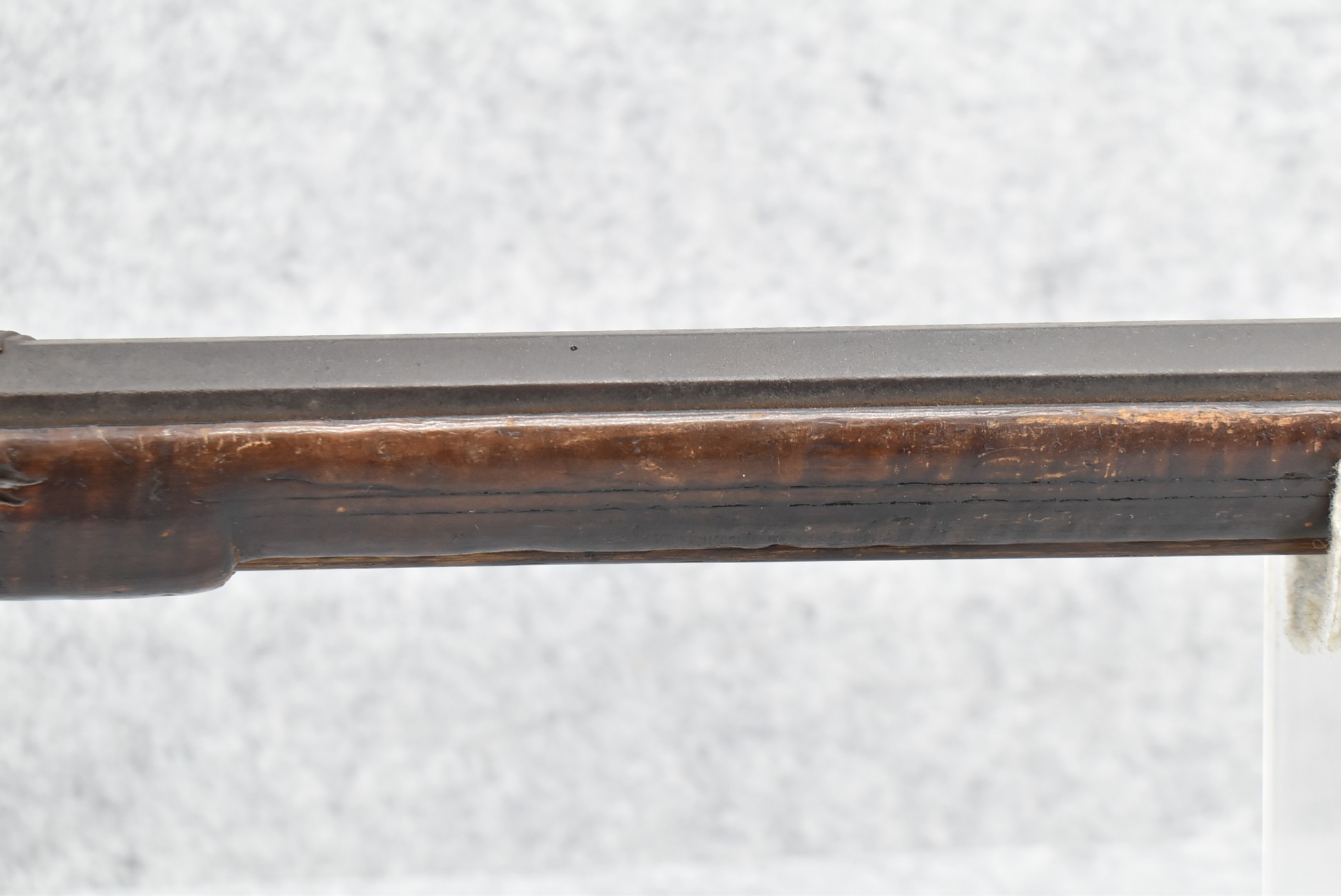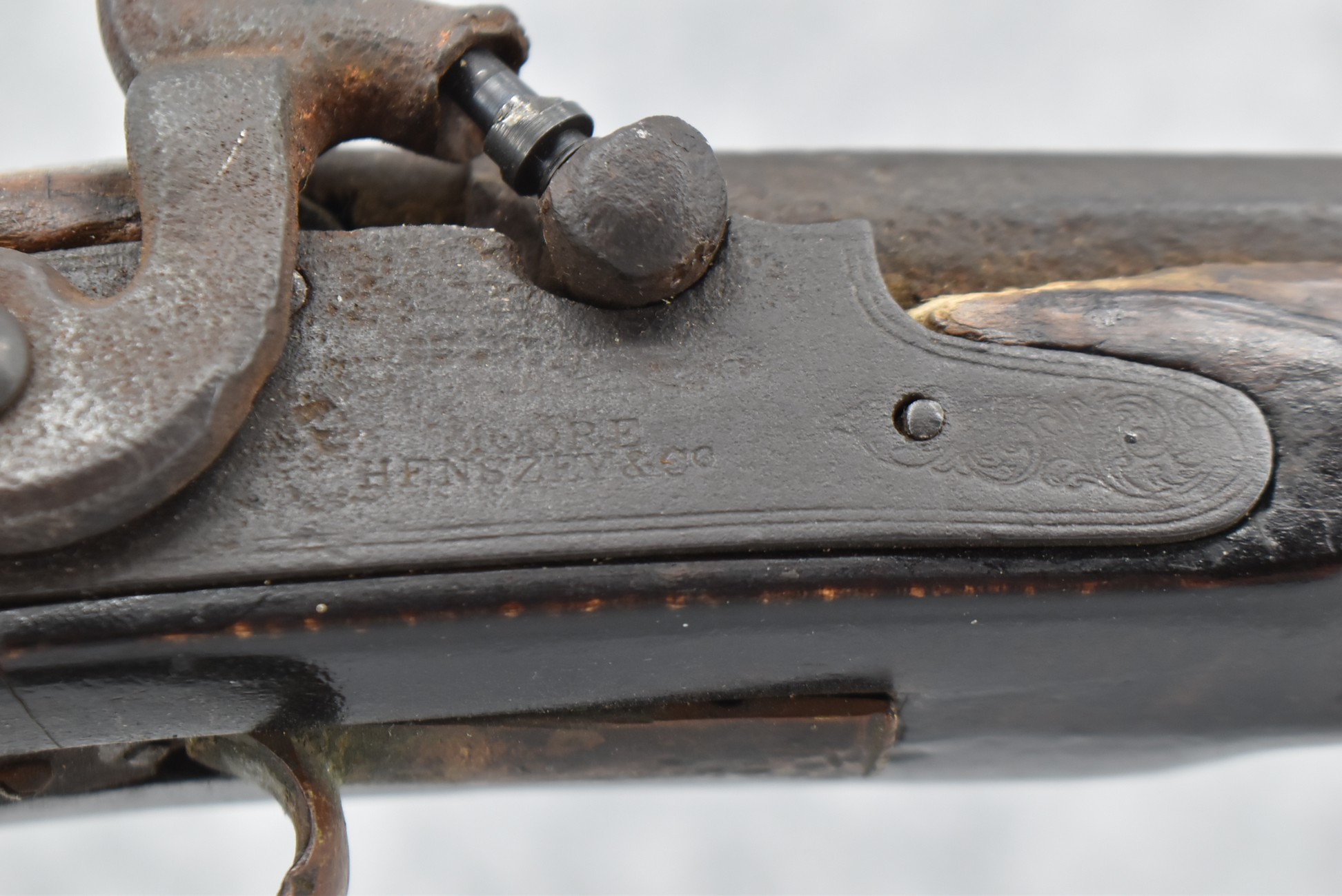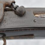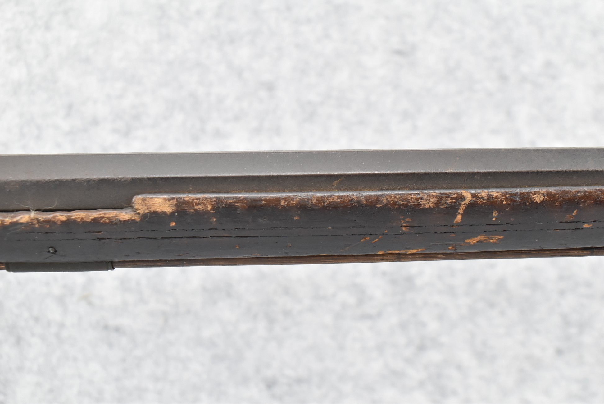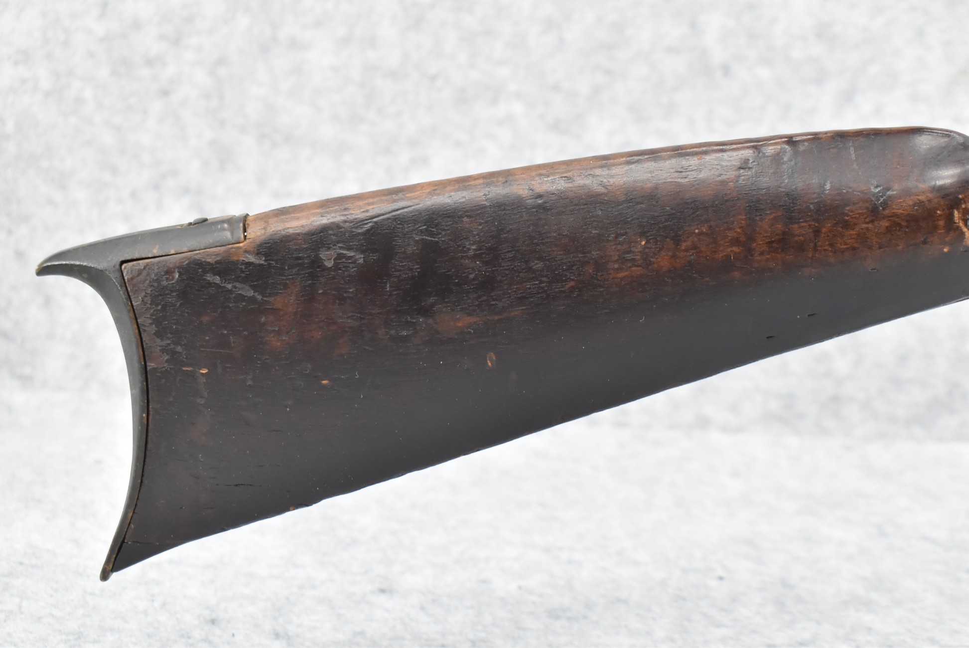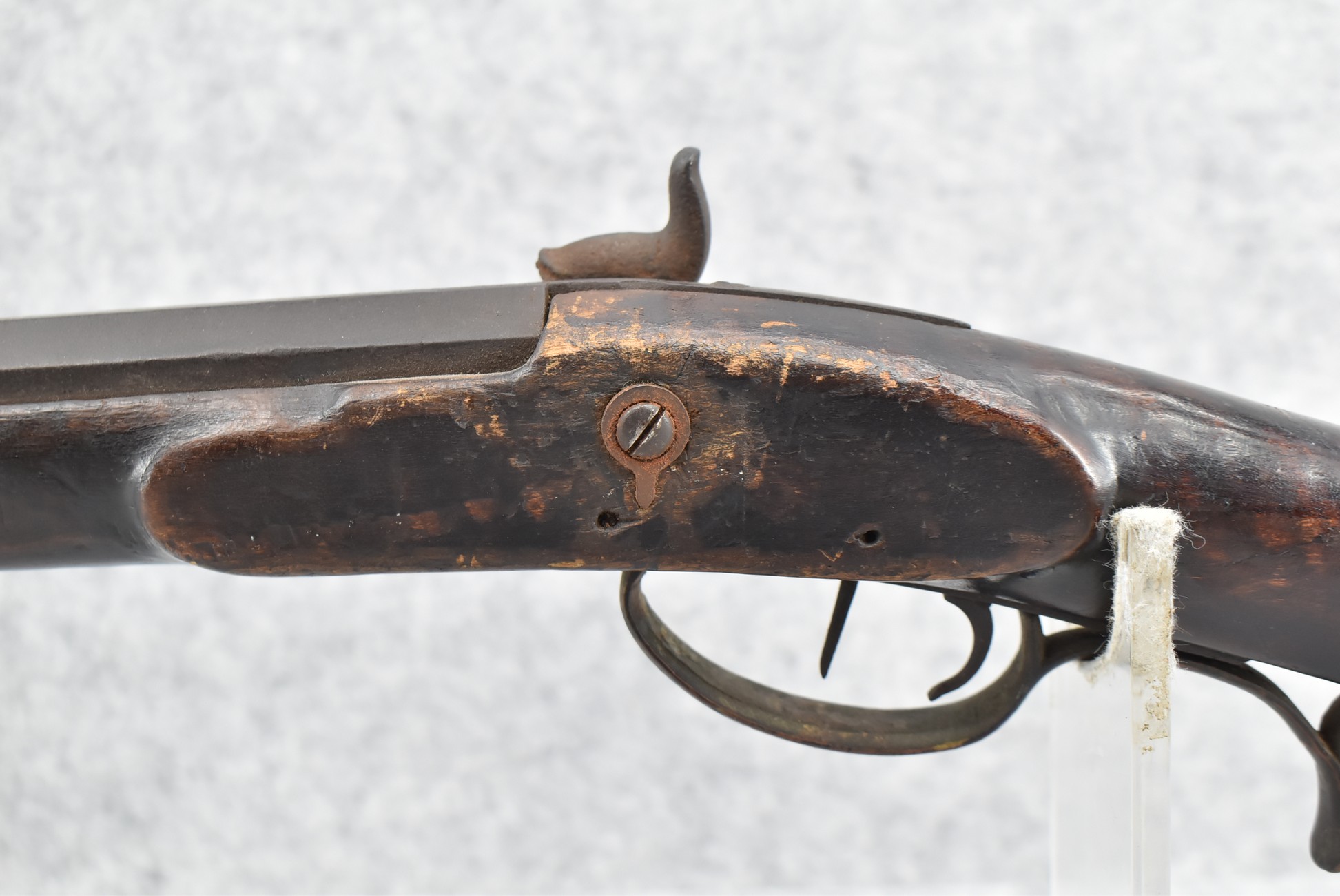 128. Converted to Percussion Full Stock Kentucky Rifle – w/36 Cal. 36” Octagon Barrel – w/Full Tiger Maple Wood Stock w/Brass Butt Plate & Brass Trigger Guard – w/Moore Henszey & Co. Percussion Lock – w/Double Set Triggers – w/Ram Rod – Possible Huntingdon County – Overall Length of 52”
