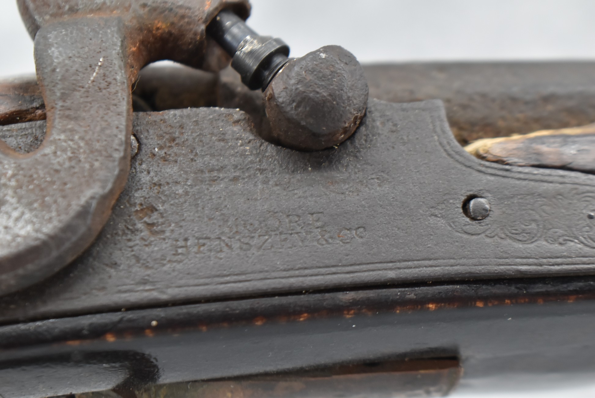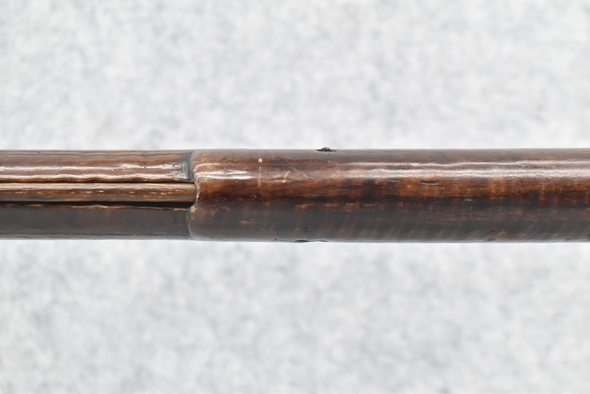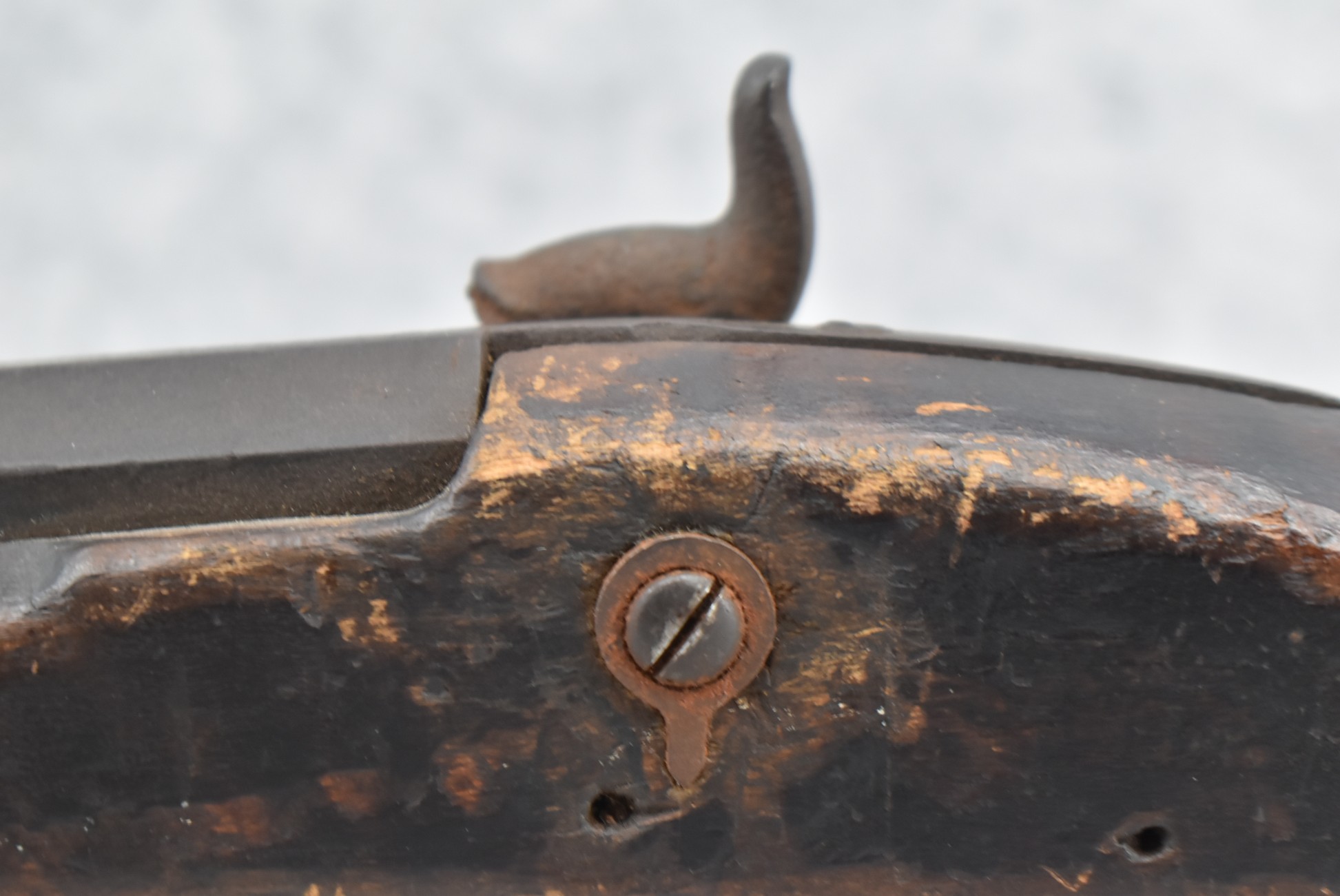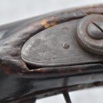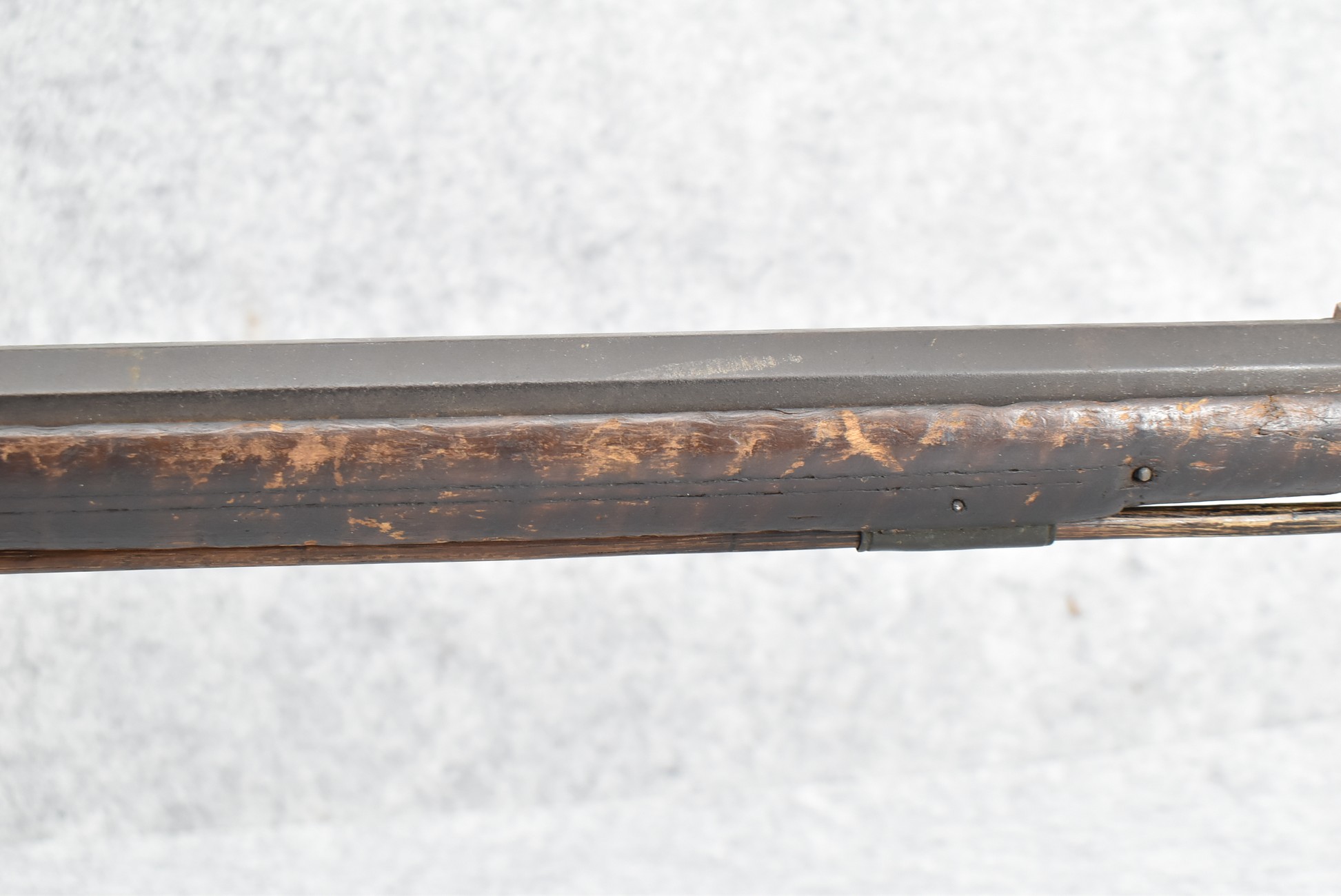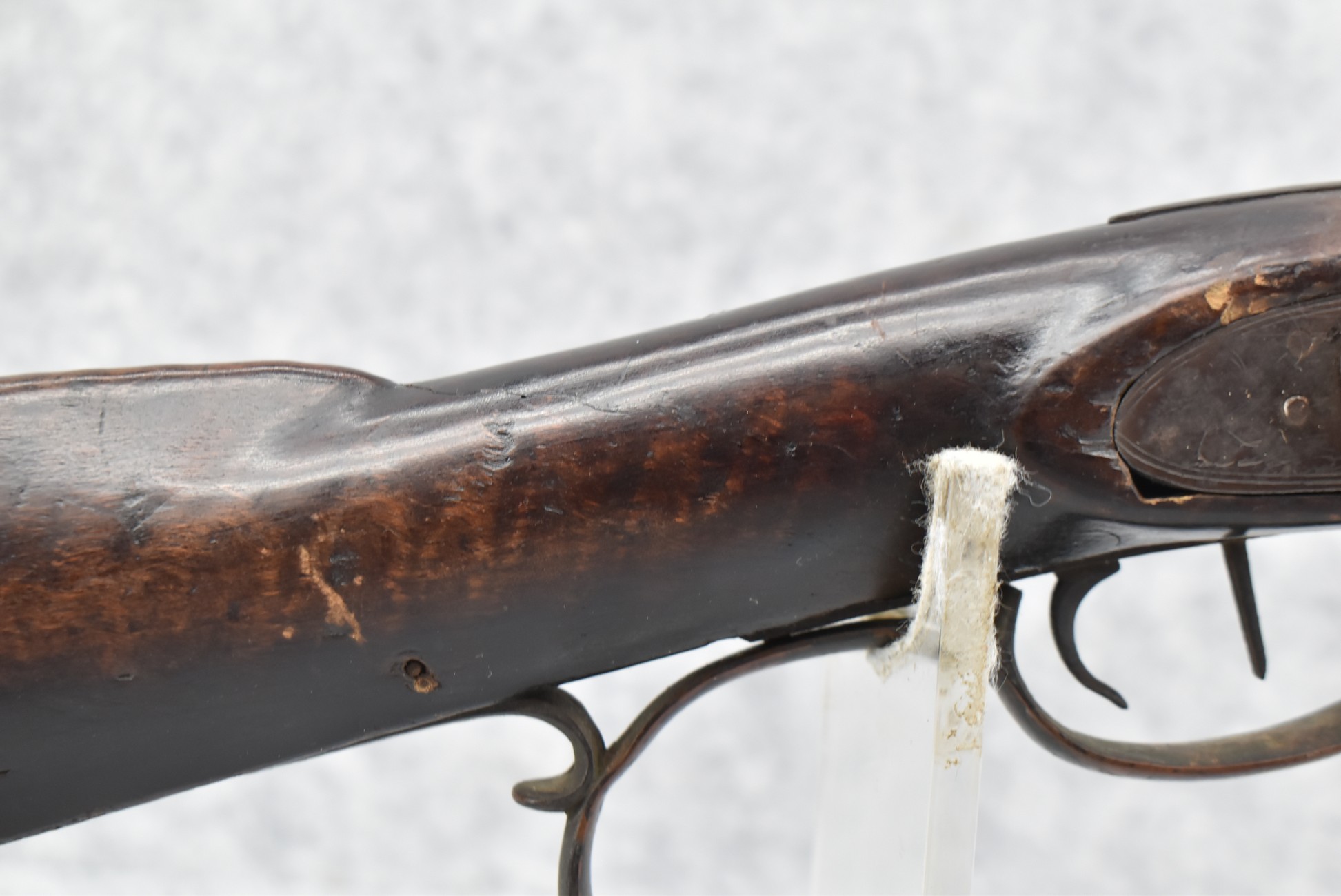 128. Converted to Percussion Full Stock Kentucky Rifle – w/36 Cal. 36” Octagon Barrel – w/Full Tiger Maple Wood Stock w/Brass Butt Plate & Brass Trigger Guard – w/Moore Henszey & Co. Percussion Lock – w/Double Set Triggers – w/Ram Rod – Possible Huntingdon County – Overall Length of 52”